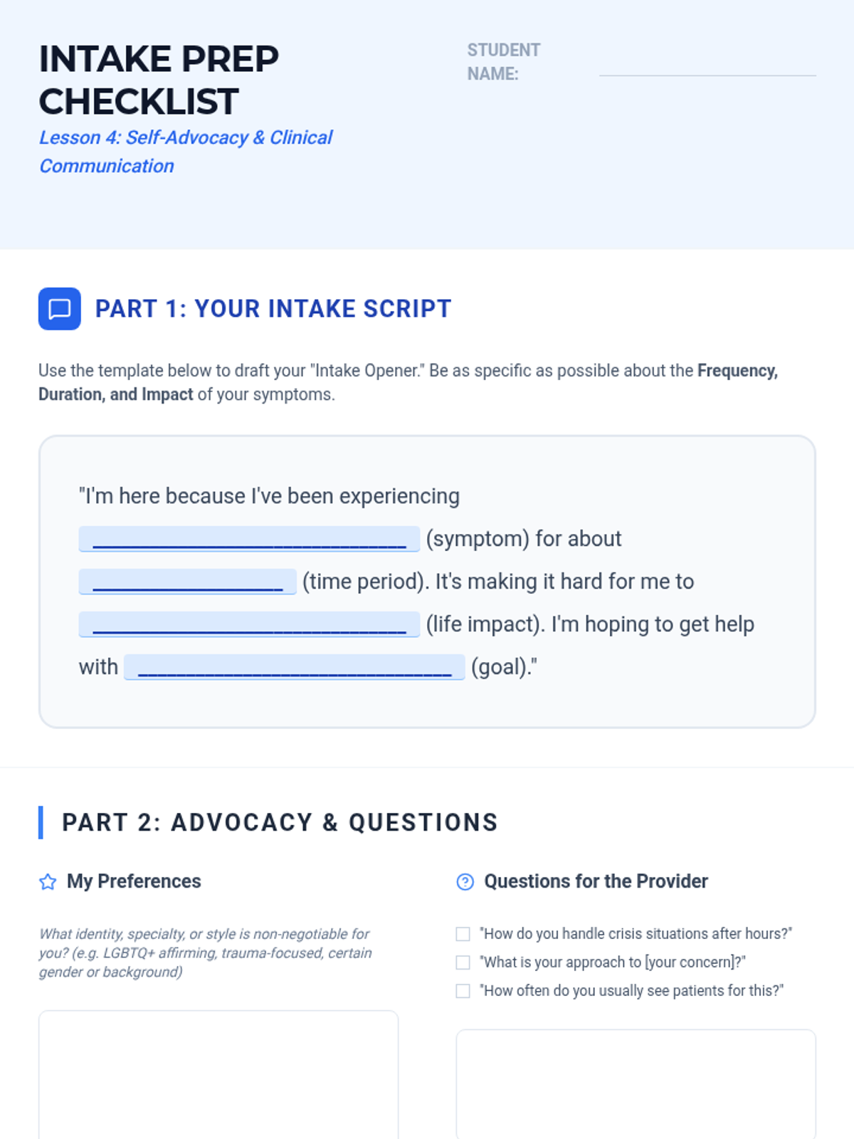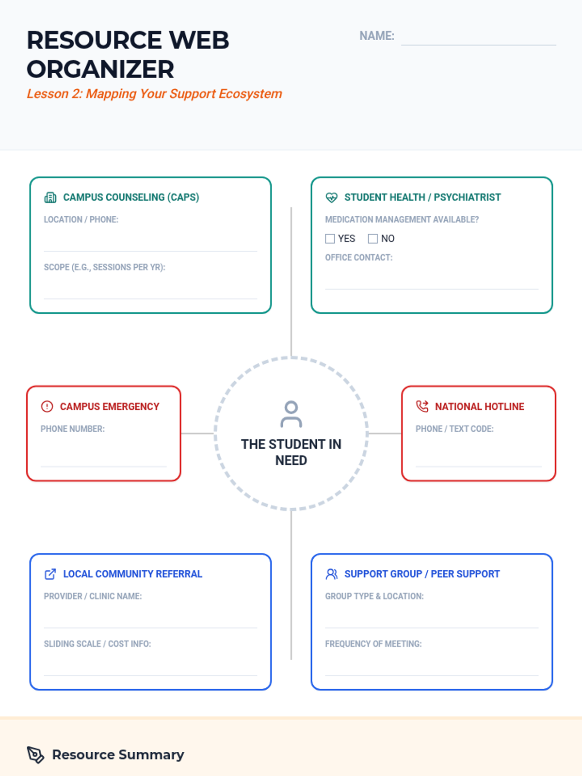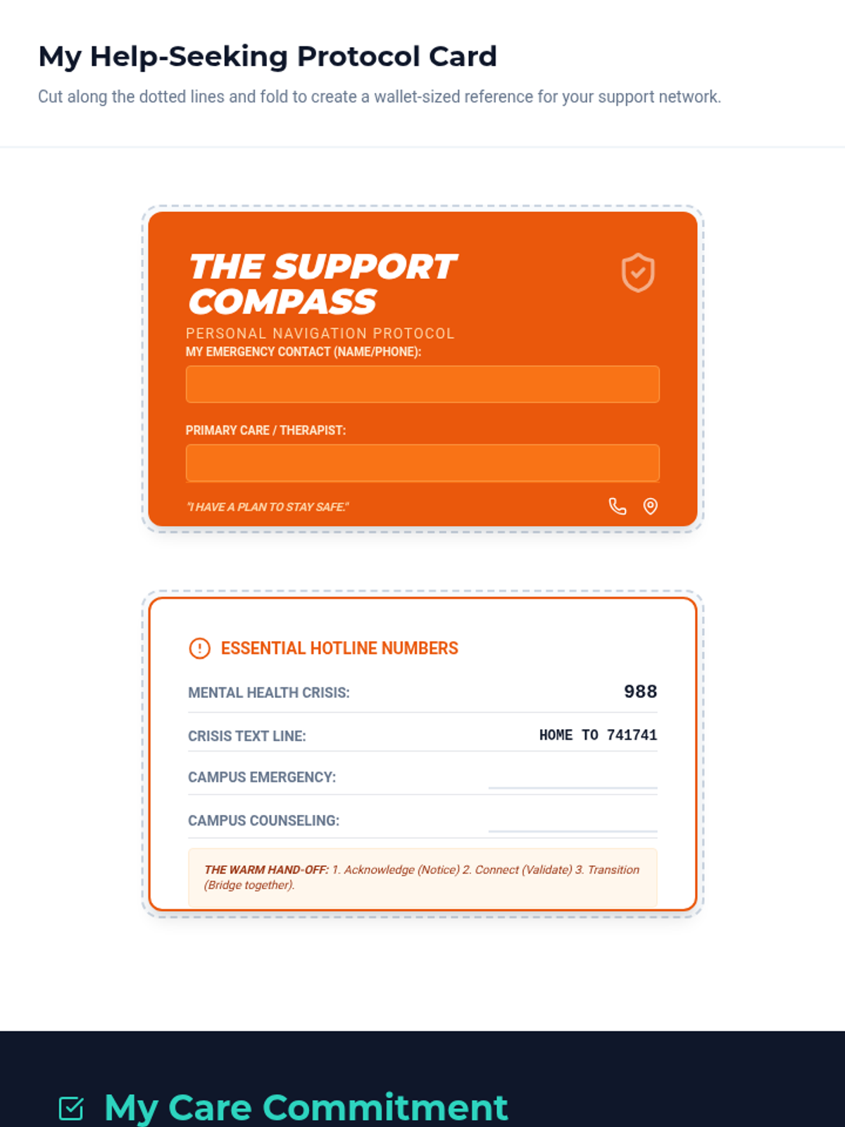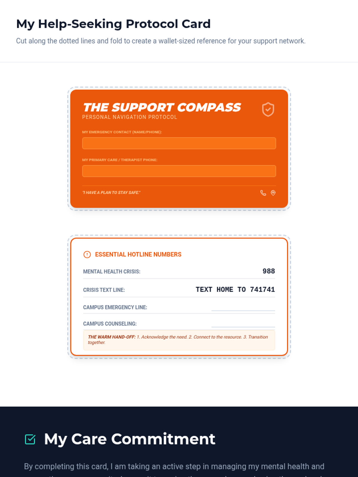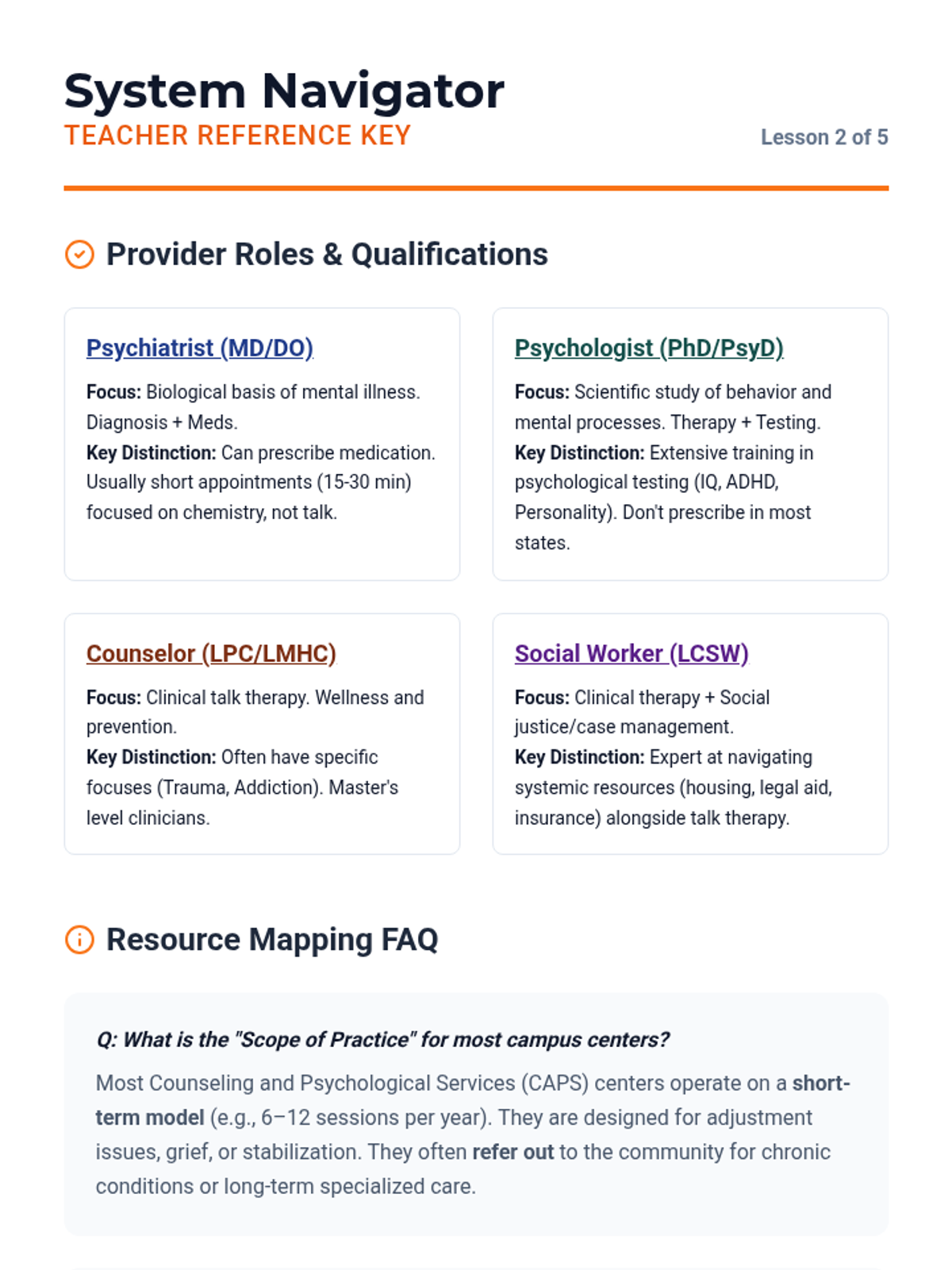 A comprehensive sequence for undergraduate students to navigate the complexities of mental health care, focusing on overcoming internal and systemic barriers, resource mapping, insurance literacy, and effective communication with health professionals.