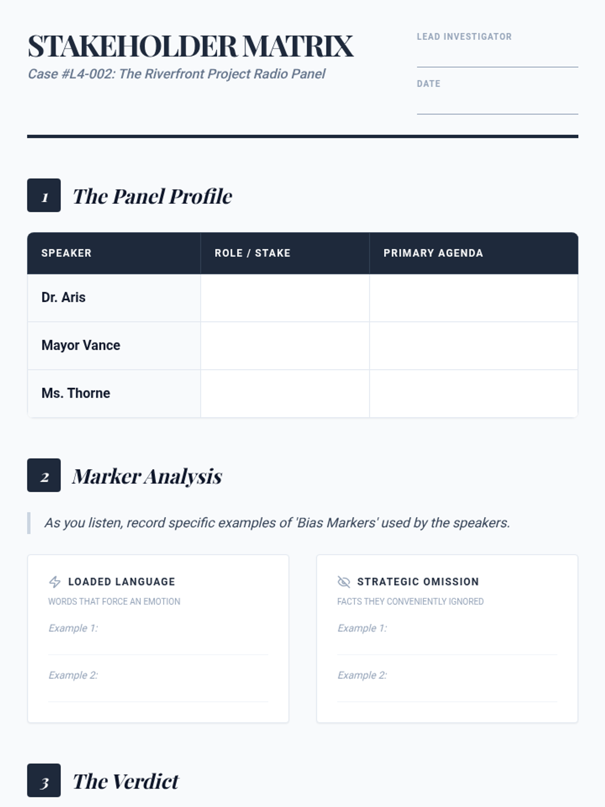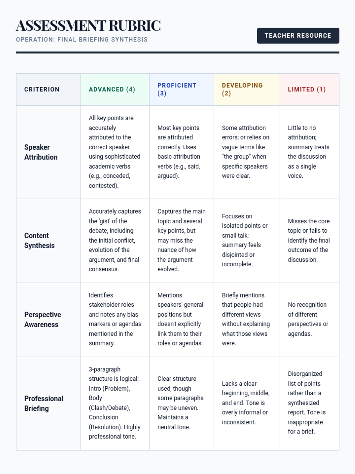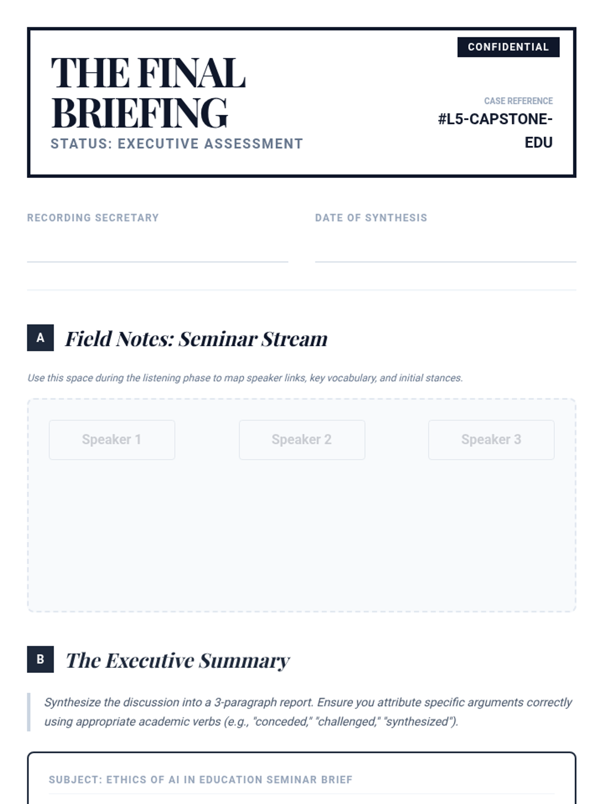 This sequence equips intermediate ESL undergraduate students with the skills to navigate complex, multi-speaker environments like seminars and debates. Students progress from basic speaker identification to tracking complex argument evolution and detecting subtle bias markers.