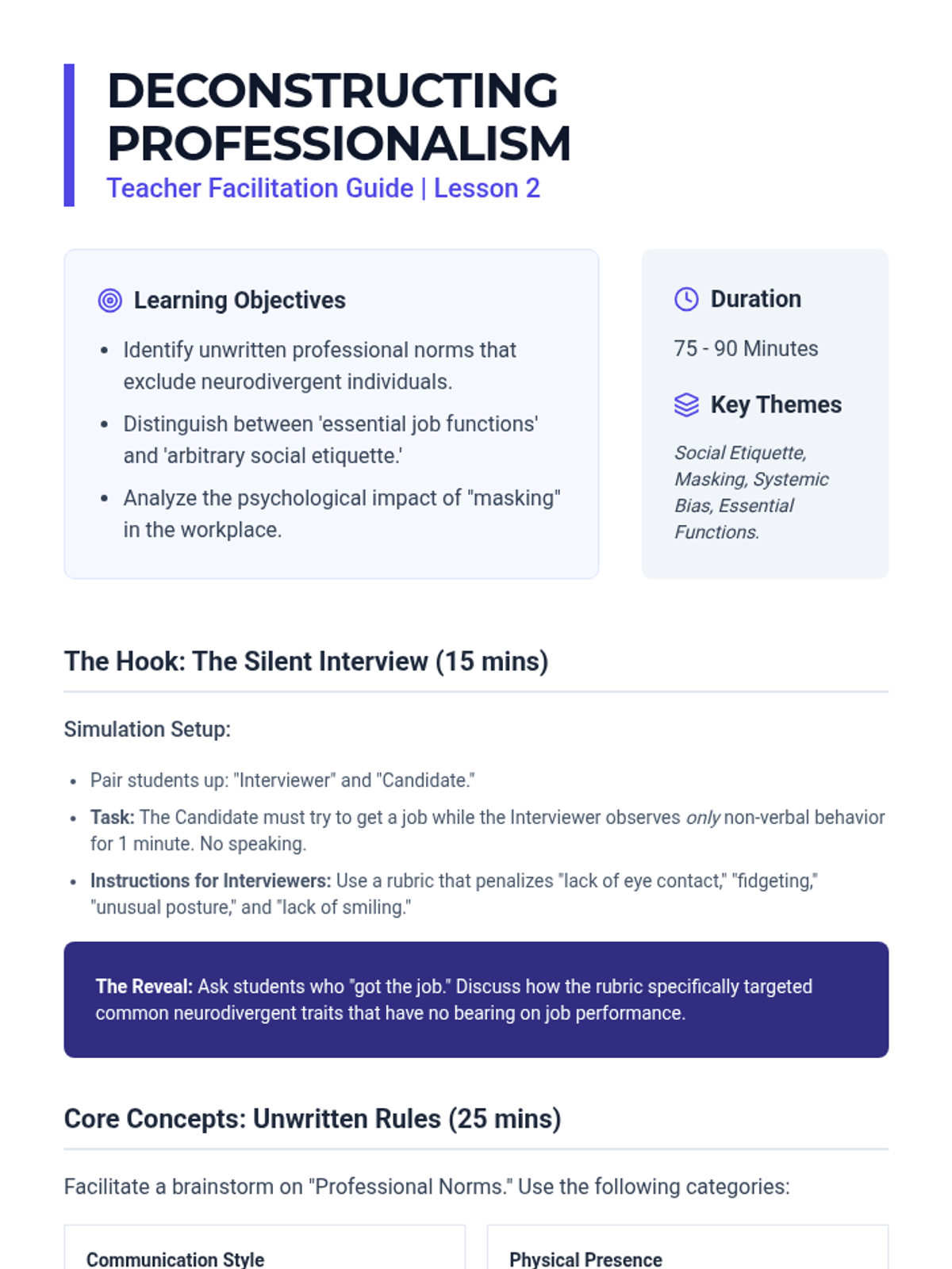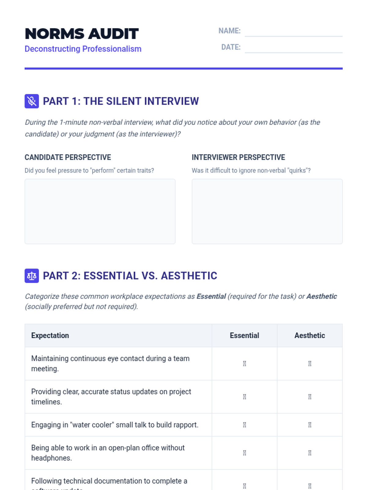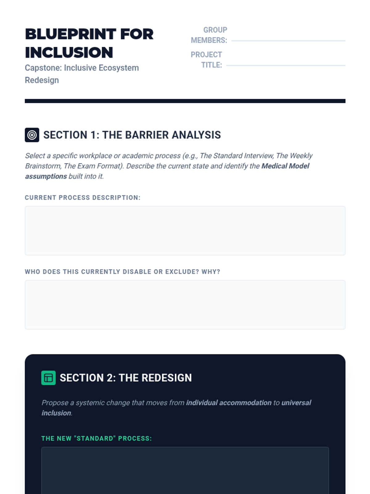 This sequence explores neurodiversity through the Social Model of disability, challenging traditional norms of professionalism and designing inclusive environments. Students will move from theoretical understanding to practical application in organizational policy and advocacy.