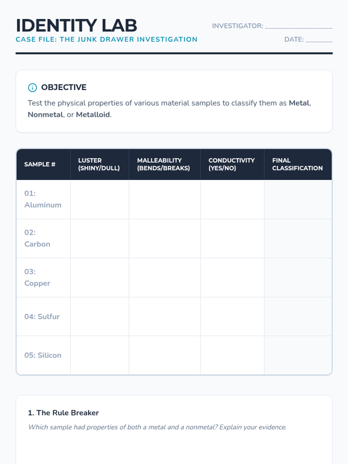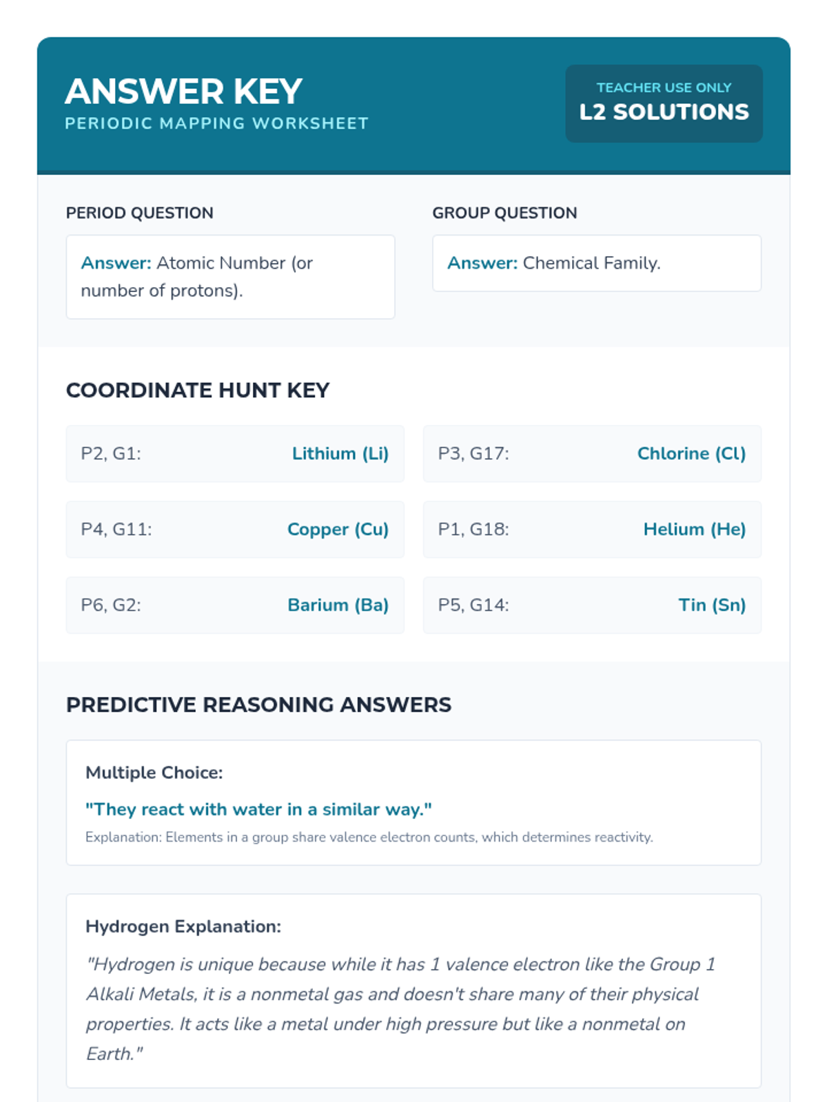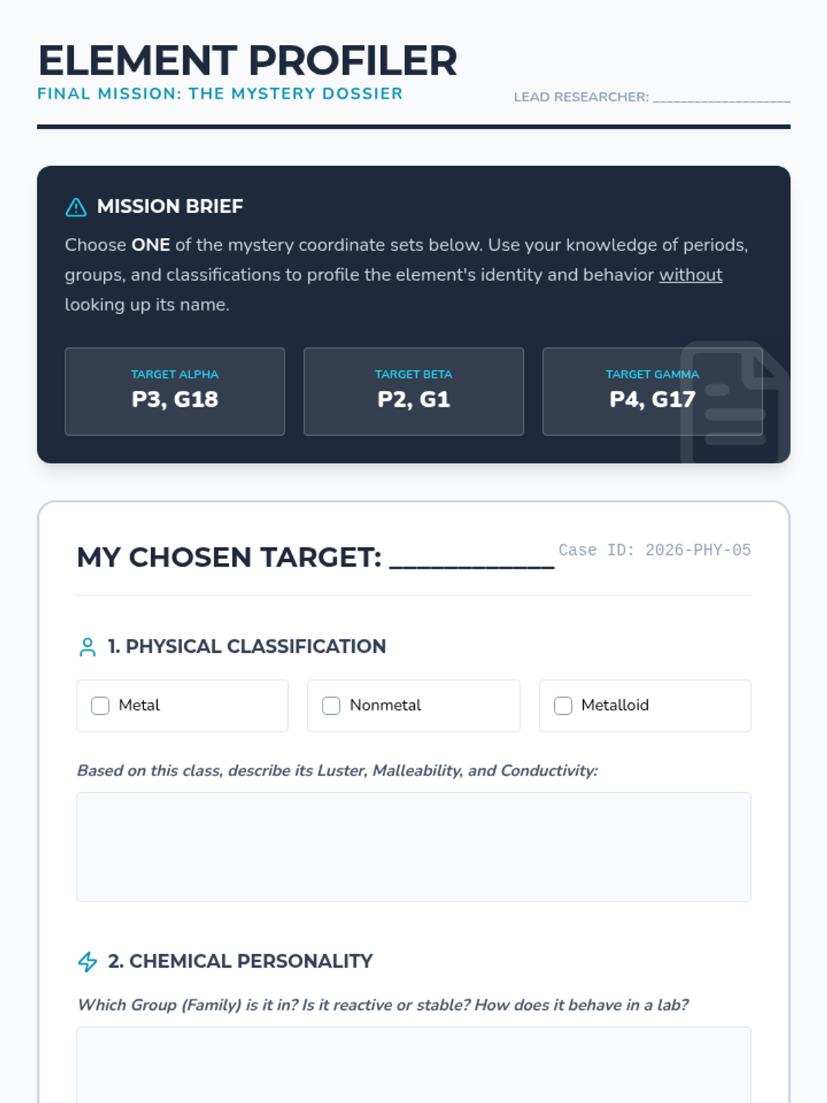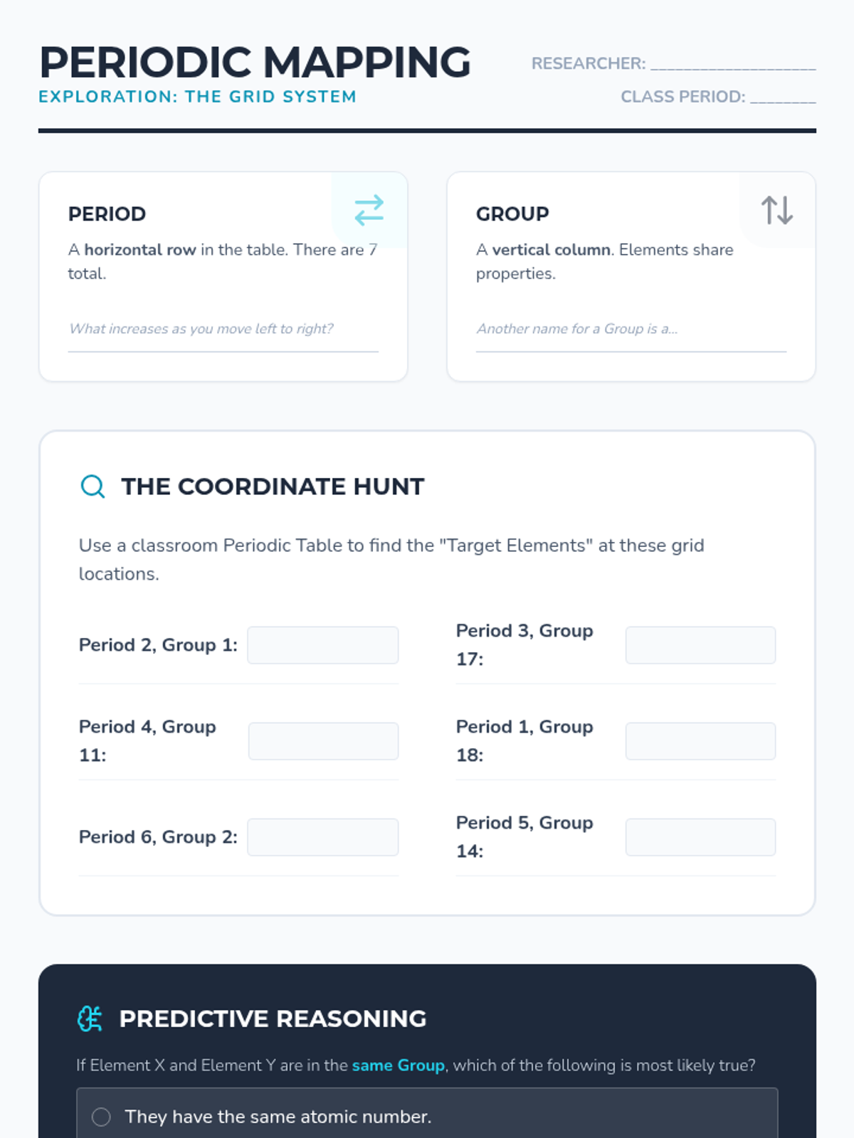 An inquiry-driven 7th-grade sequence where students reconstruct the logic of the Periodic Table through sorting activities, pattern recognition, and predictive reasoning. Students explore groups, periods, element classifications, and decoding chemical symbols.
