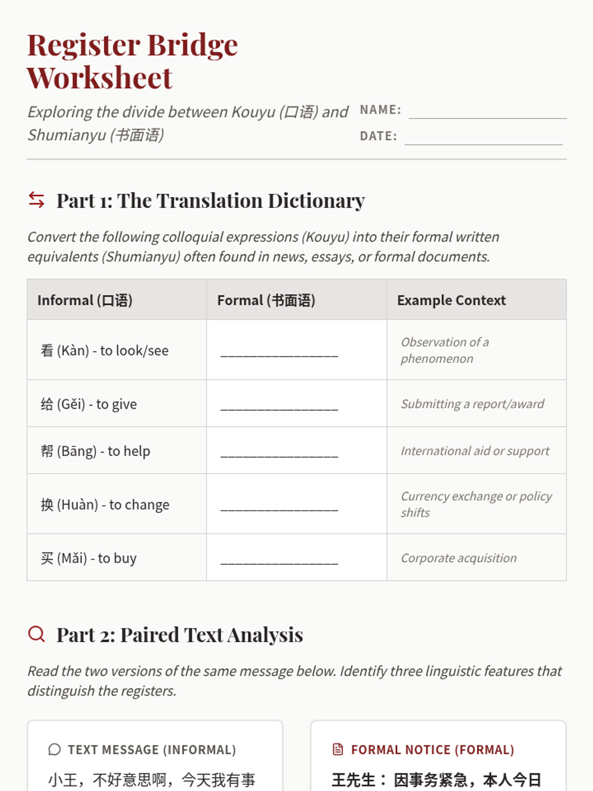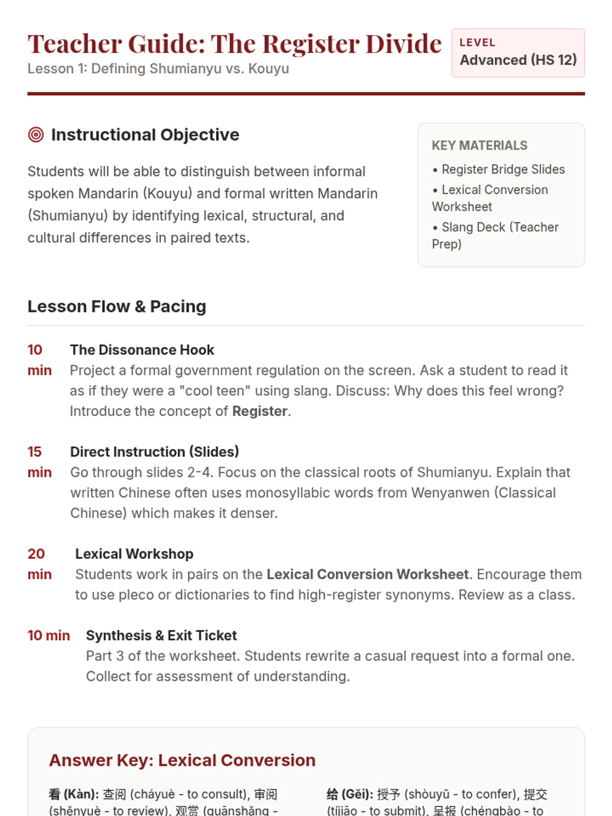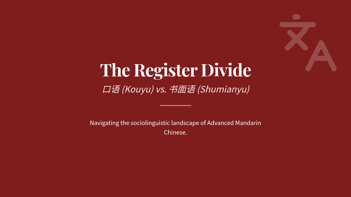This advanced Mandarin Chinese sequence explores the sociolinguistic distinction between 'Shumianyu' (written/formal language) and 'Kouyu' (spoken/informal language). Students will master the art of register translation, euphemisms, and honorifics to navigate complex social and professional environments.