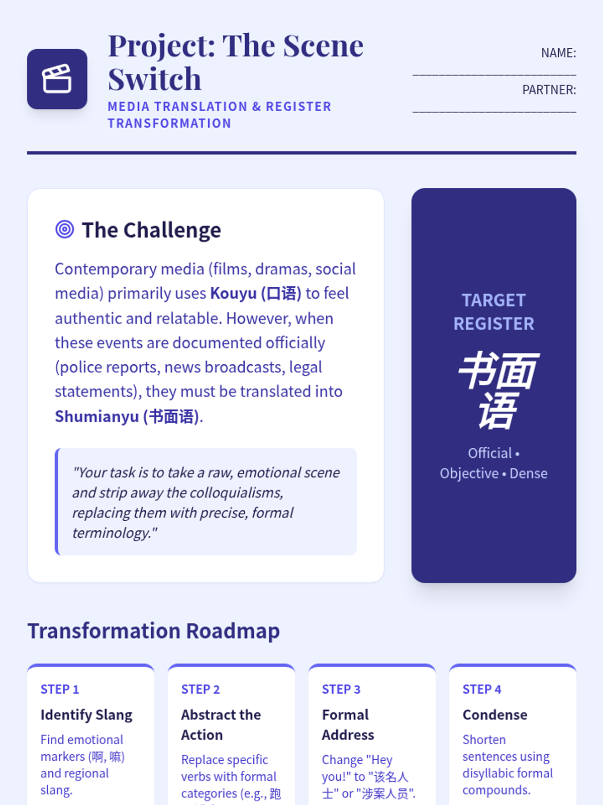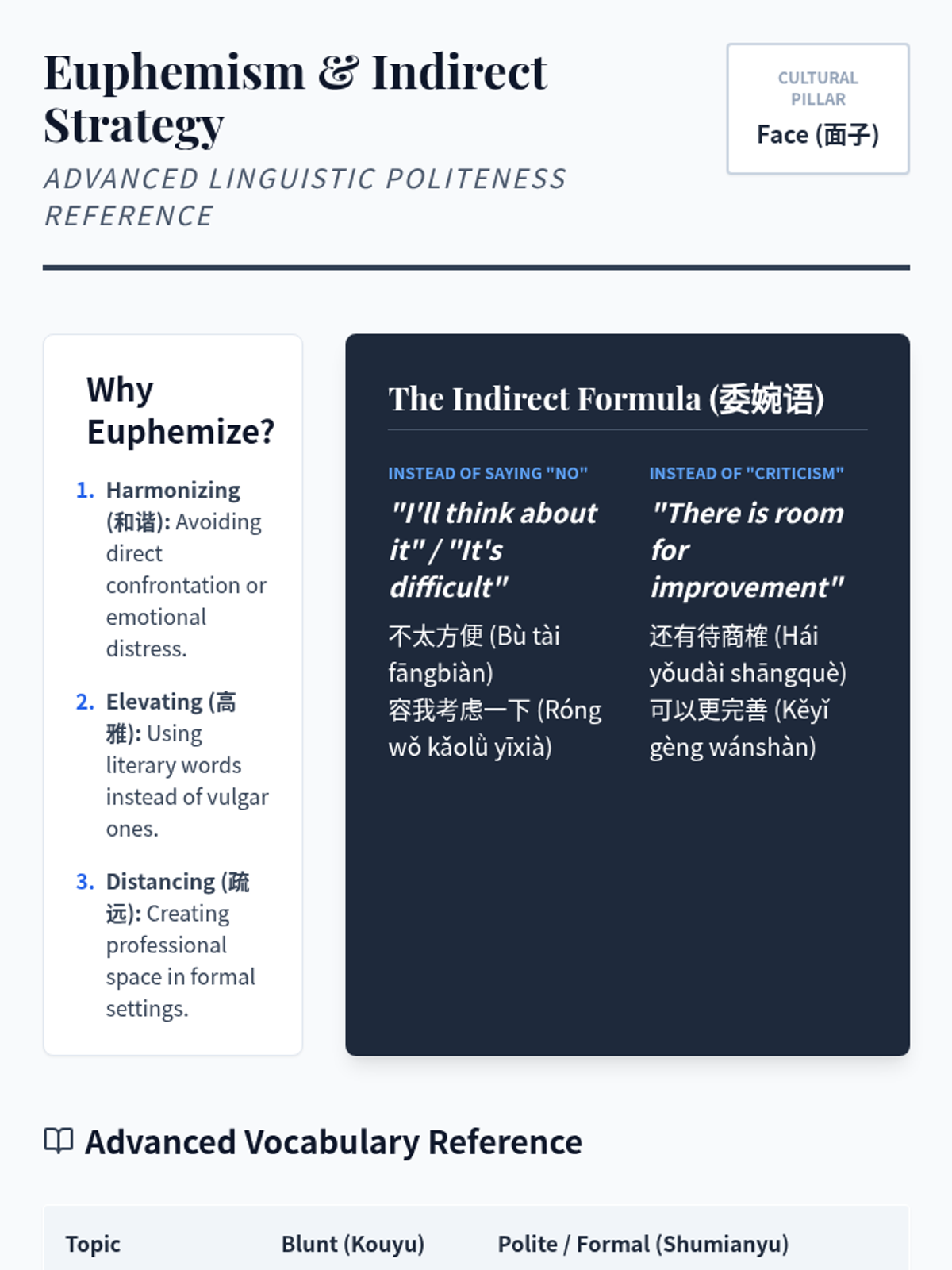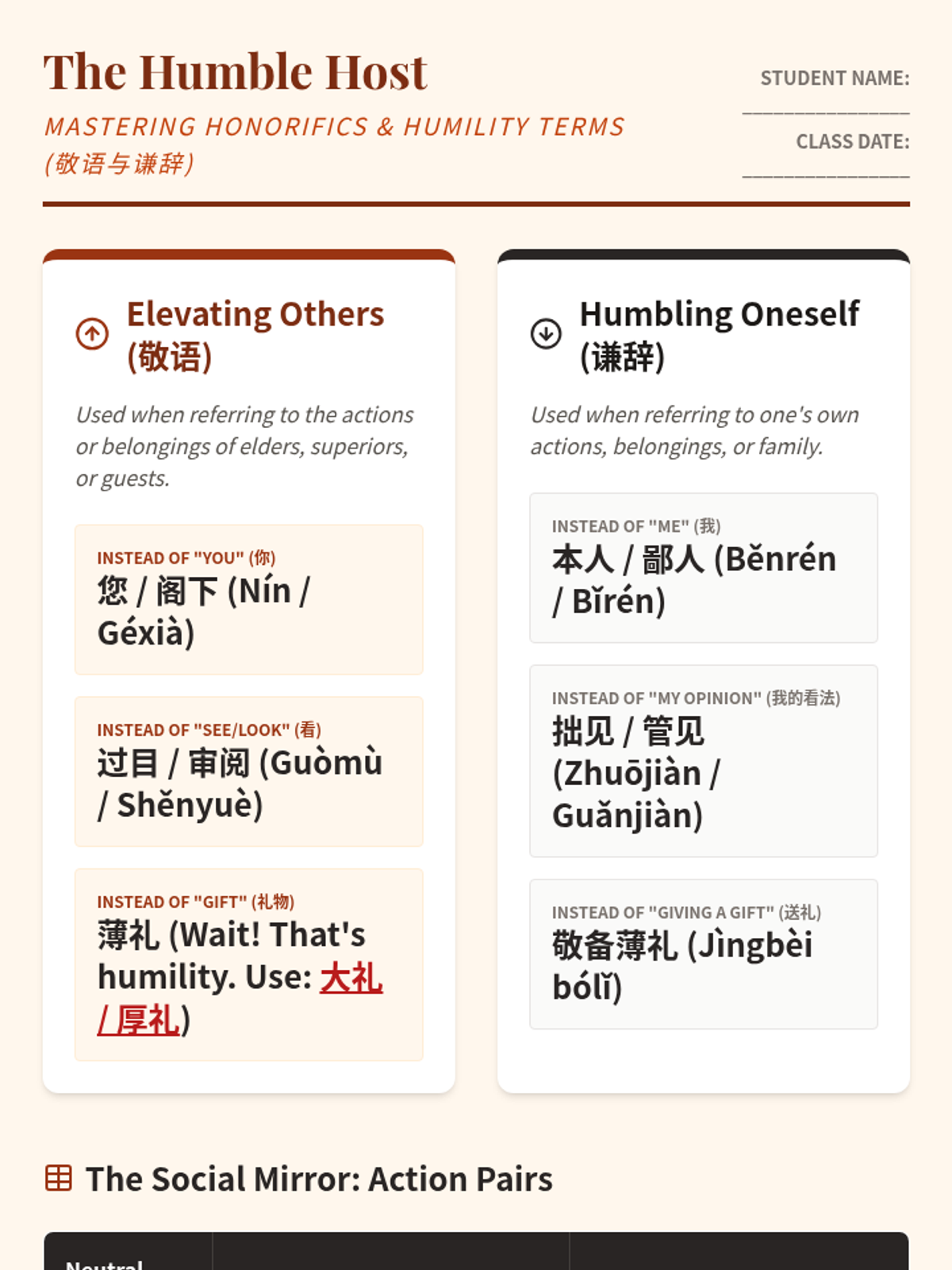 This advanced Mandarin Chinese sequence explores the sociolinguistic distinction between 'Shumianyu' (written/formal language) and 'Kouyu' (spoken/informal language). Students will master the art of register translation, euphemisms, and honorifics to navigate complex social and professional environments.