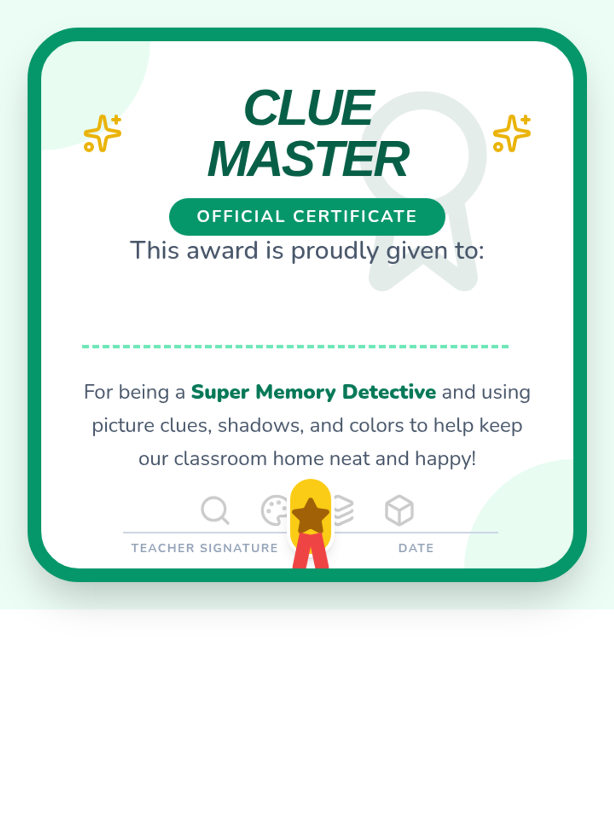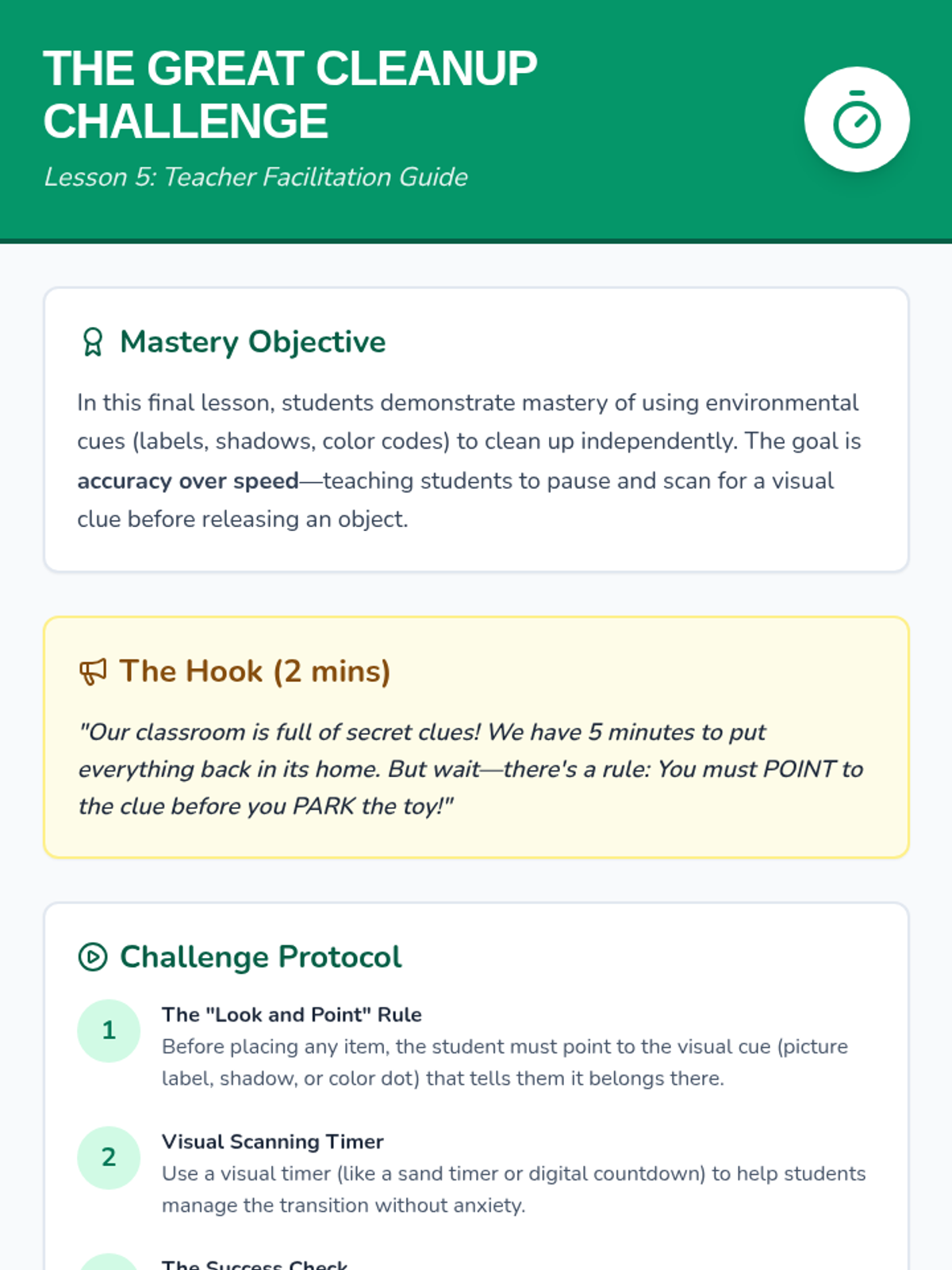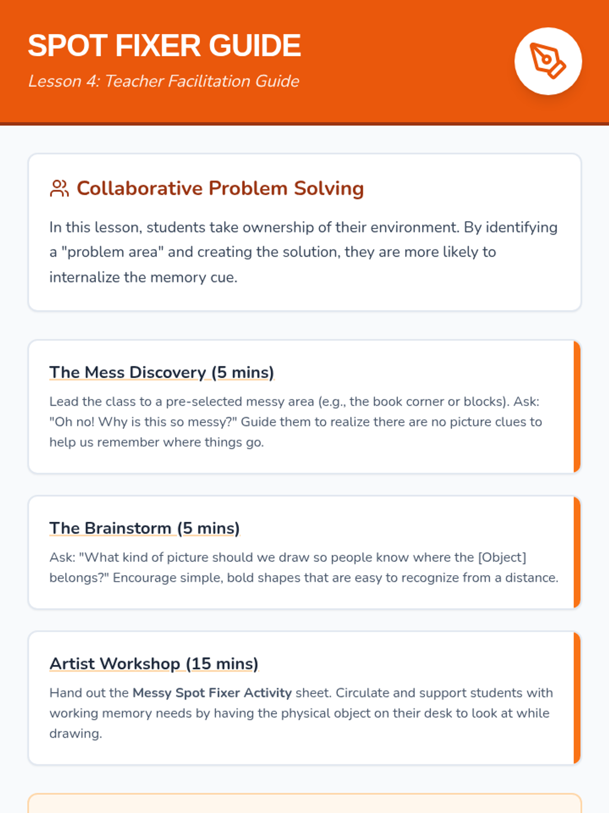 A Kindergarten sequence focused on teaching students to use environmental visual cues as memory aids to support working memory and independence in the classroom. Students learn to recognize labels, match objects to shadows, use color-coding, and create their own organizational systems.