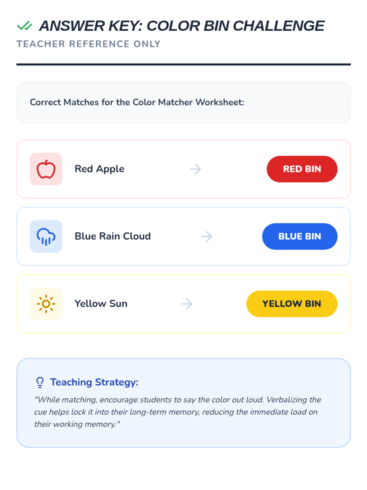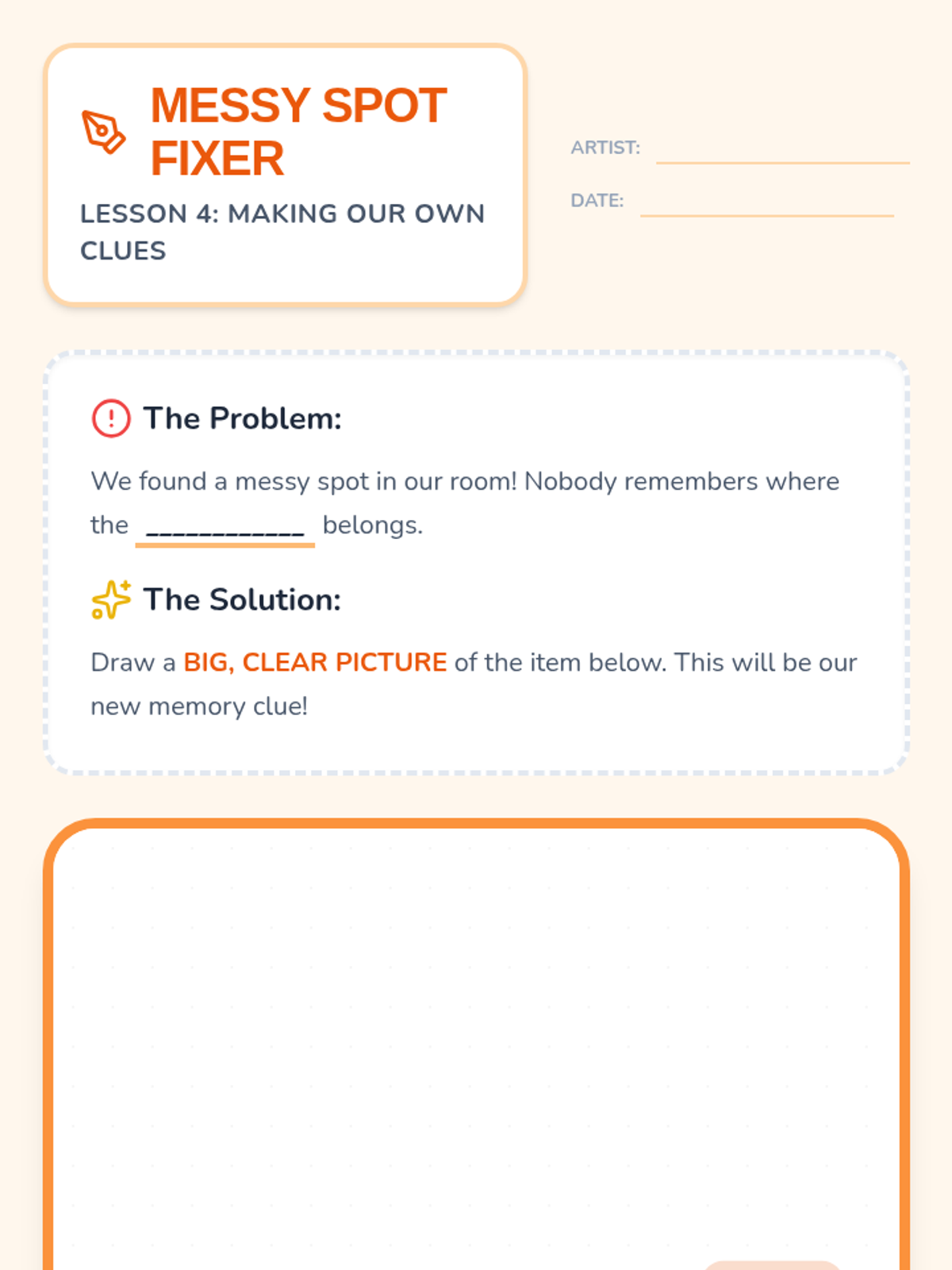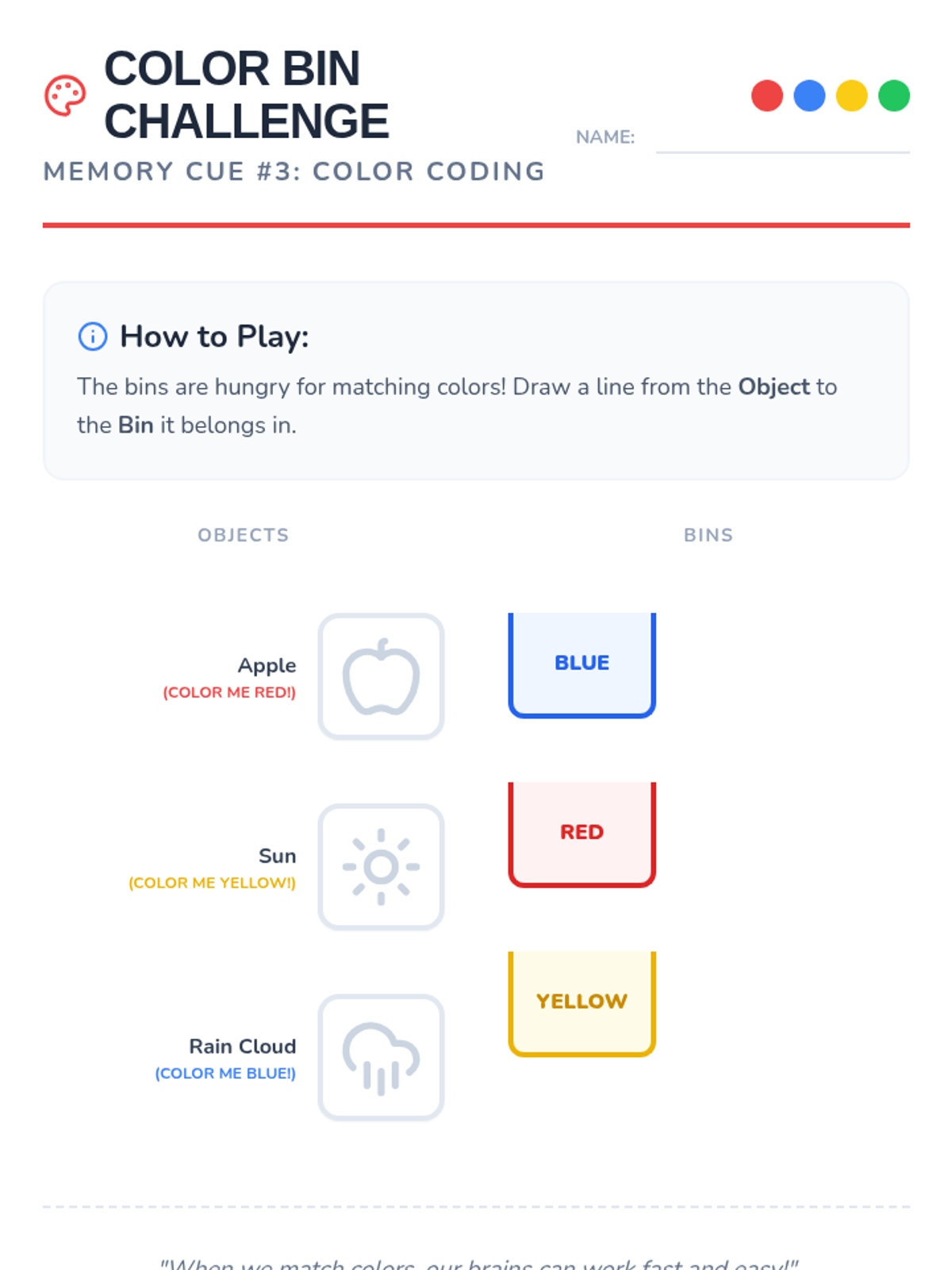 A Kindergarten sequence focused on teaching students to use environmental visual cues as memory aids to support working memory and independence in the classroom. Students learn to recognize labels, match objects to shadows, use color-coding, and create their own organizational systems.