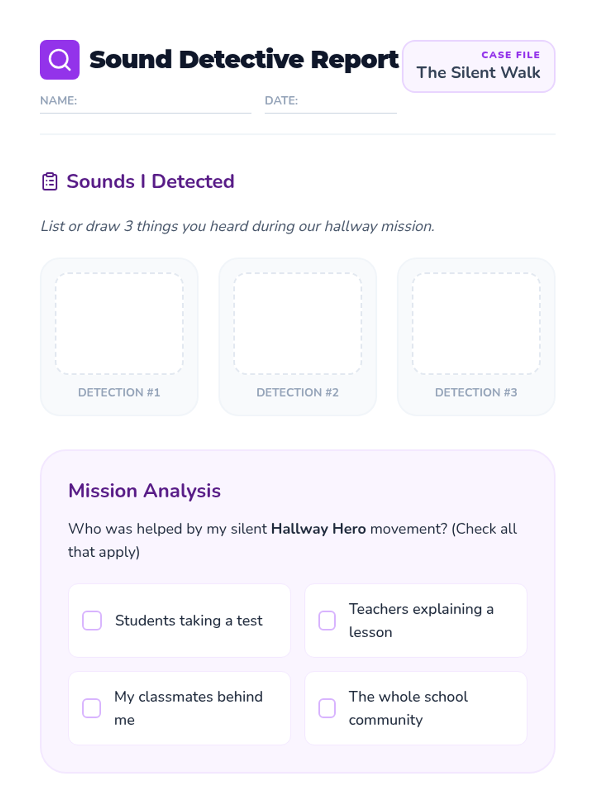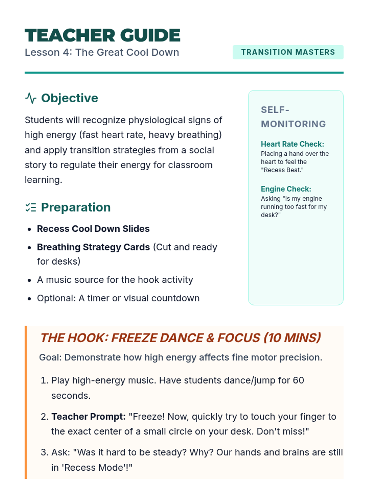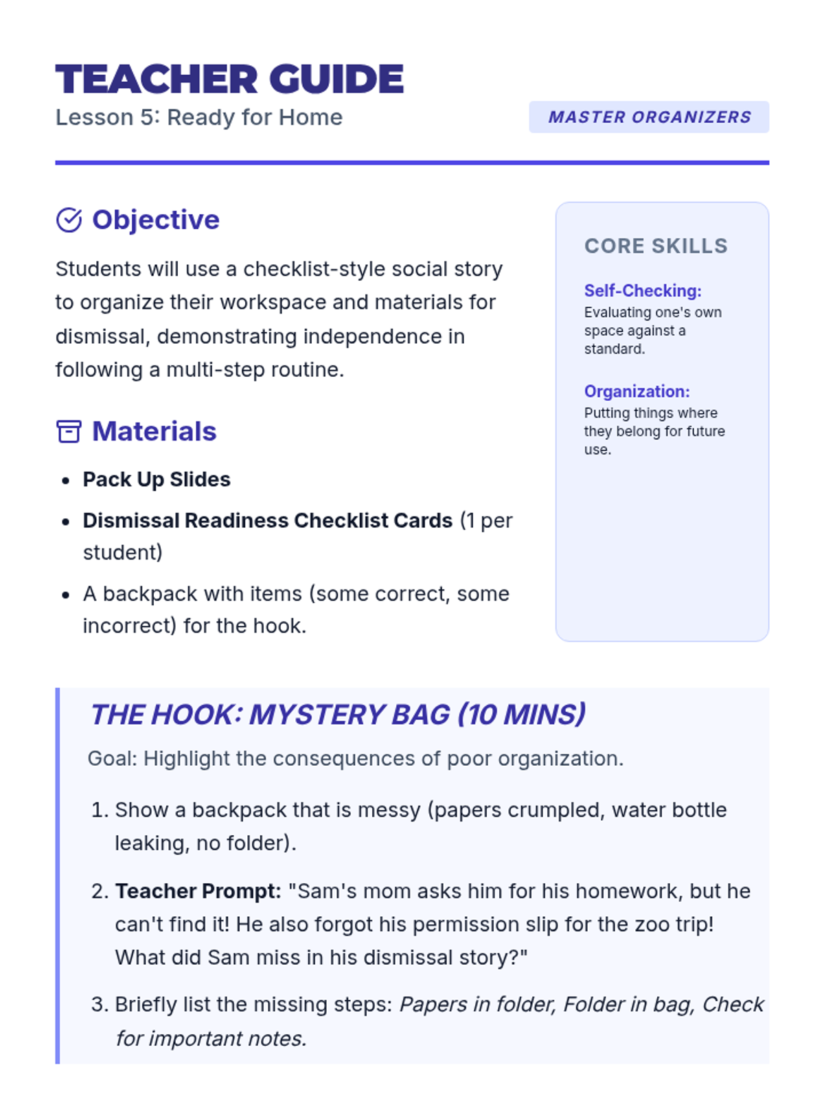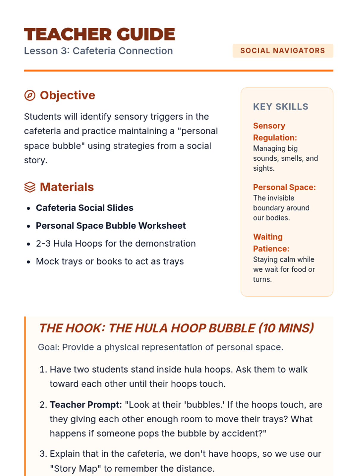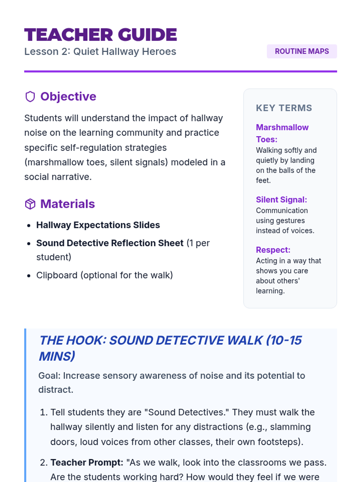A 5-lesson sequence for 3rd-grade students focused on internalizing school routines through social stories. Students explore arrival, hallways, cafeteria, transitions, and dismissal to build self-regulation and community awareness.