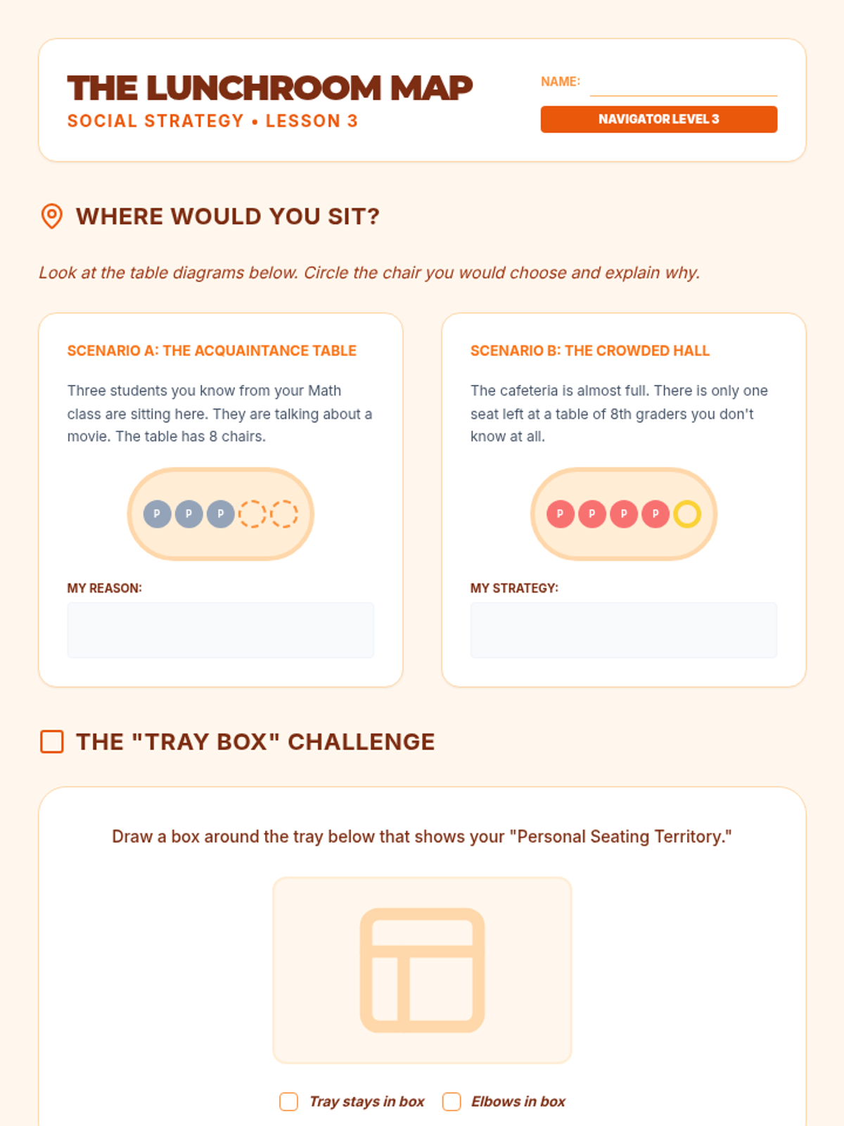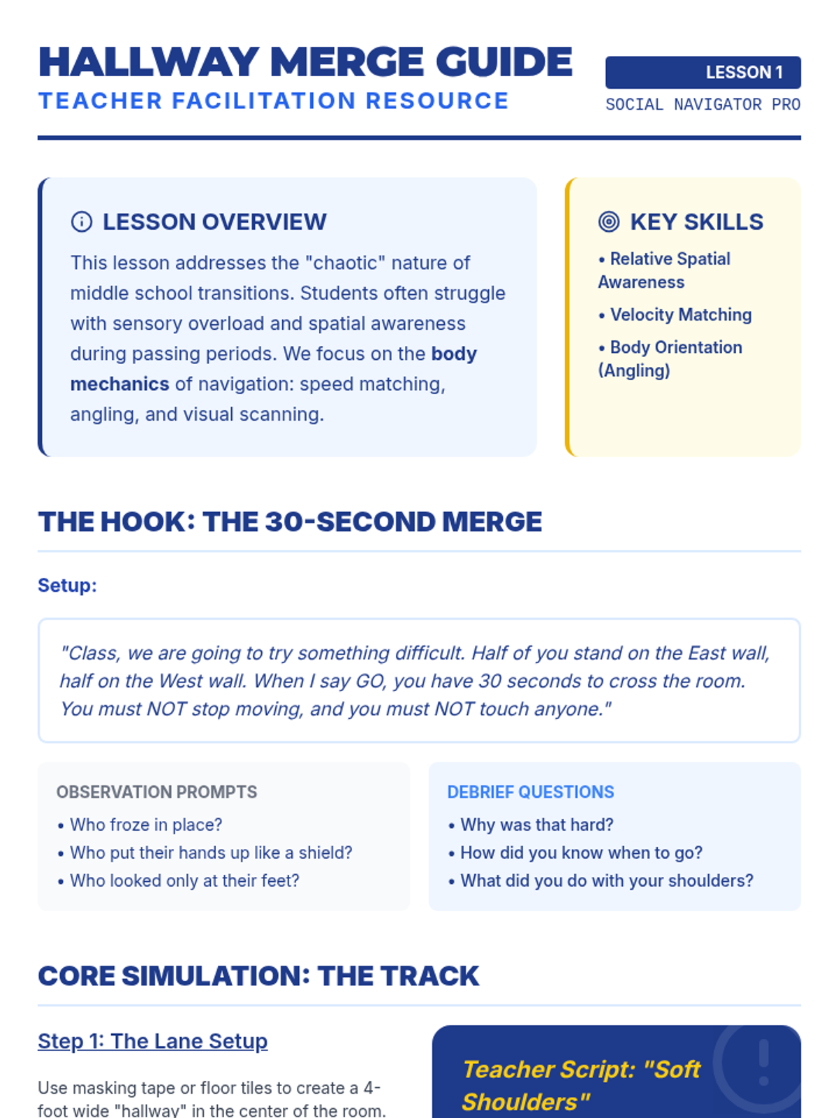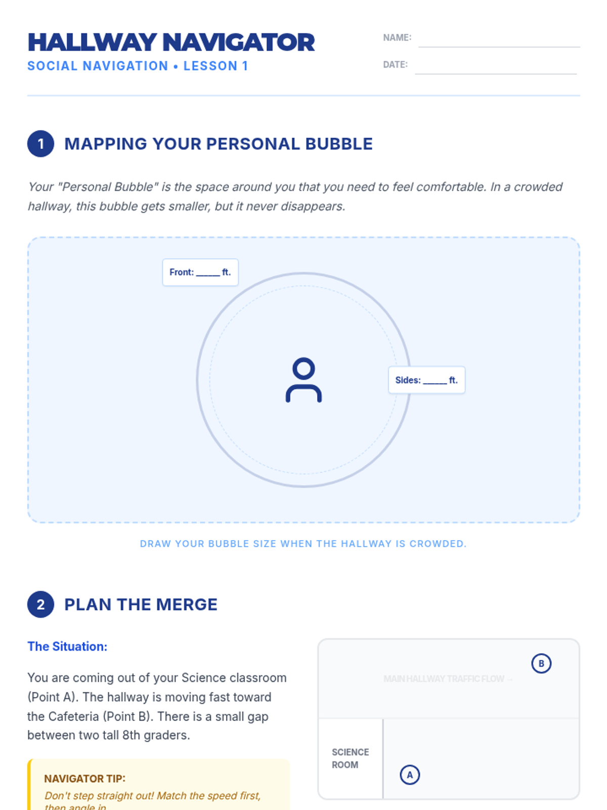 A comprehensive 5-lesson sequence designed for 6th-grade students focusing on navigating the spatial challenges of middle school environments, from crowded hallways to cafeteria seating.
