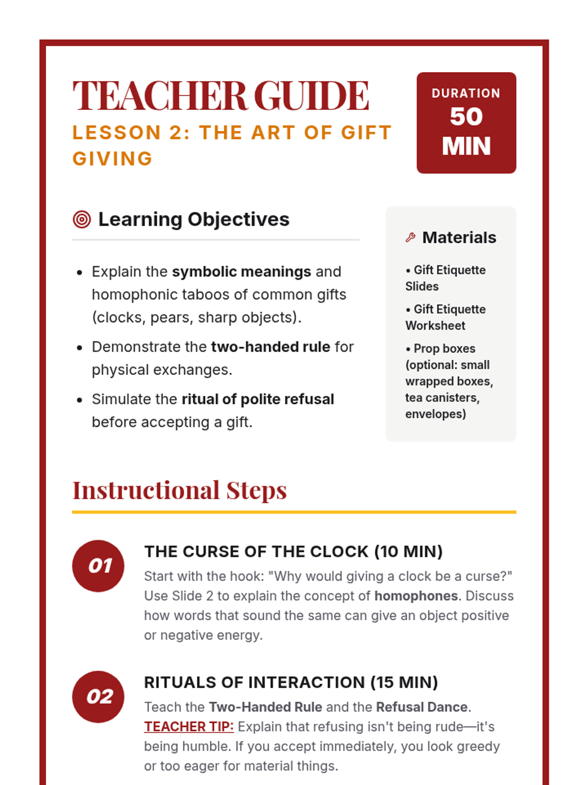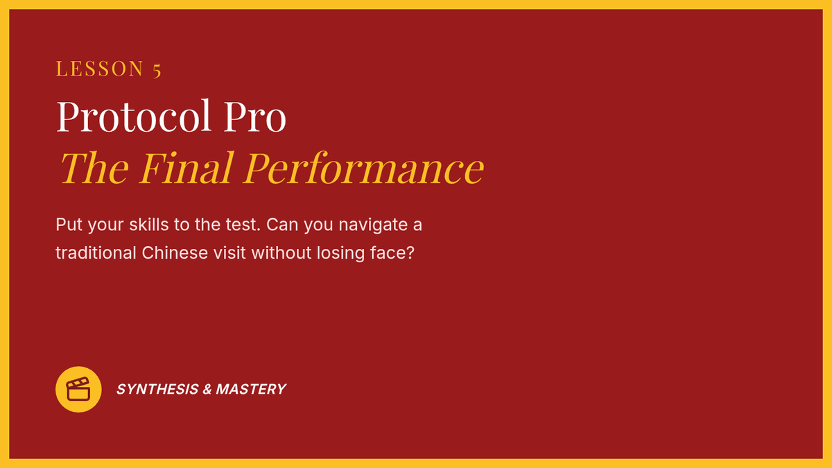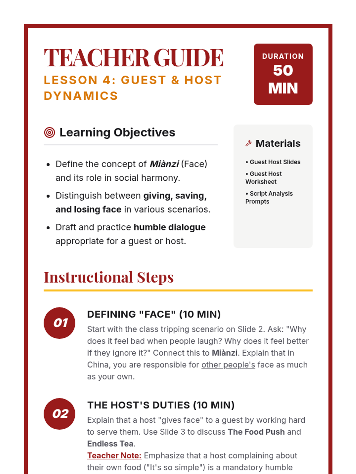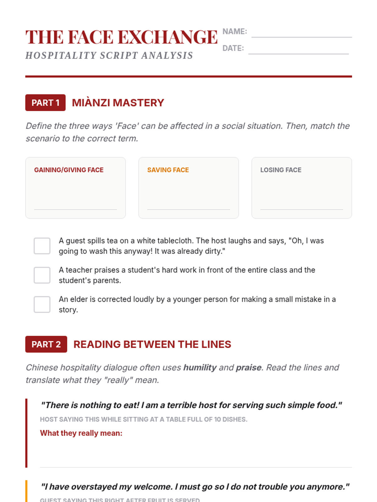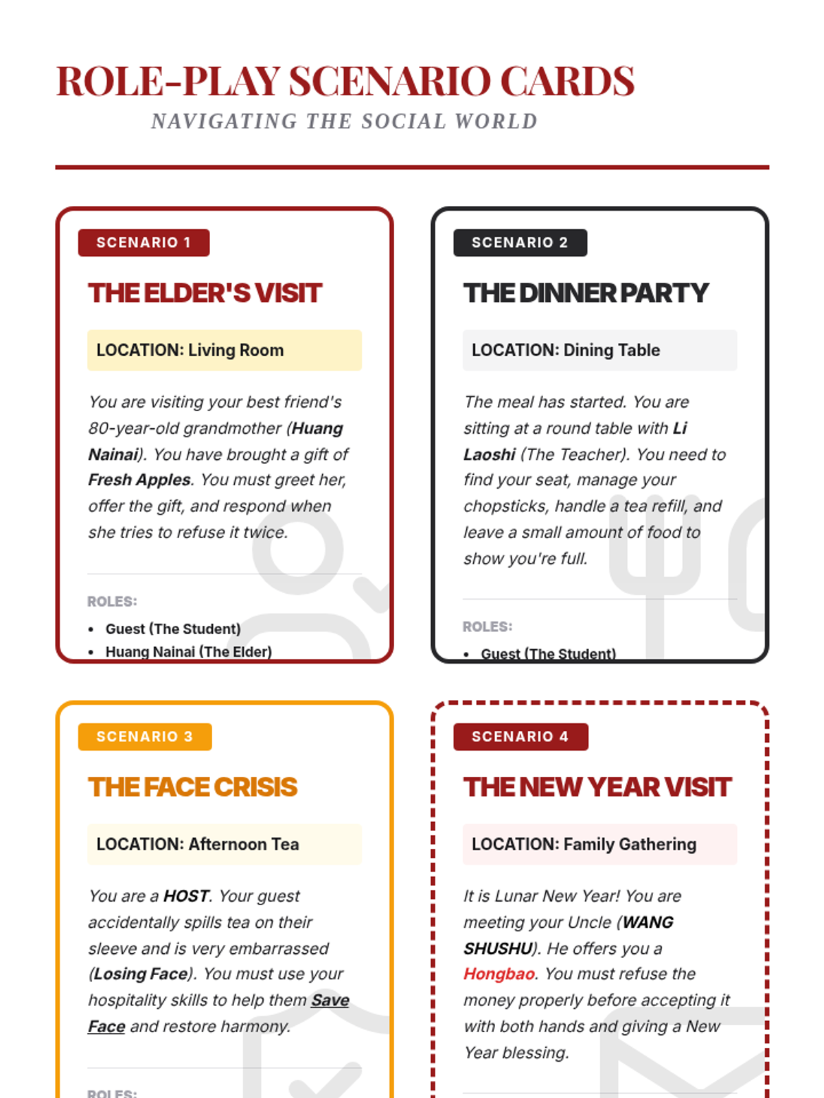 Students explore Chinese social interaction, focusing on 'face', hierarchy, and politeness strategies. Through simulations, they practice greetings, gift-giving, dining, and hospitality, connecting modern behaviors to Confucian ideals.