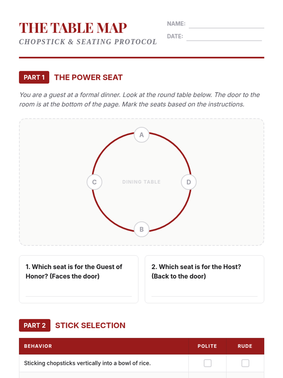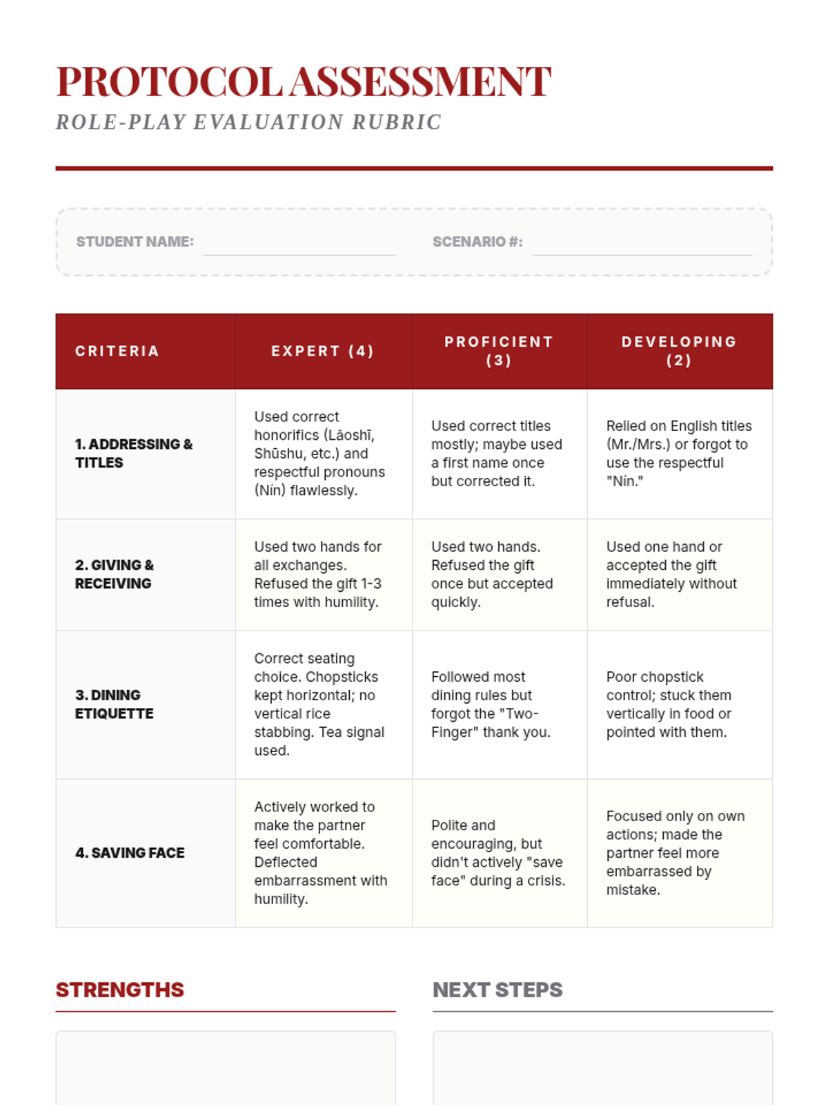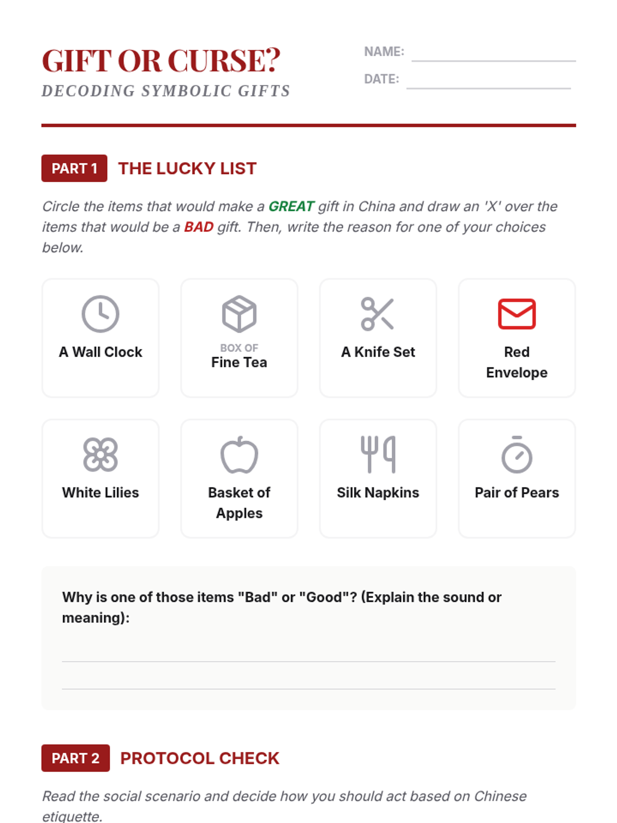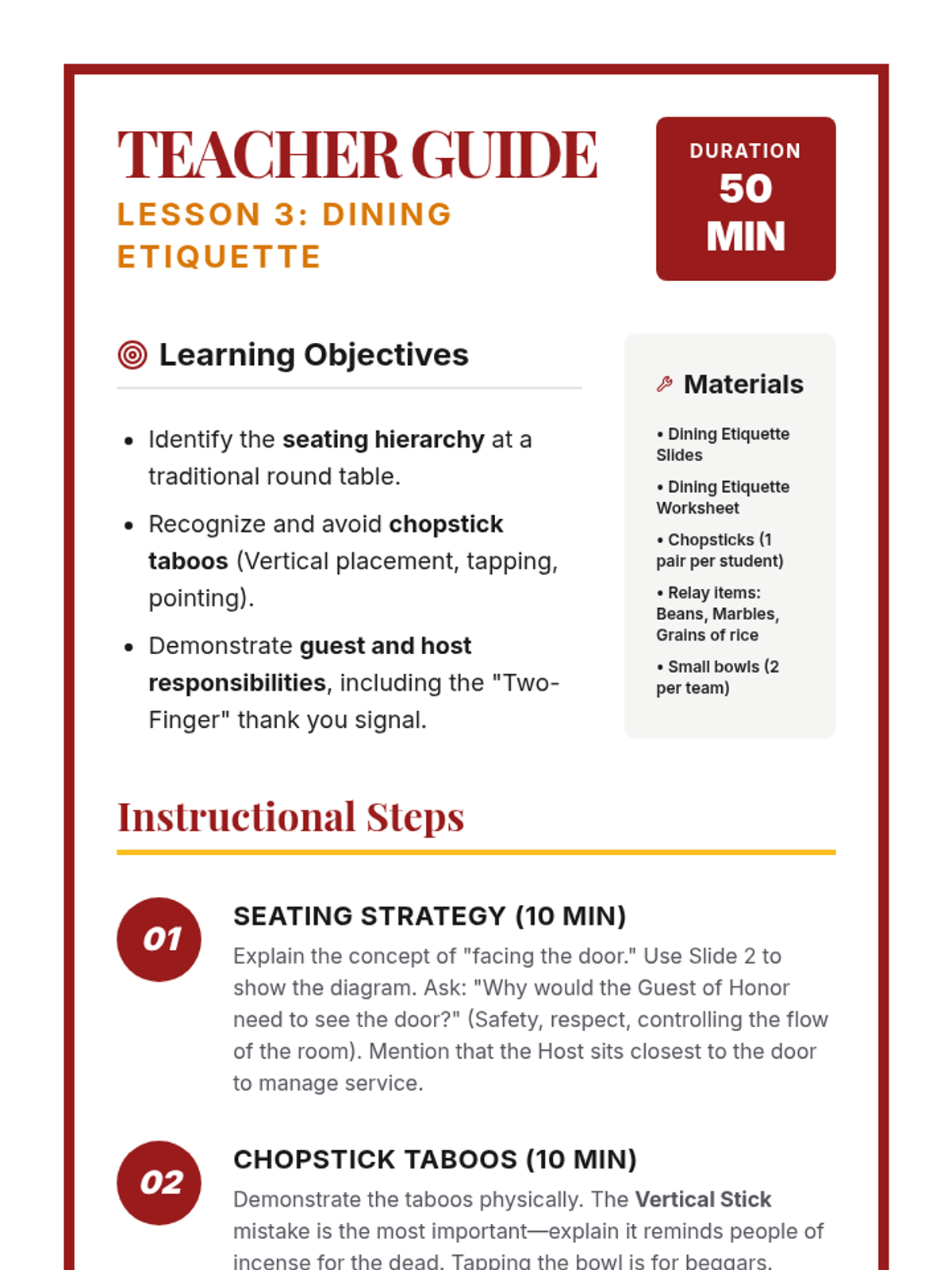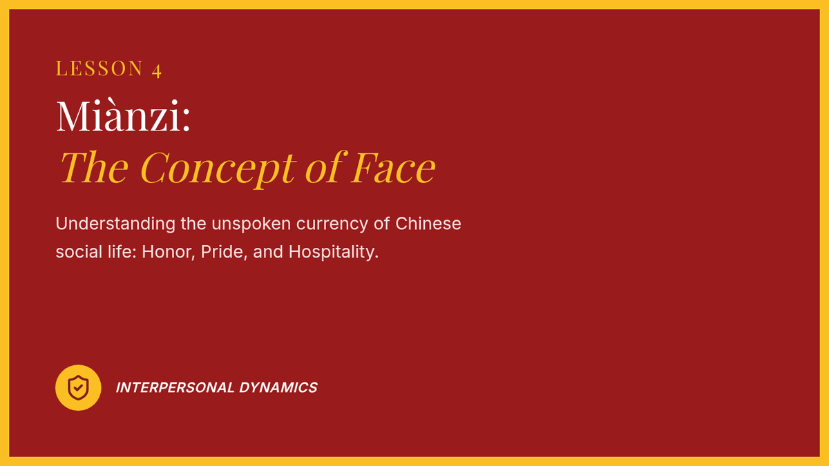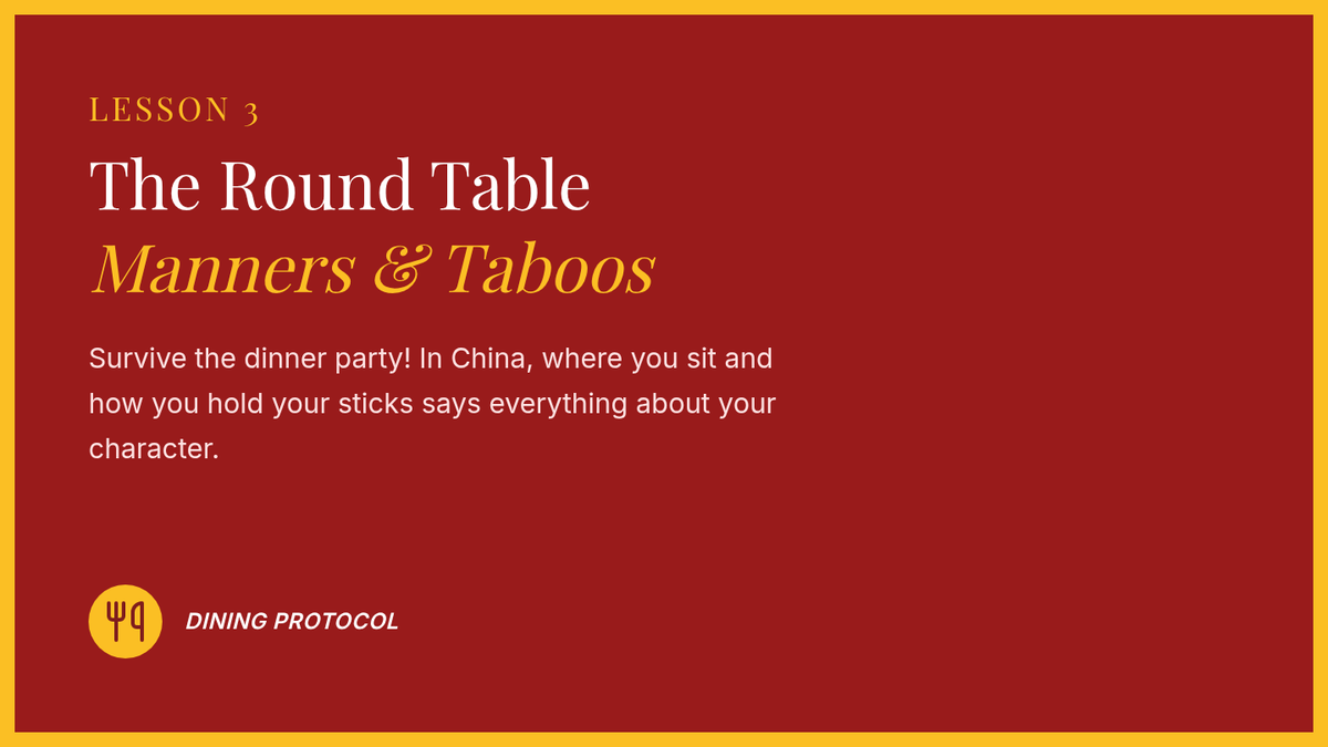 Students explore Chinese social interaction, focusing on 'face', hierarchy, and politeness strategies. Through simulations, they practice greetings, gift-giving, dining, and hospitality, connecting modern behaviors to Confucian ideals.