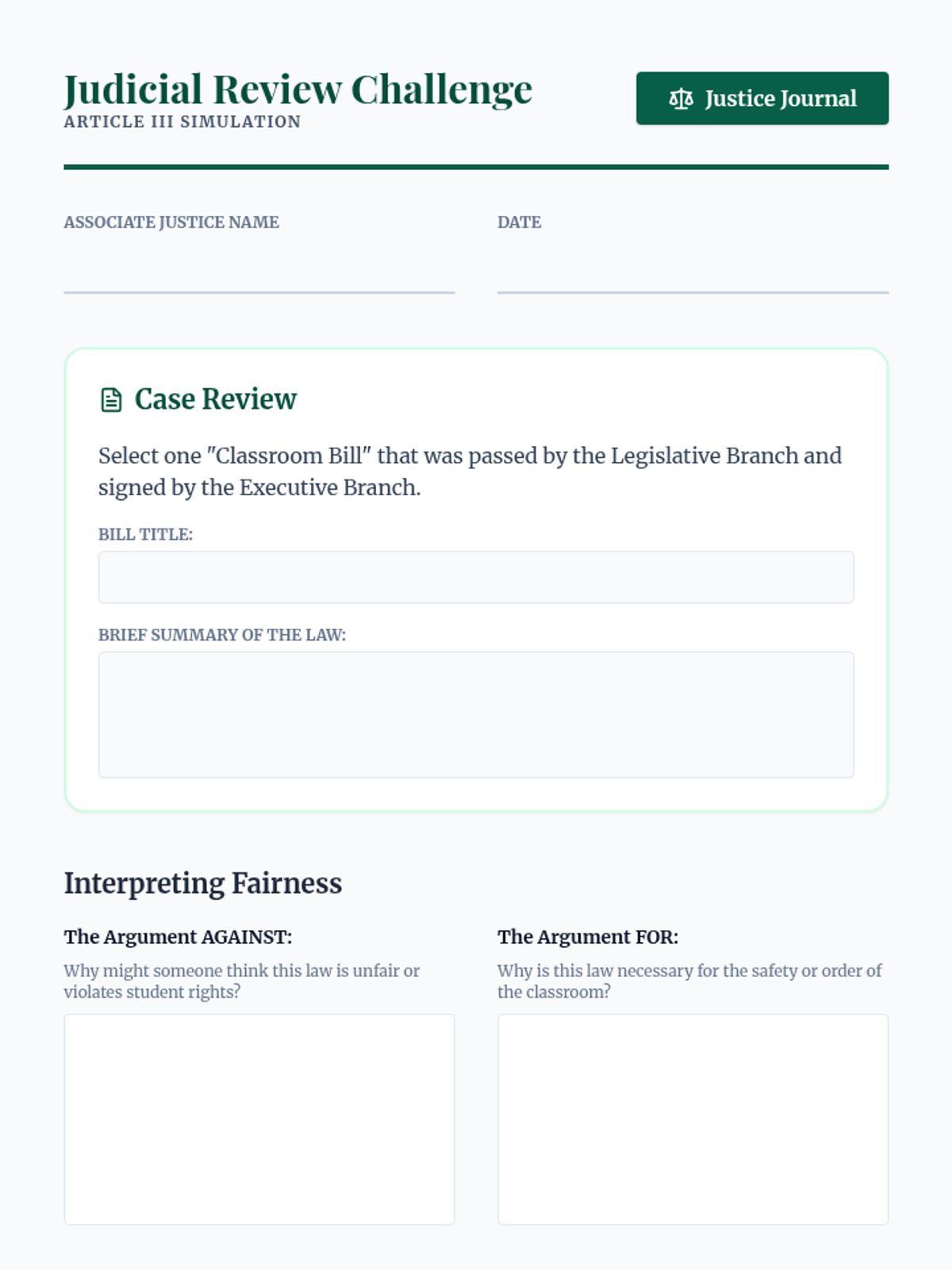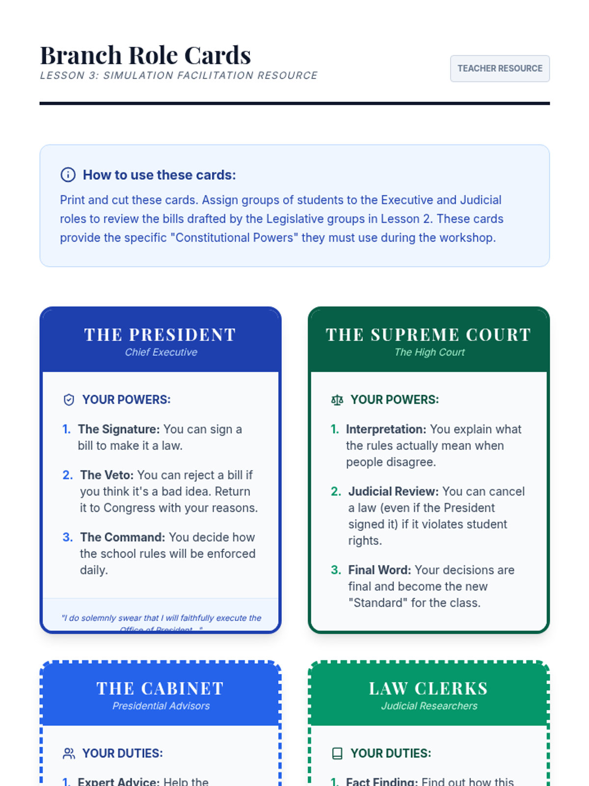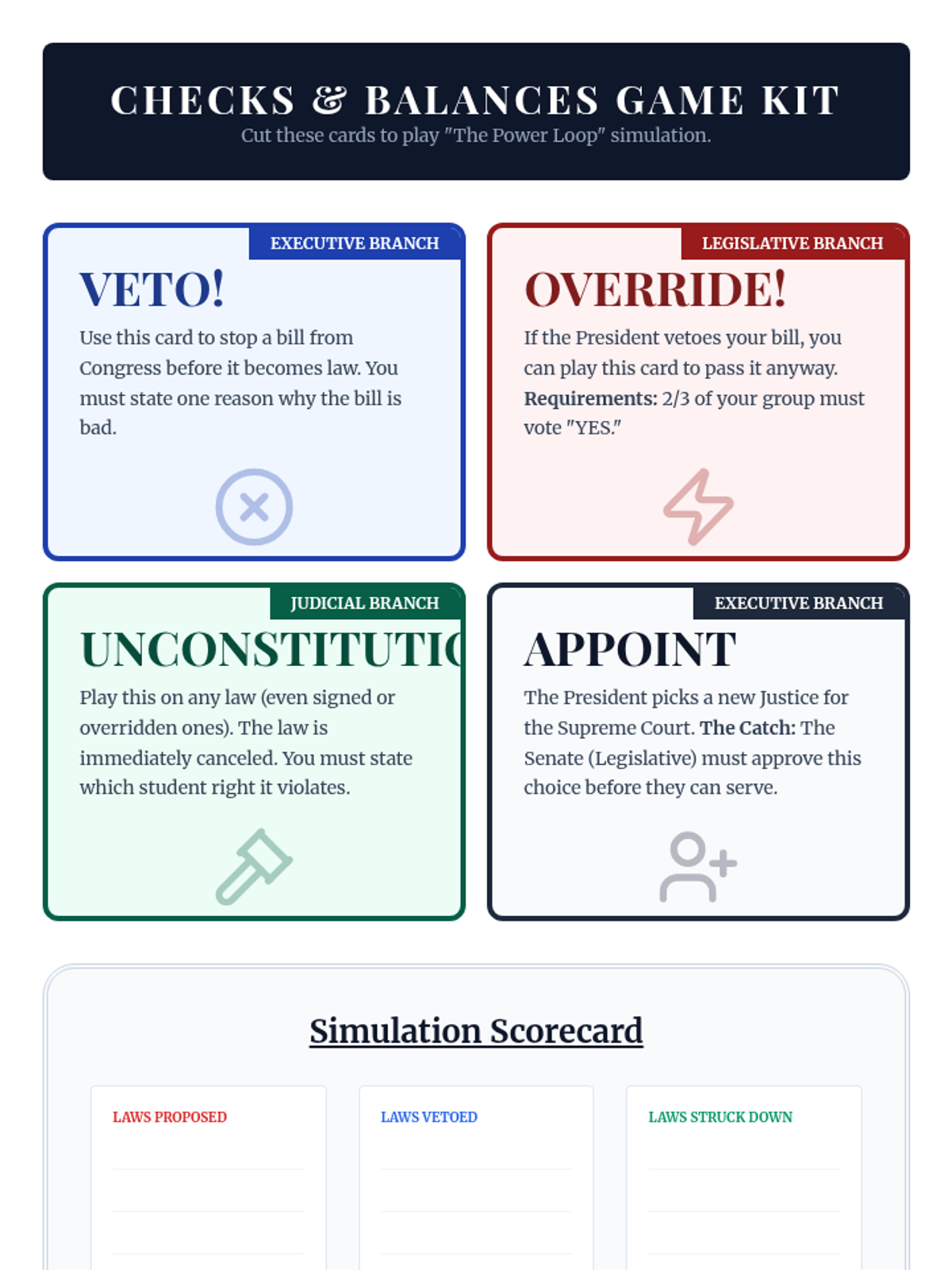 This immersive sequence transforms the classroom into a working model of the United States government to demystify the structure of federal power. Students explore the separation of powers, role-play the three branches, and engage in simulations of checks and balances and federalism.