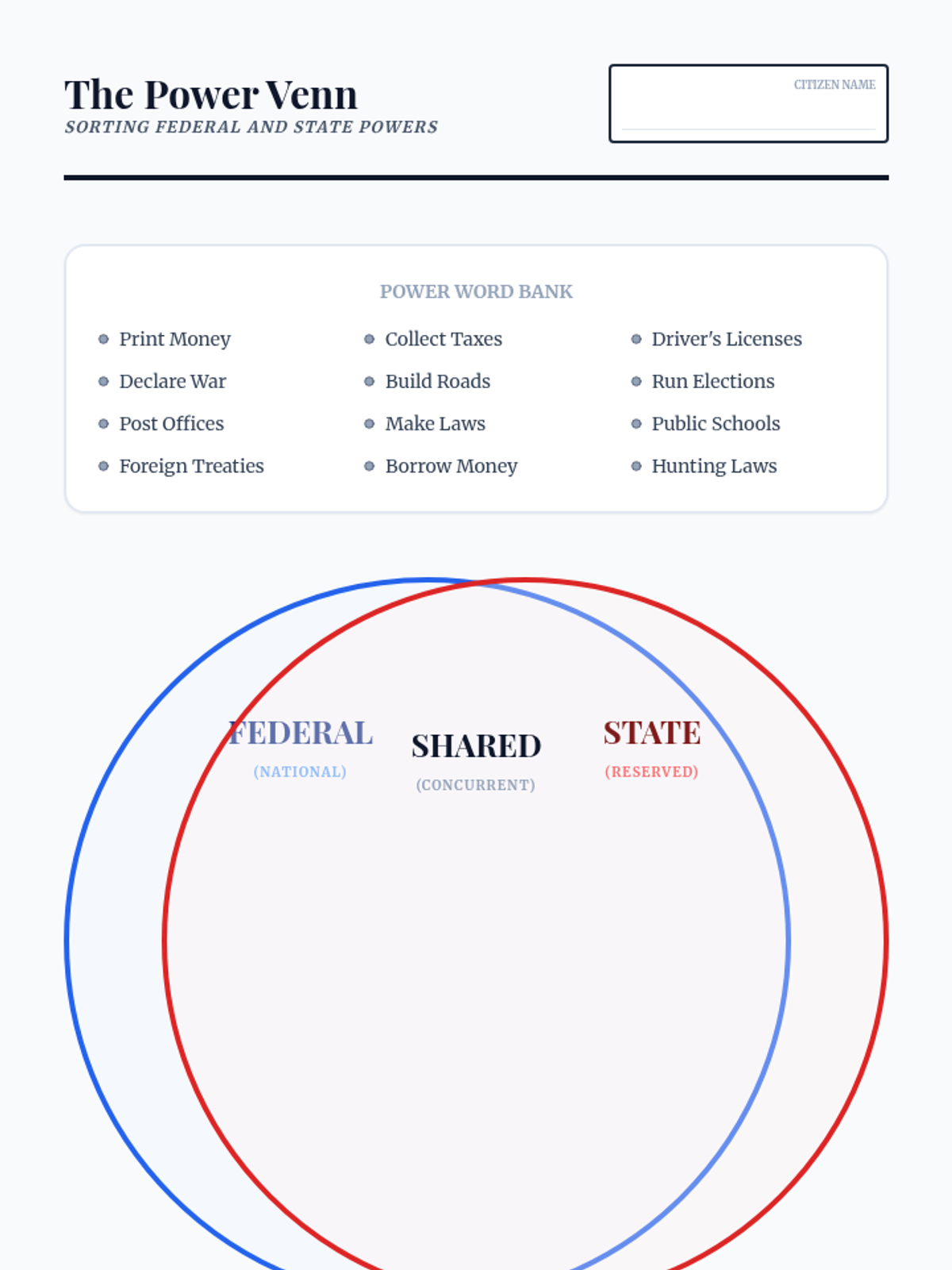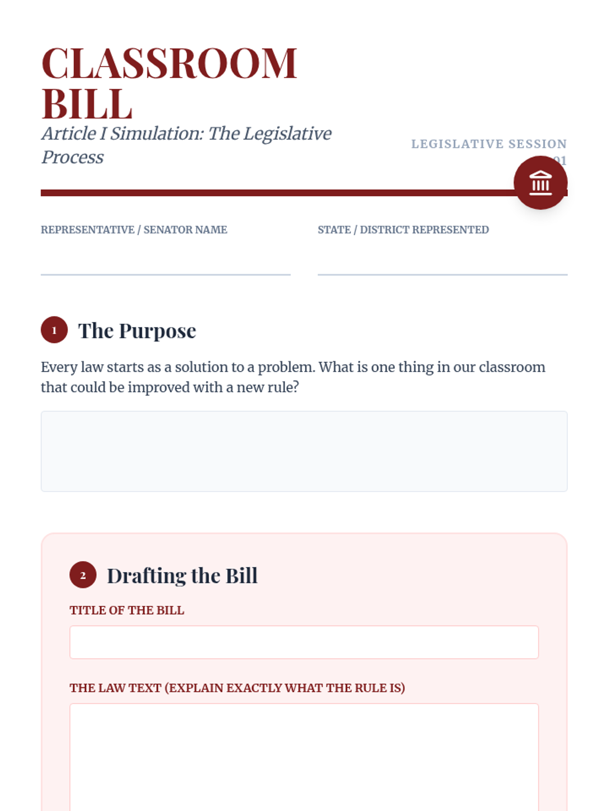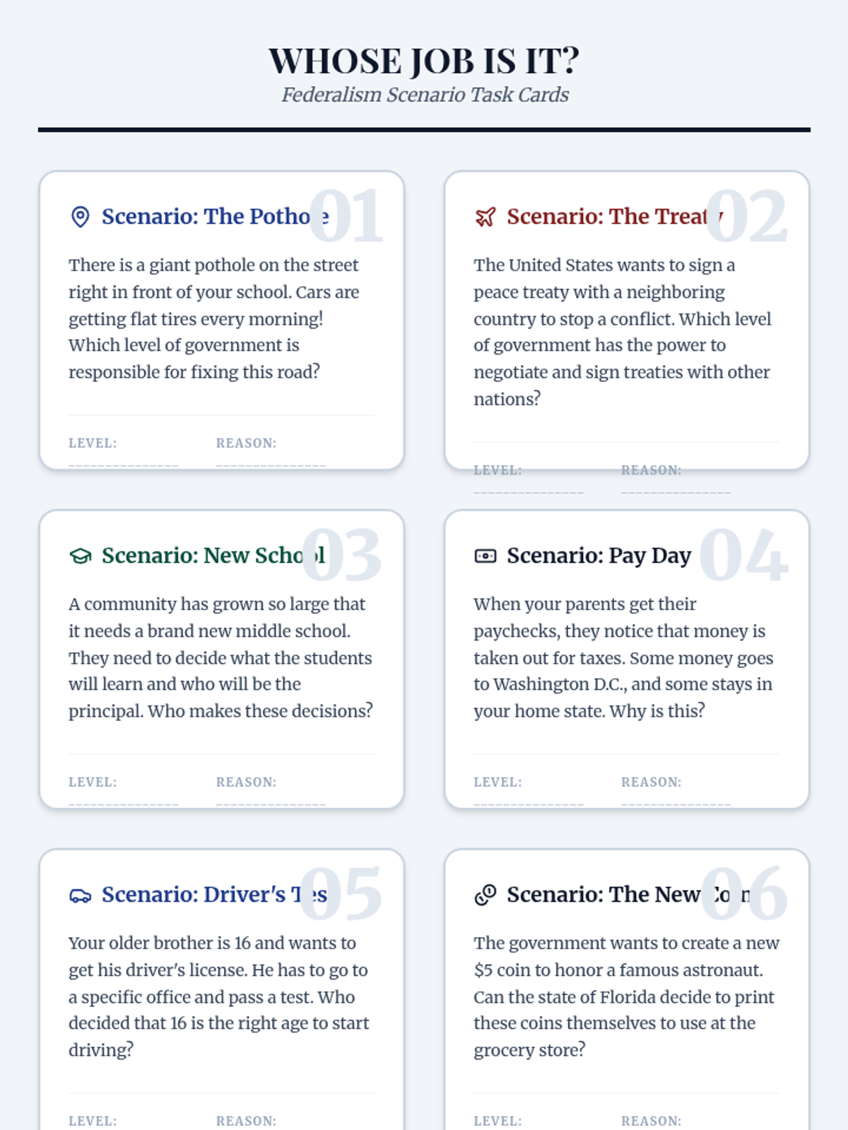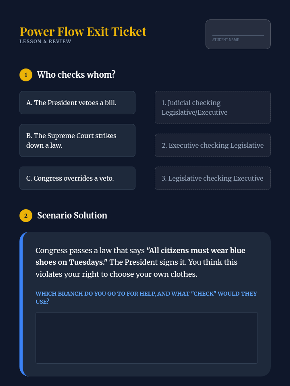 This immersive sequence transforms the classroom into a working model of the United States government to demystify the structure of federal power. Students explore the separation of powers, role-play the three branches, and engage in simulations of checks and balances and federalism.