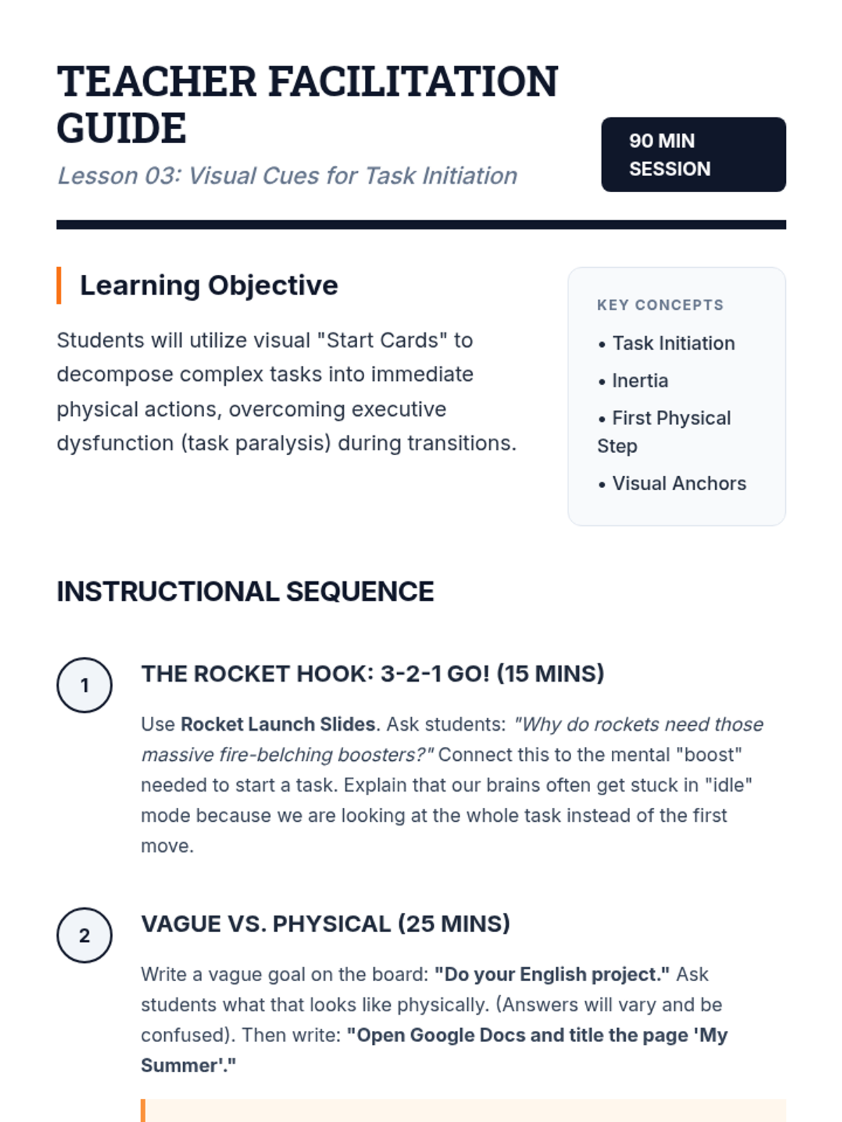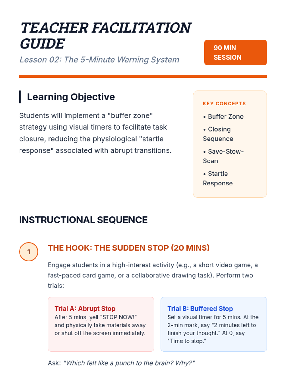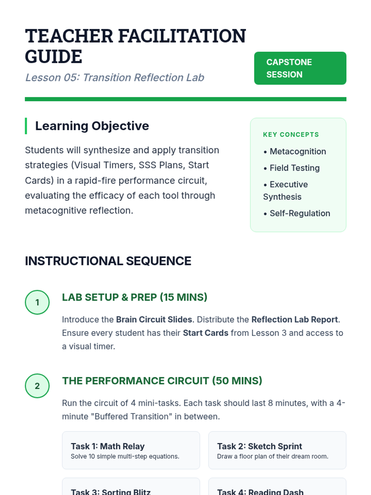A specialized sequence for high school students focused on mastering task transitions using visual timers and organizational strategies. Students learn to analyze the mechanics of moving between tasks, use buffer zones to reduce anxiety, and develop cognitive flexibility for unexpected schedule changes.