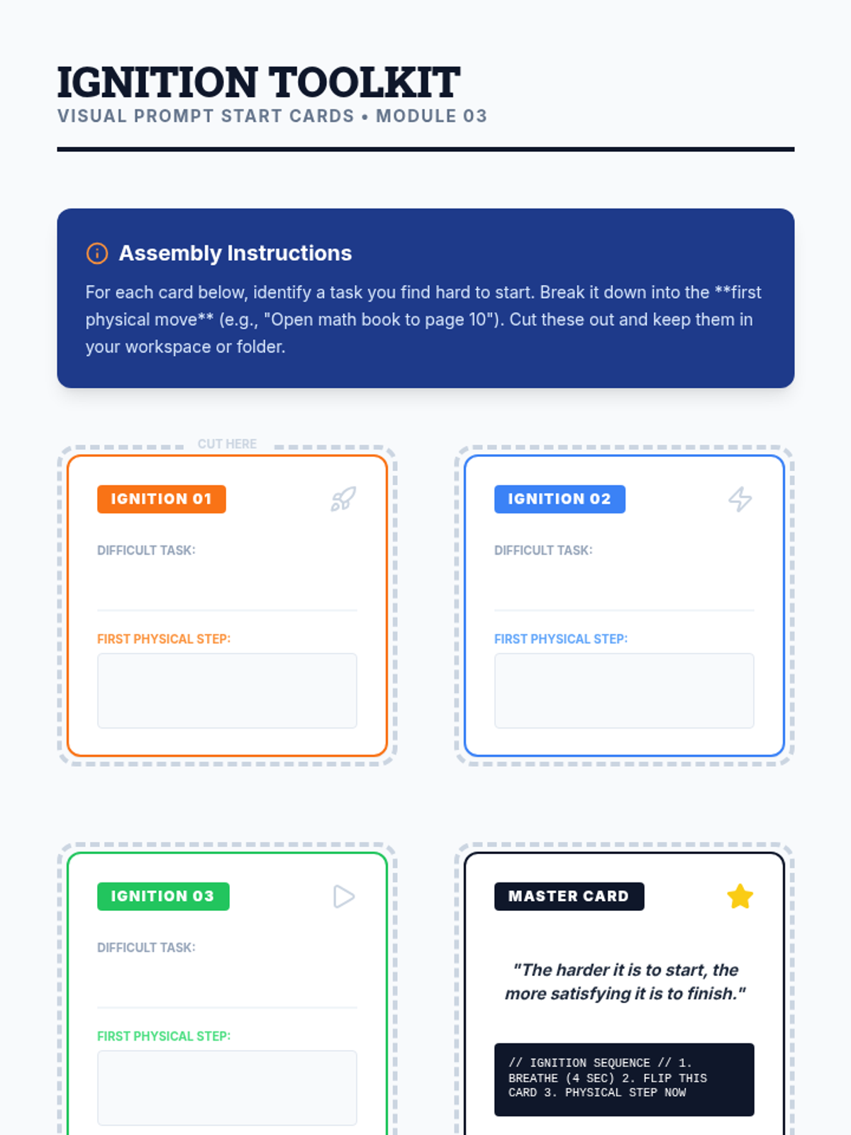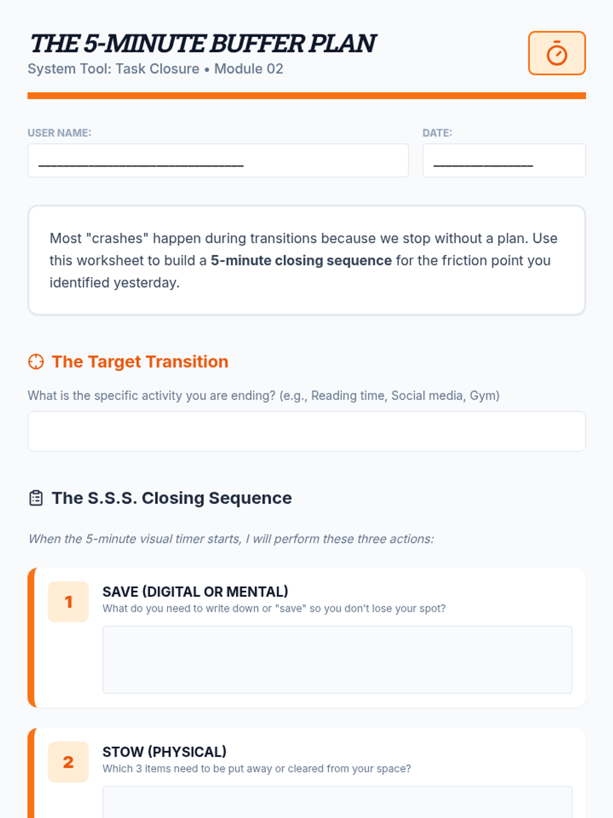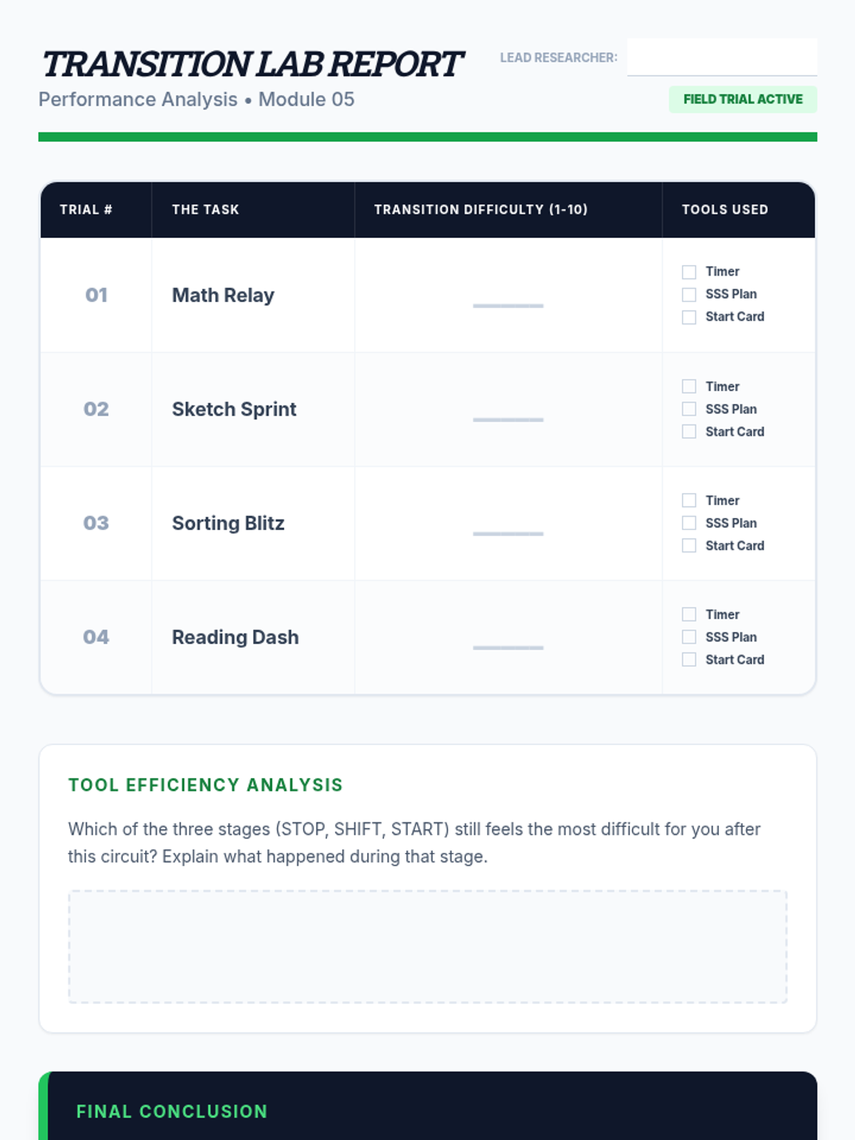 A specialized sequence for high school students focused on mastering task transitions using visual timers and organizational strategies. Students learn to analyze the mechanics of moving between tasks, use buffer zones to reduce anxiety, and develop cognitive flexibility for unexpected schedule changes.