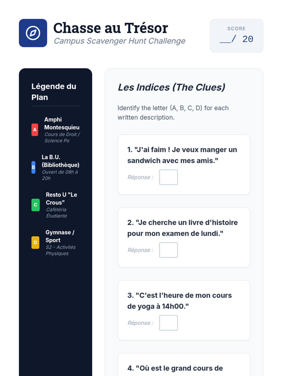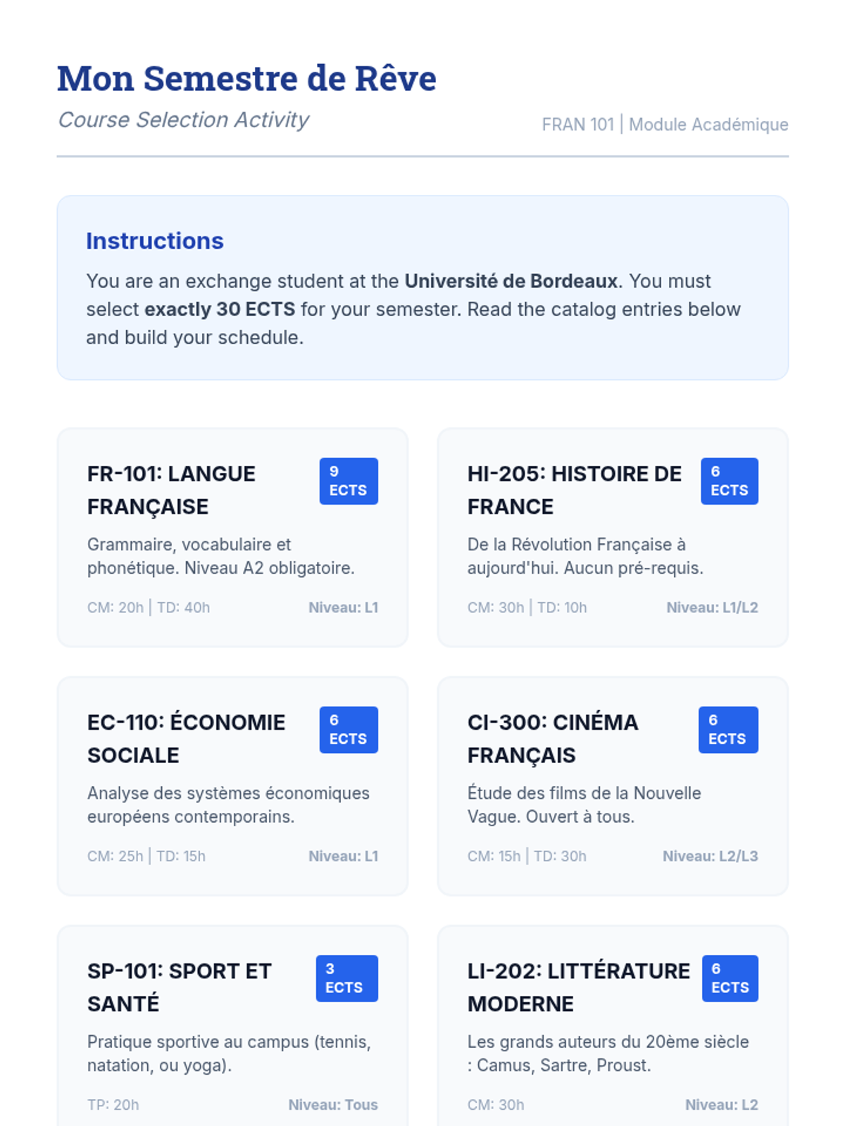 A comprehensive module for beginner French learners to navigate the administrative and academic landscape of a Francophone university, covering dates, schedules, course catalogs, and formal communication.
