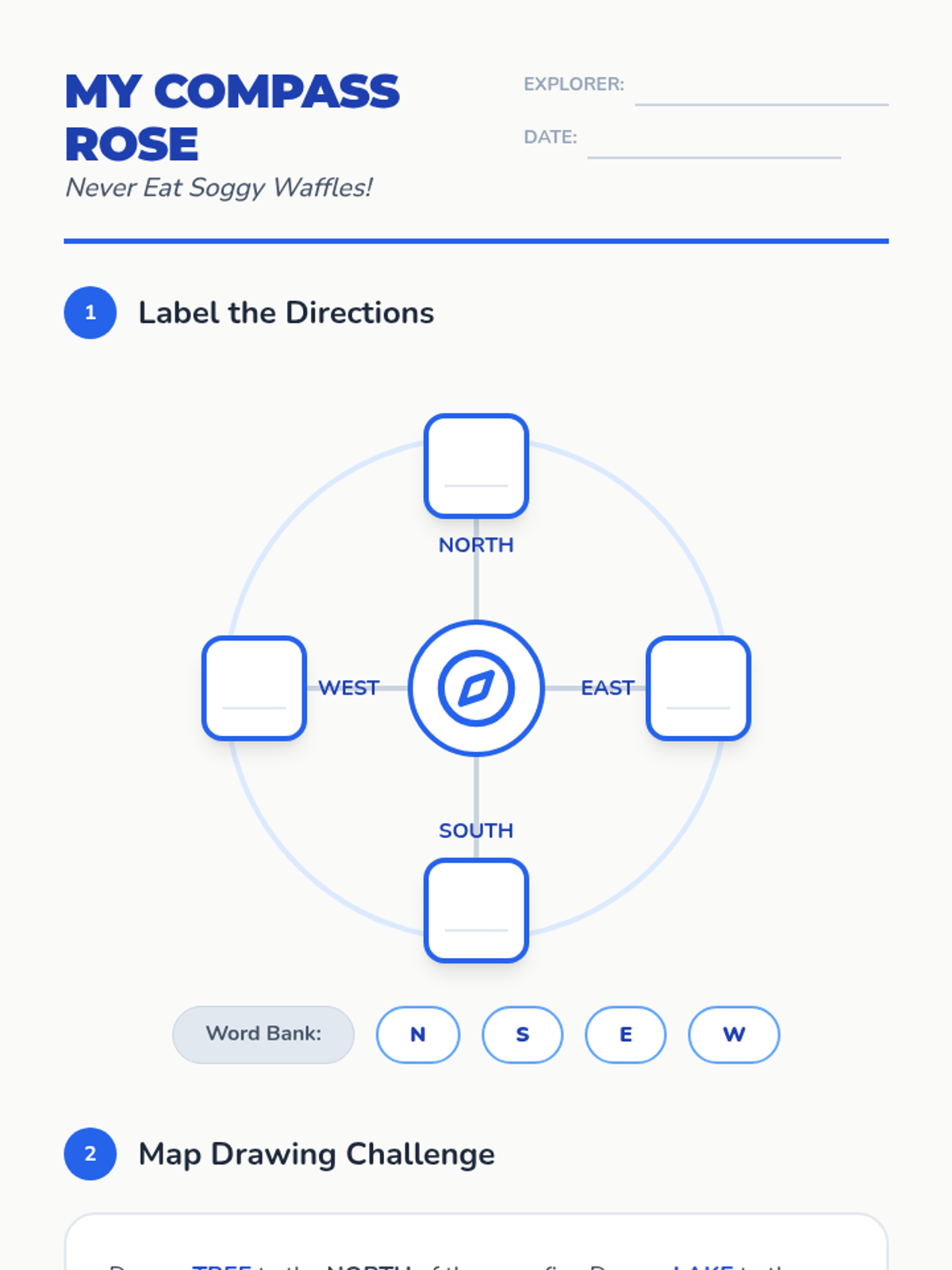 This sequence teaches 1st Grade students the fundamentals of navigation, starting with relative directional words and progressing to cardinal directions and simple alphanumeric grids. The lessons culminate in a practical scavenger hunt applying these skills.