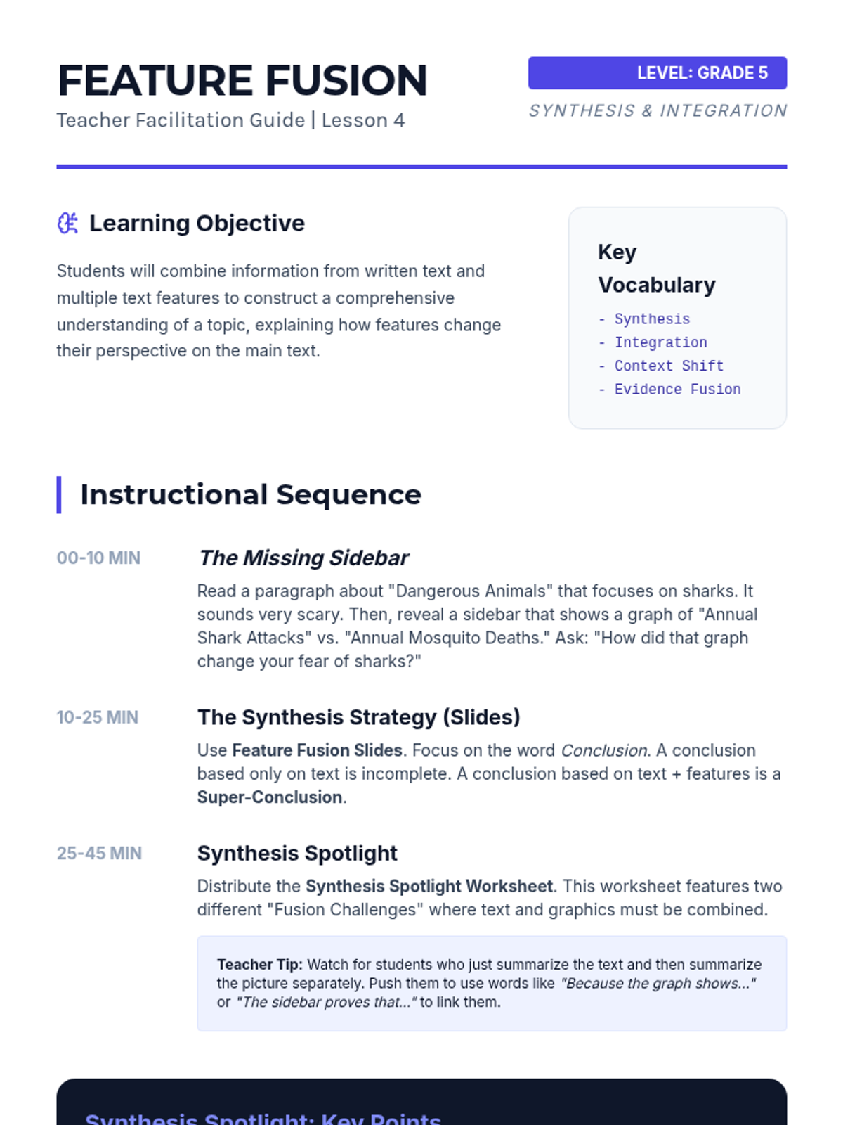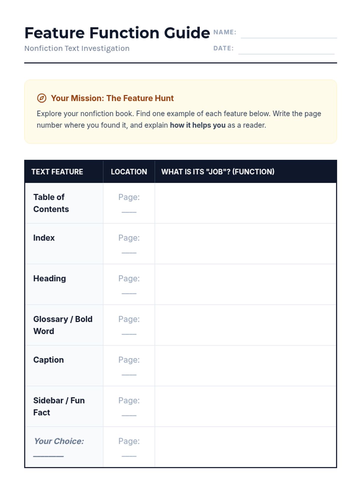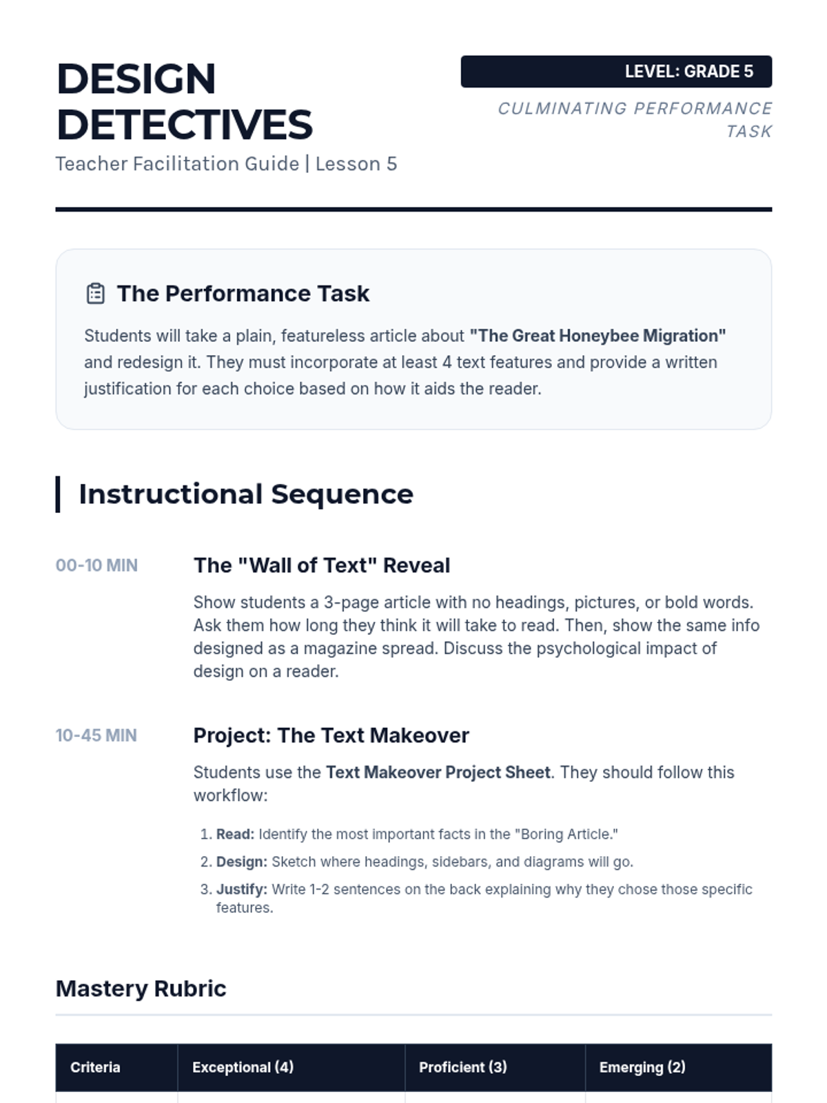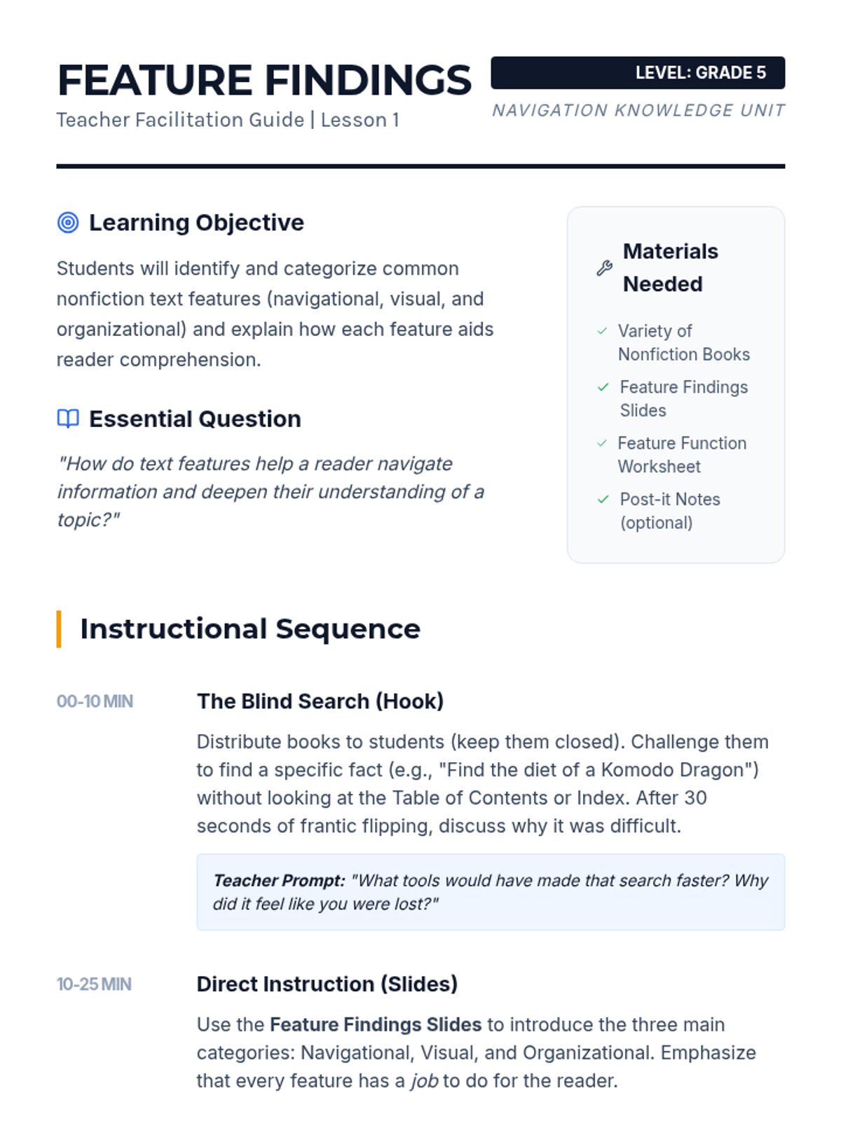 A comprehensive 5th-grade ELA unit focused on identifying, interpreting, and utilizing nonfiction text features to improve reading comprehension and informational navigation. Students move from basic identification to complex synthesis and design of informational texts.