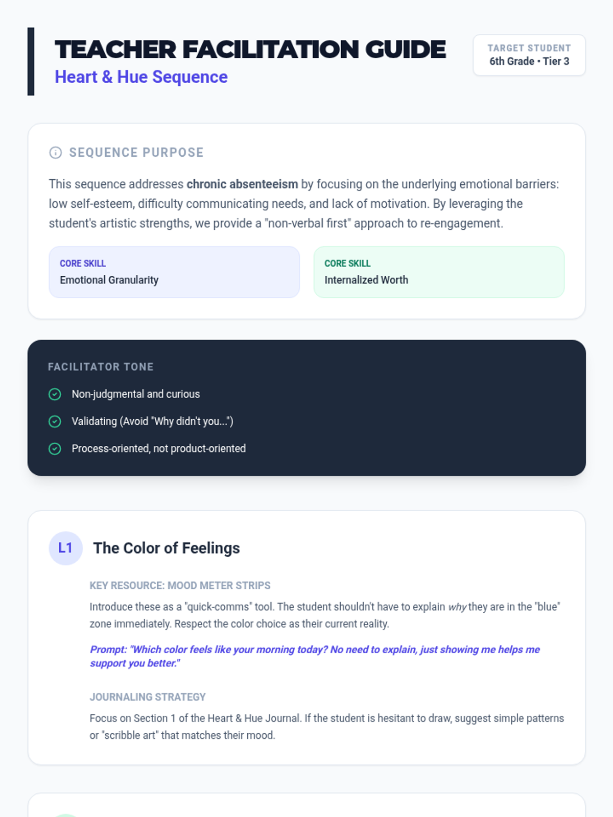 A therapeutic, art-integrated sequence designed for a Tier 3 student struggling with attendance, self-esteem, and emotional communication. This sequence uses creative expression to help the student identify emotions, recognize personal strengths, and set small, achievable goals for school engagement.