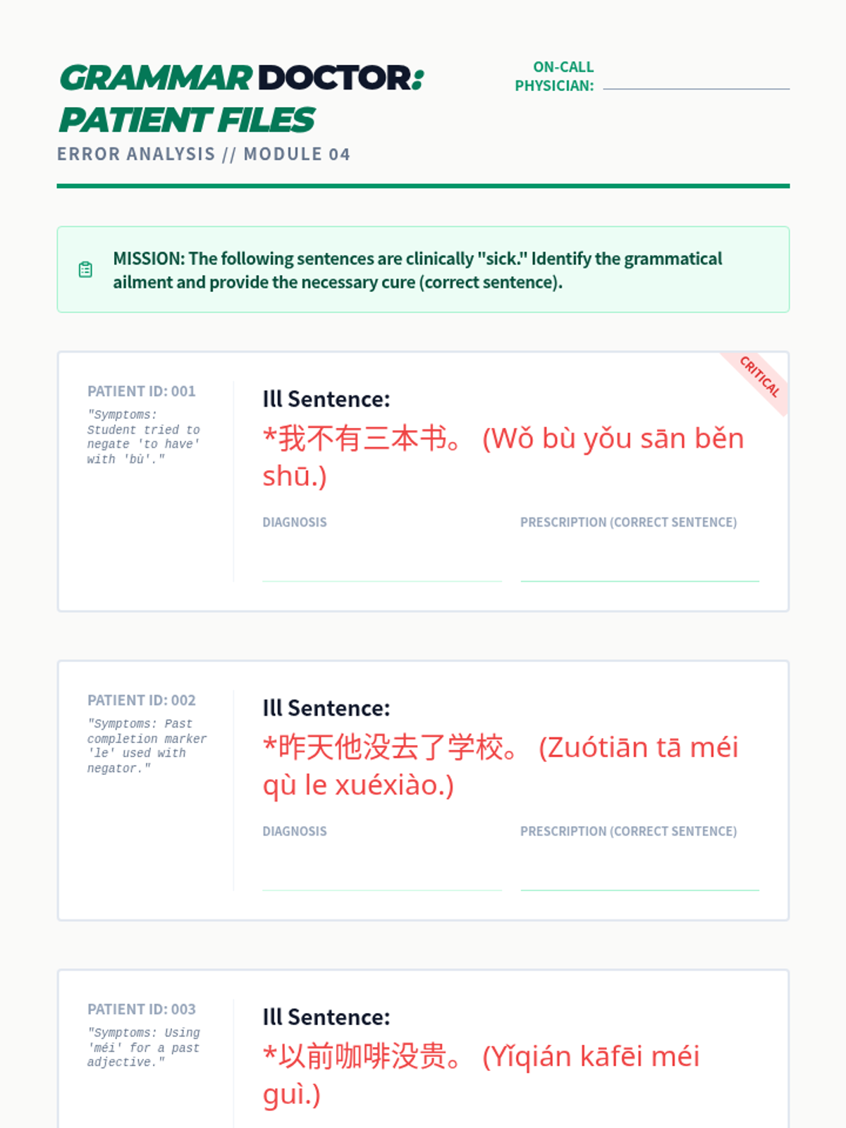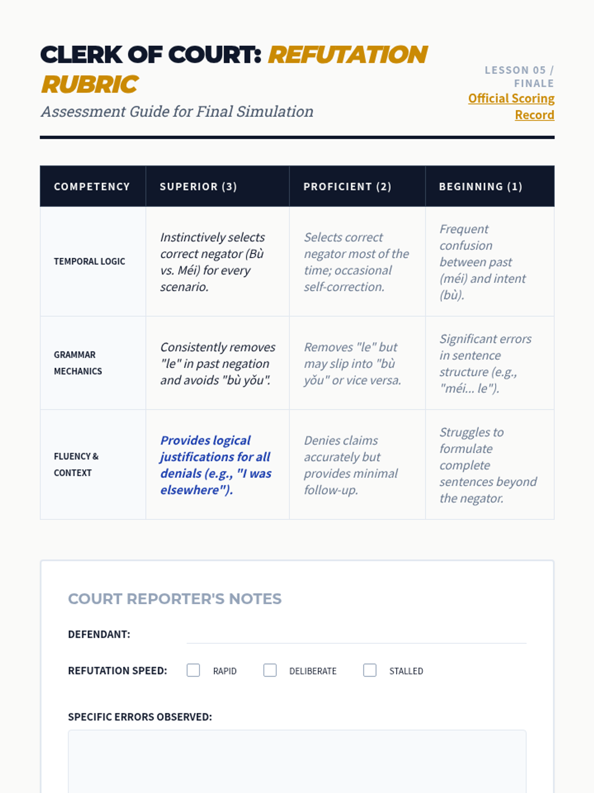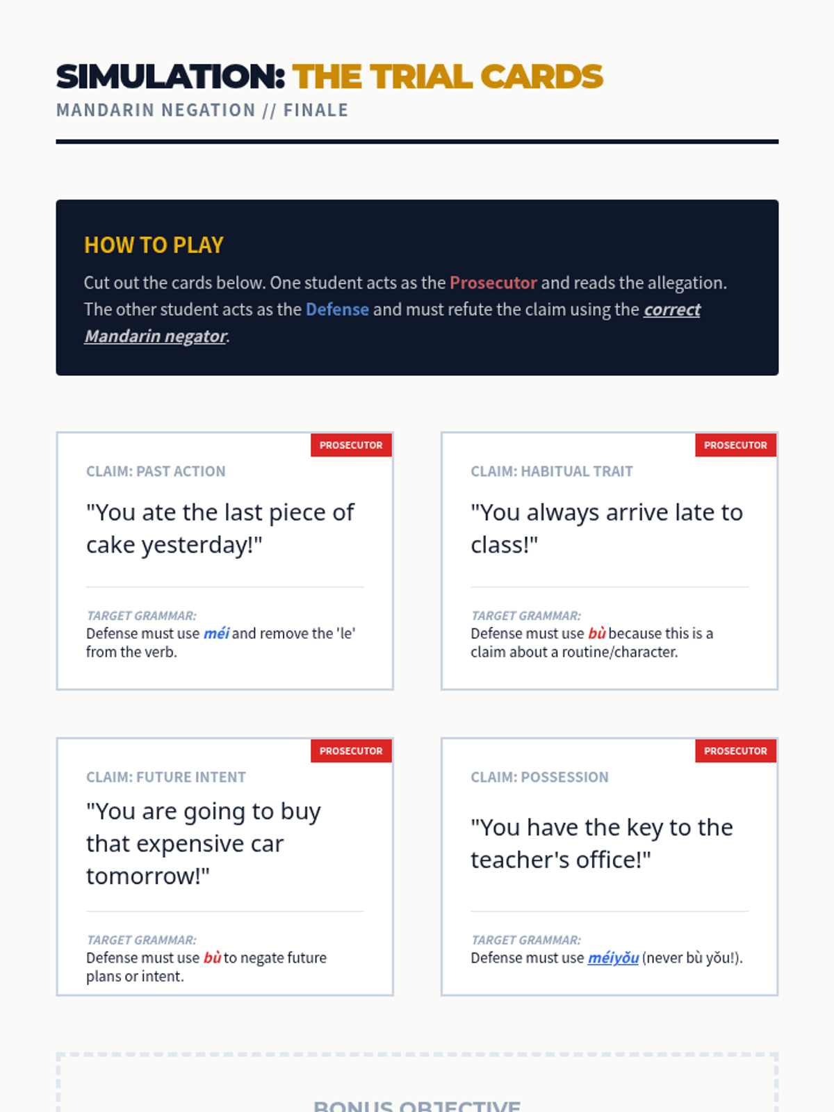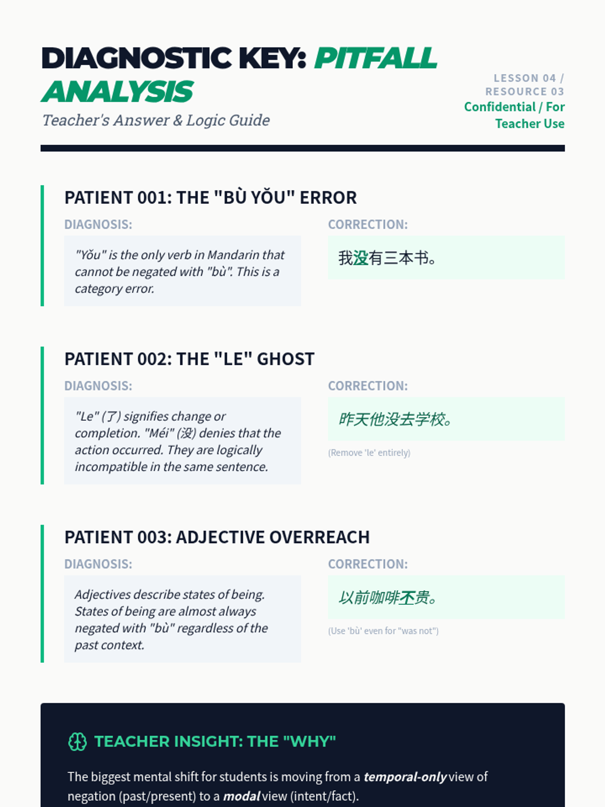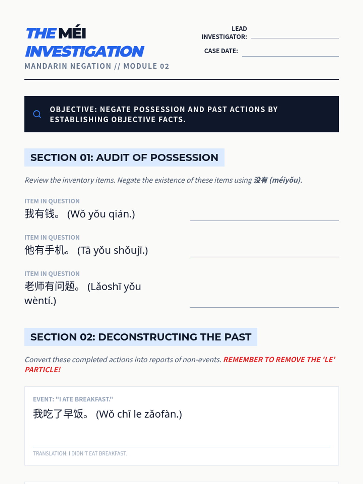 A comprehensive series exploring the rules of negation in Mandarin Chinese, focusing on the distinction between 'bù' (subjective/habitual/future) and 'méi' (objective/past/possession). Students learn to navigate temporal and modal contexts to select the correct negator.