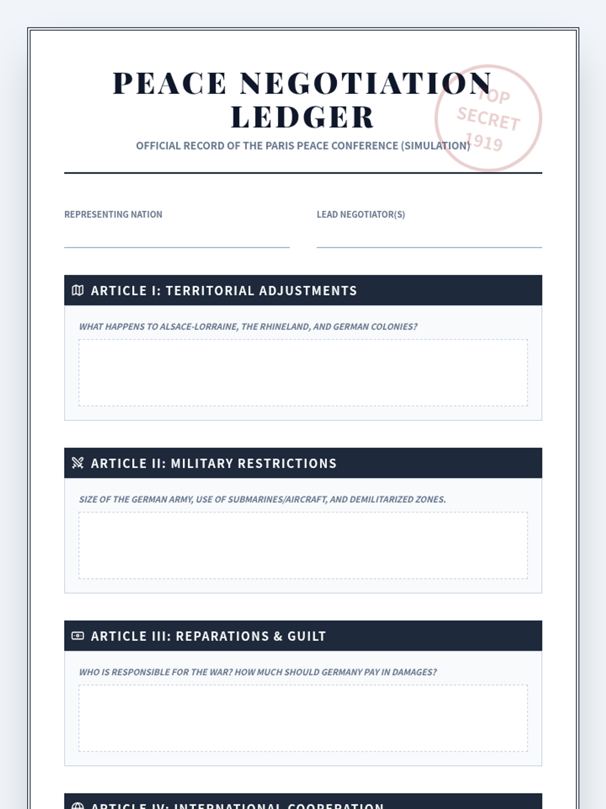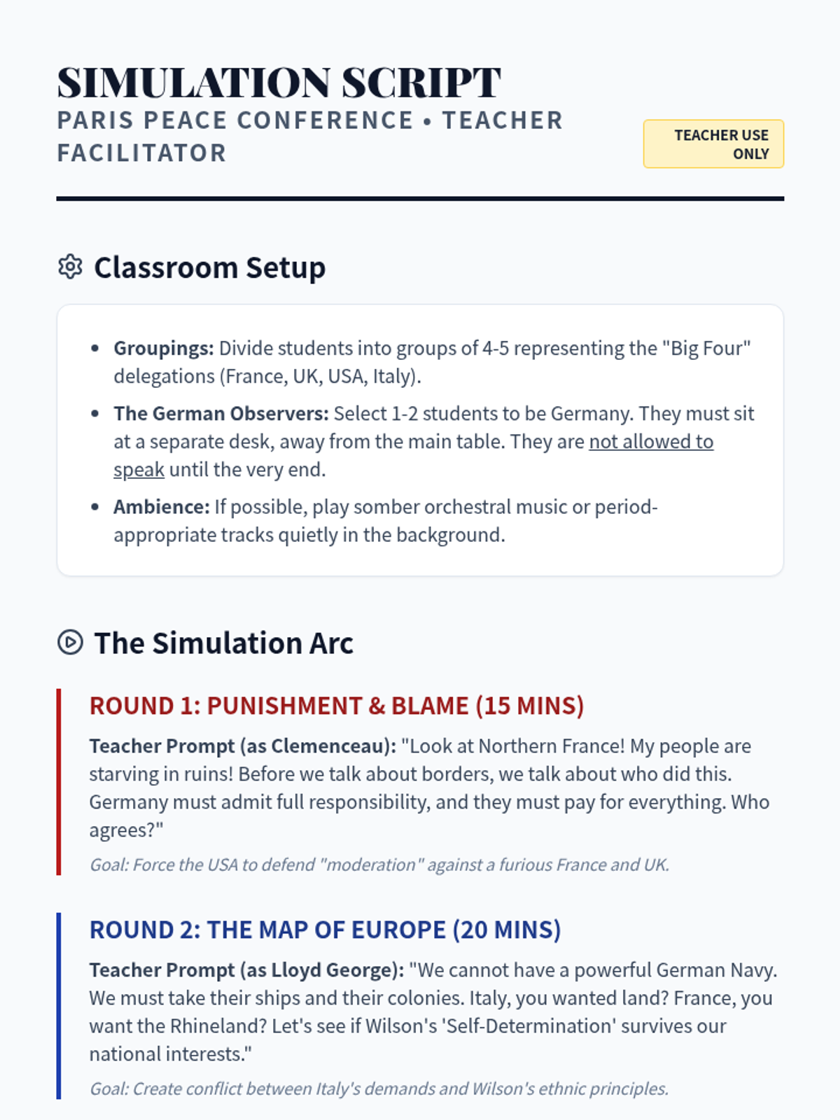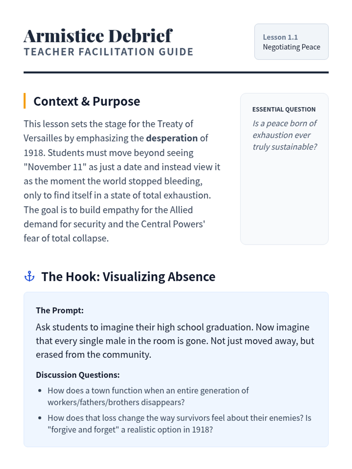A 10th-grade history sequence exploring the end of World War I, the Paris Peace Conference, and the resulting Treaty of Versailles. Students engage in a diplomatic simulation and analyze the long-term consequences of the peace terms and the League of Nations.