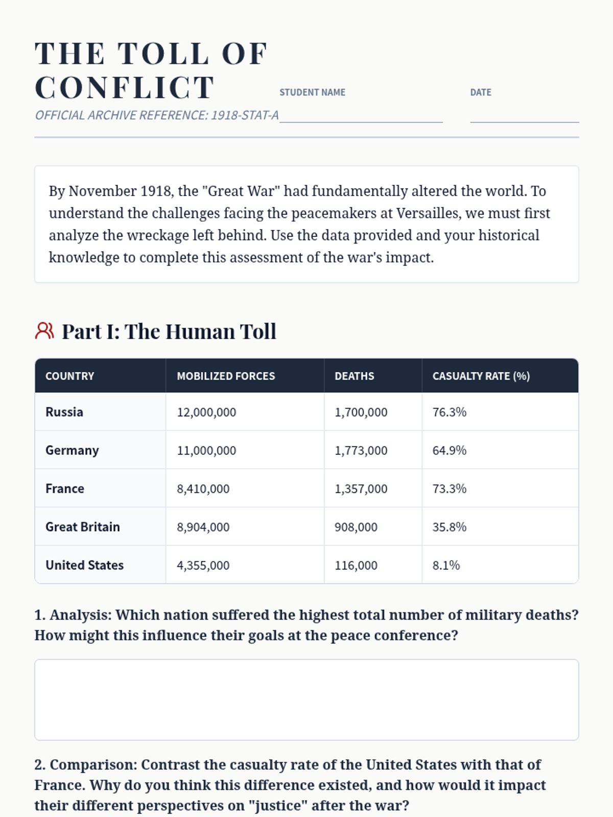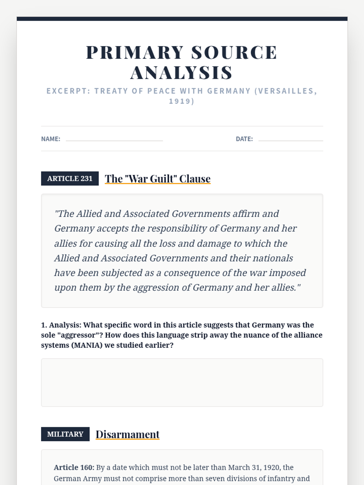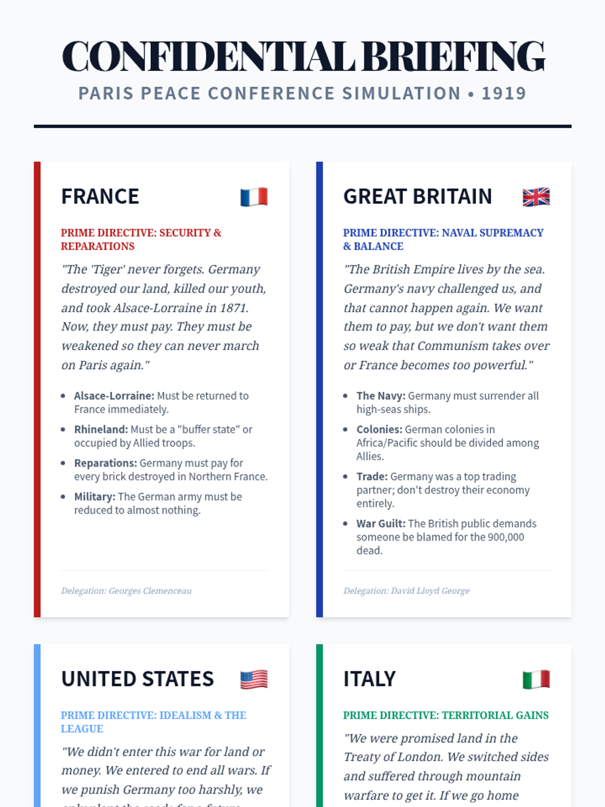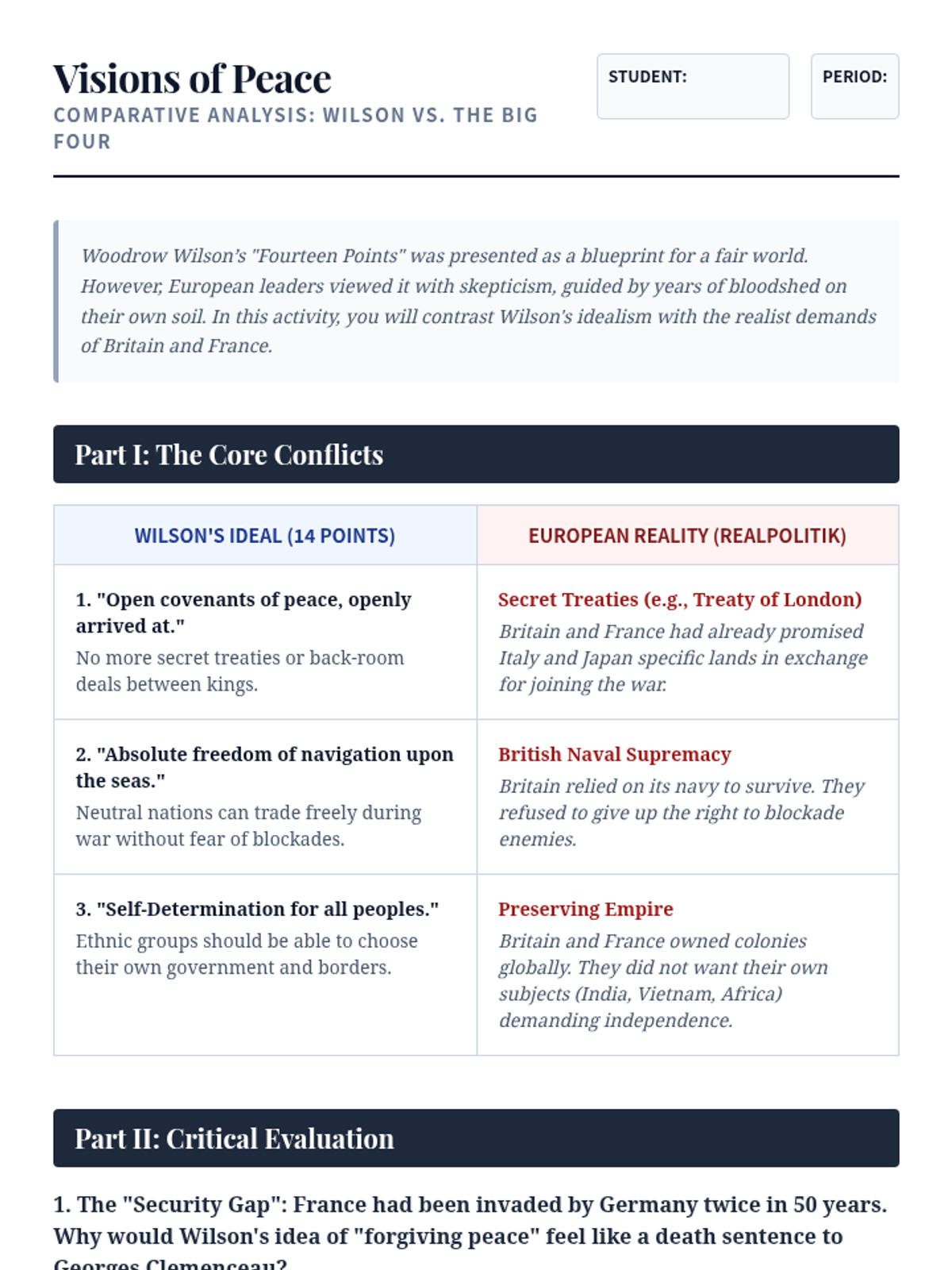 A 10th-grade history sequence exploring the end of World War I, the Paris Peace Conference, and the resulting Treaty of Versailles. Students engage in a diplomatic simulation and analyze the long-term consequences of the peace terms and the League of Nations.