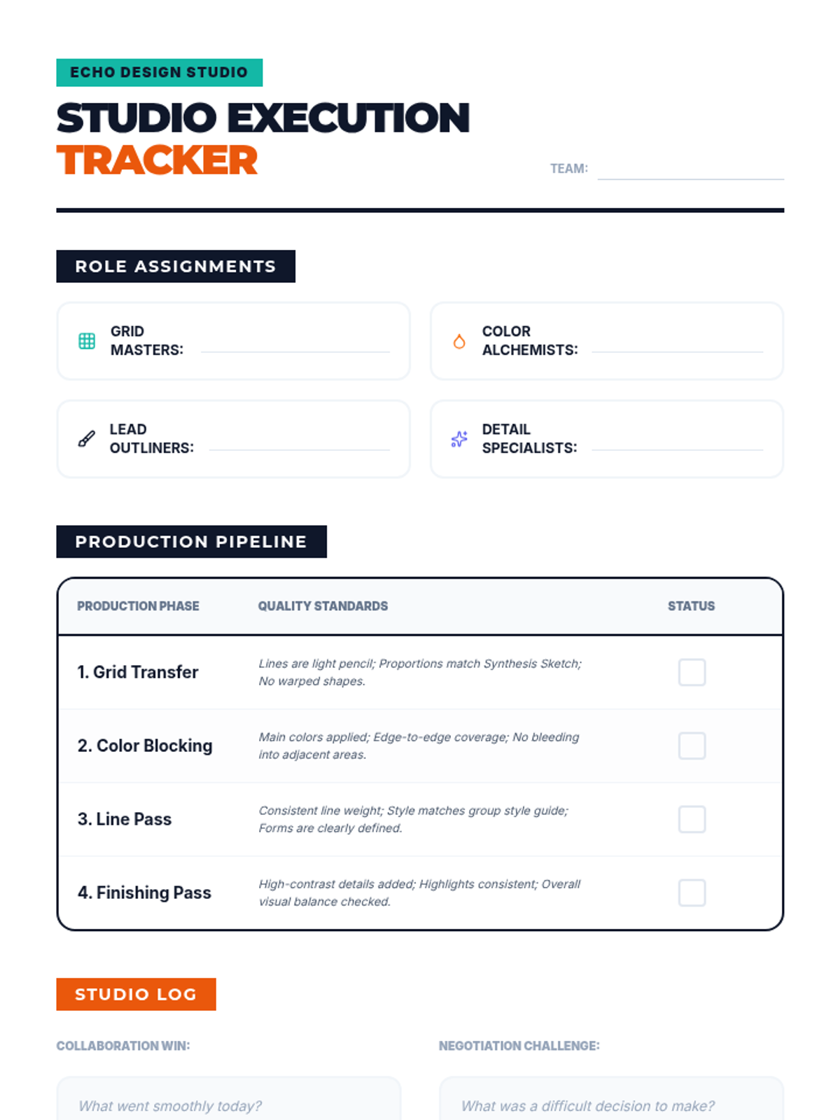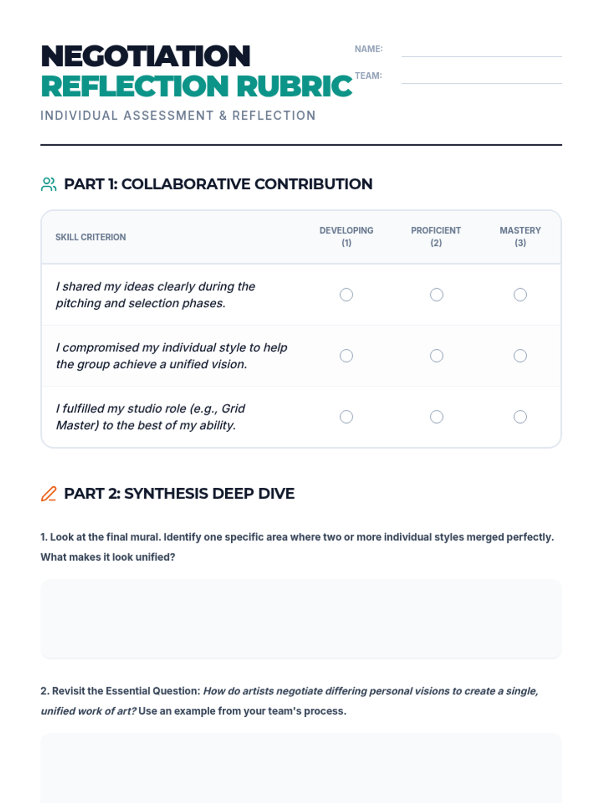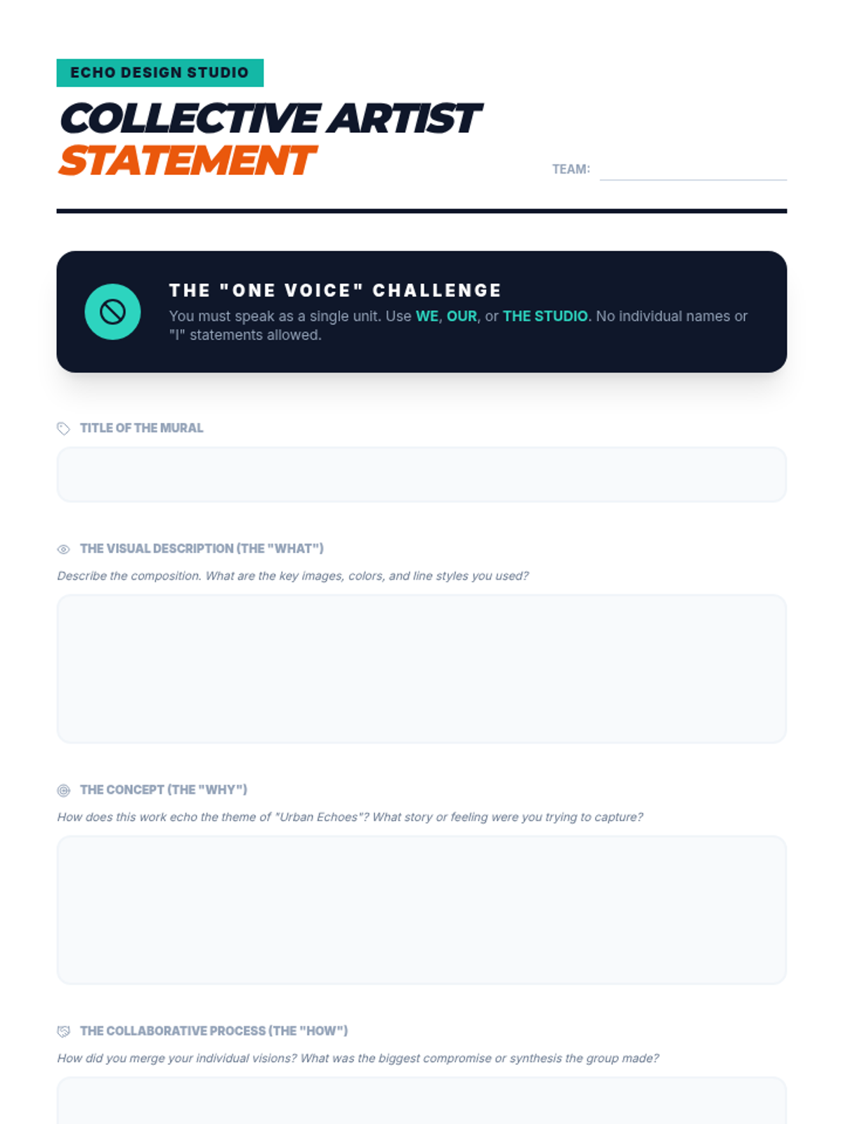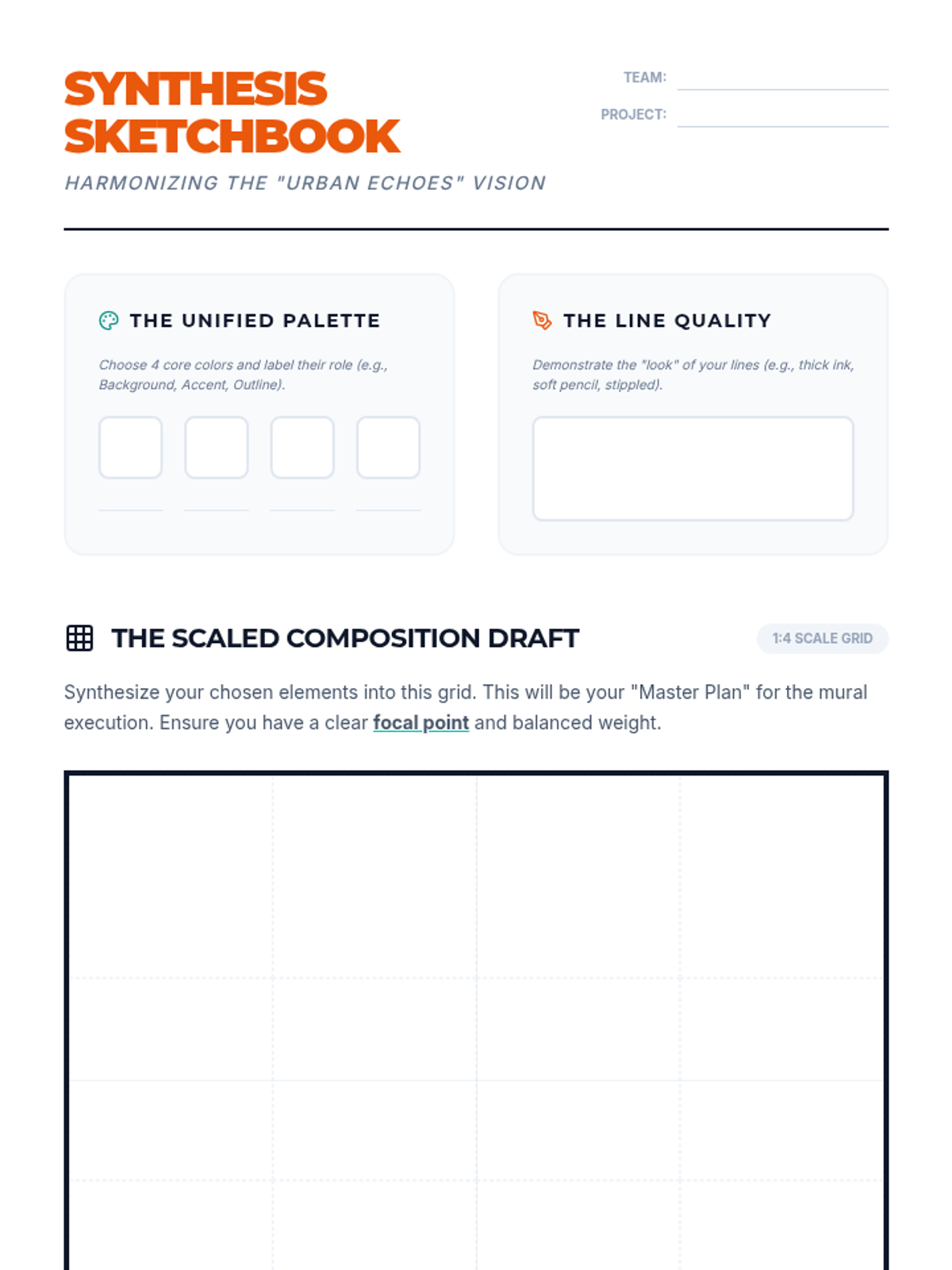 This sequence guides 8th-grade students through the collaborative design process, from individual divergent brainstorming to the collective execution of a unified visual work. Students learn to navigate the complexities of shared vision, compromise, and aesthetic synthesis.