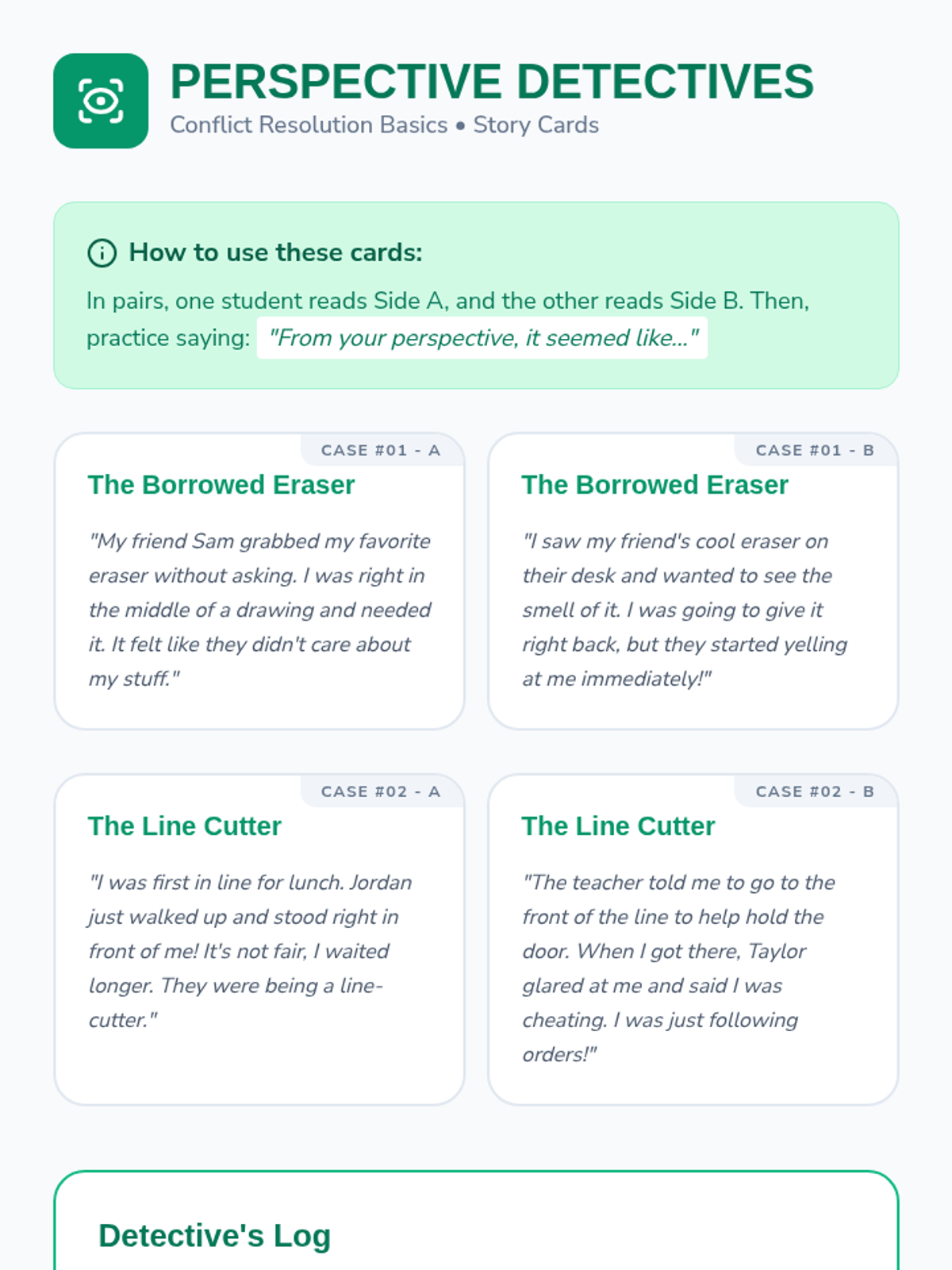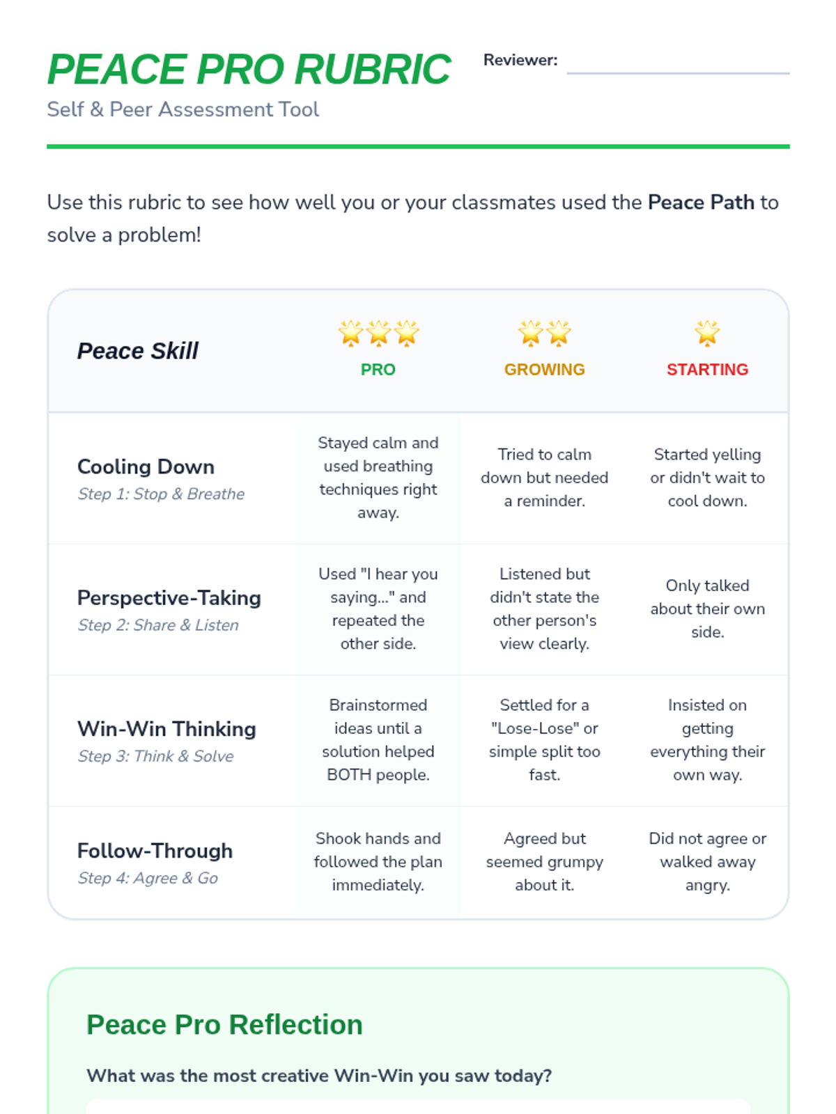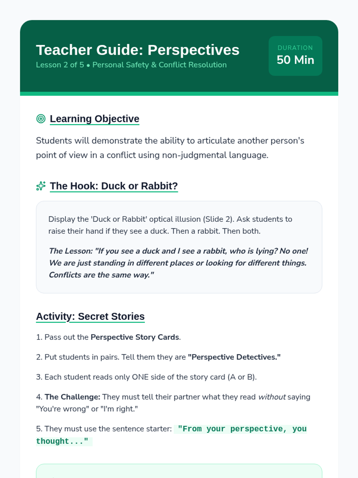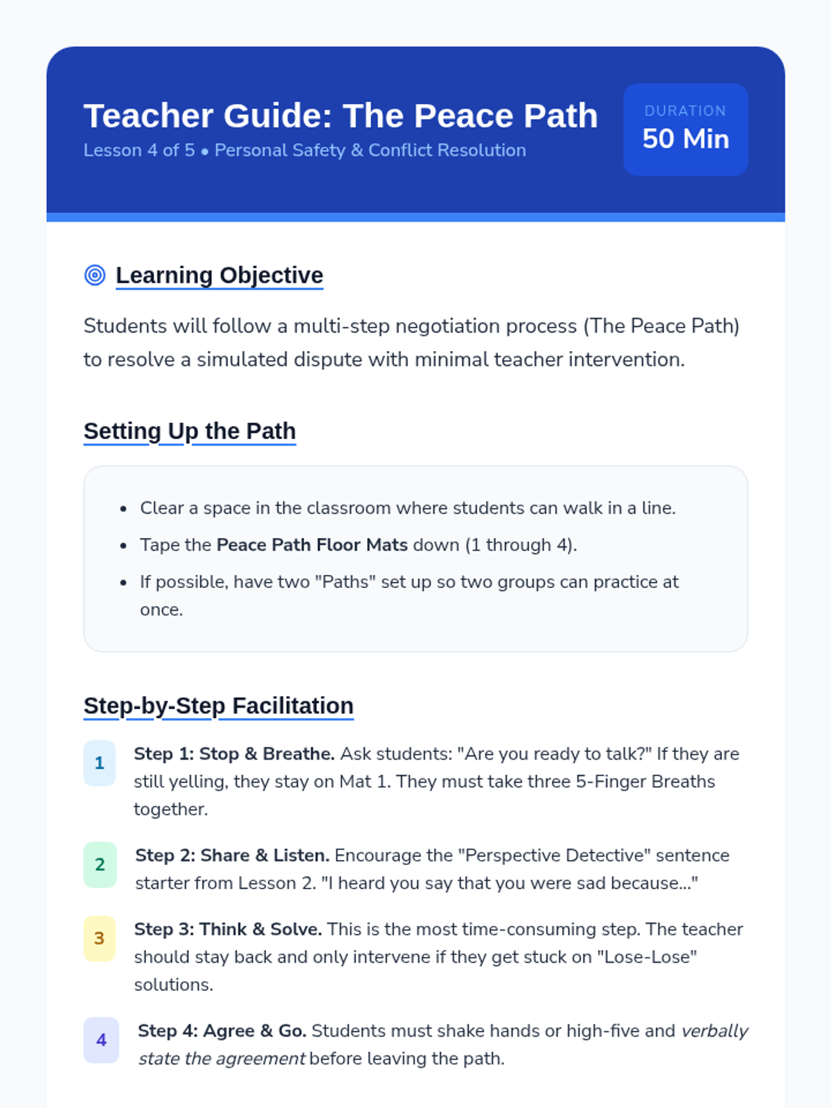 Students move from reactive emotional responses to proactive negotiation. They learn de-escalation, empathy through perspective-taking, and a structured 4-step 'Peace Path' to resolve playground and classroom conflicts independently.
