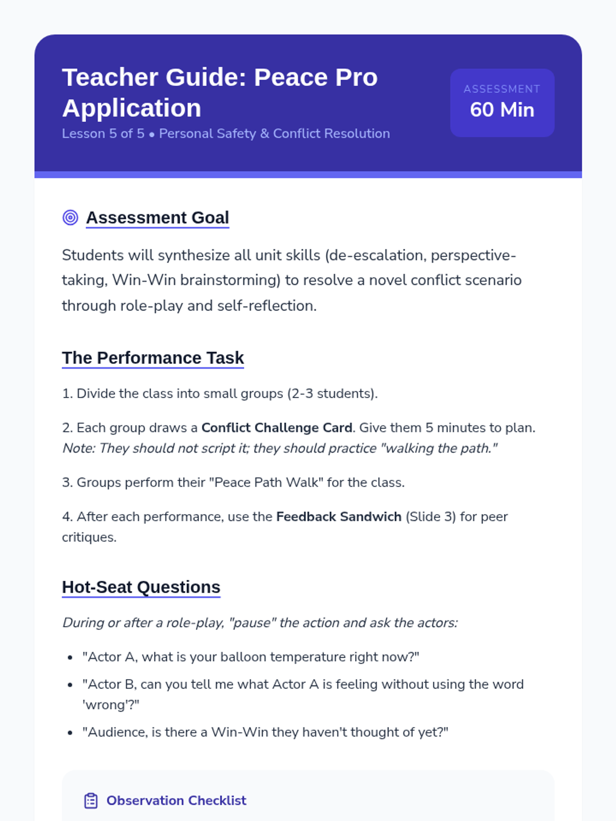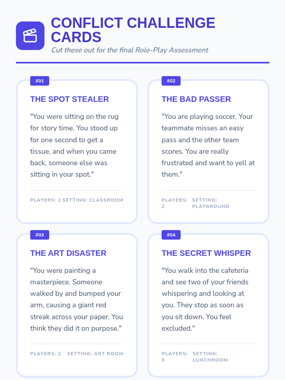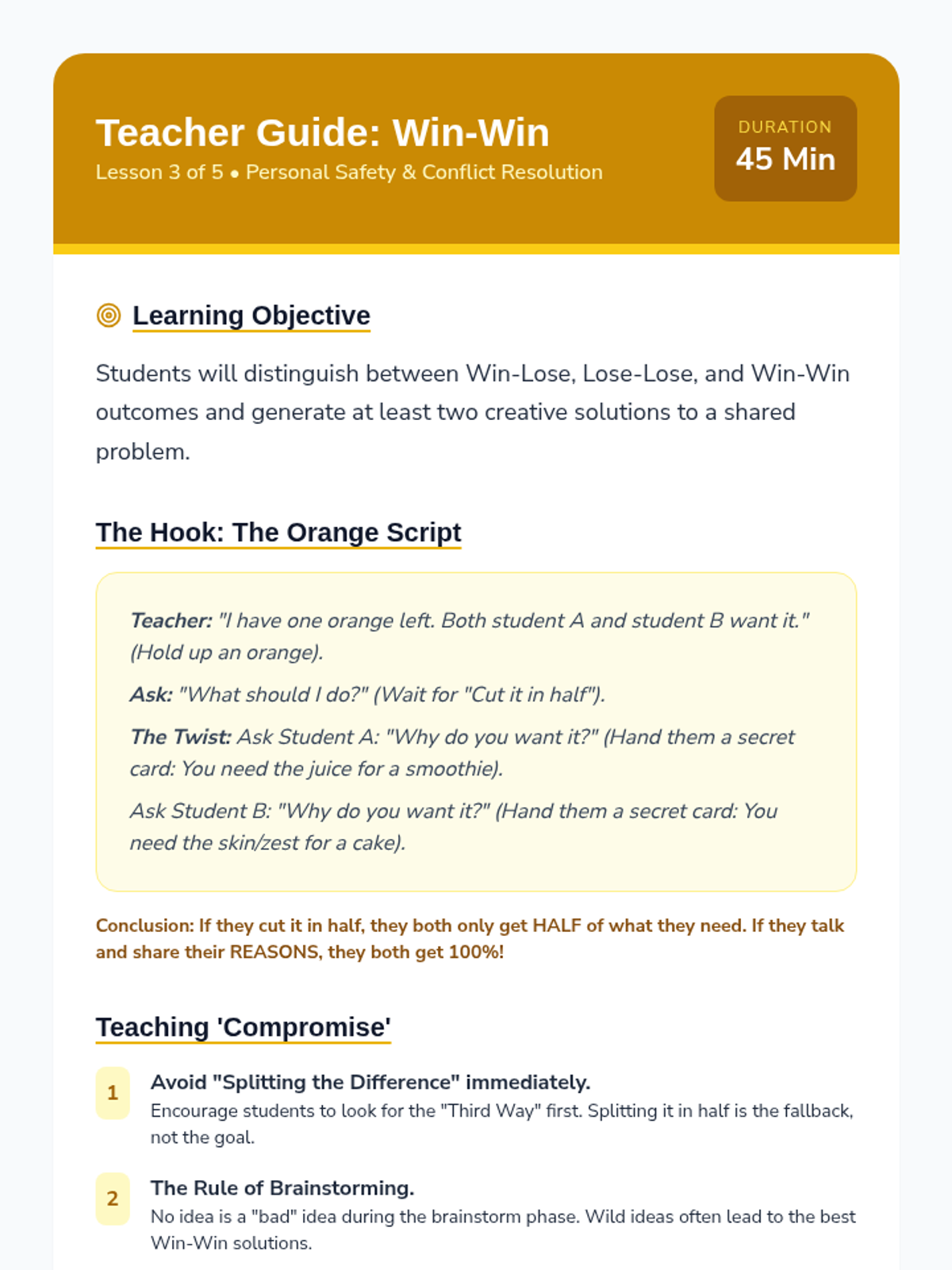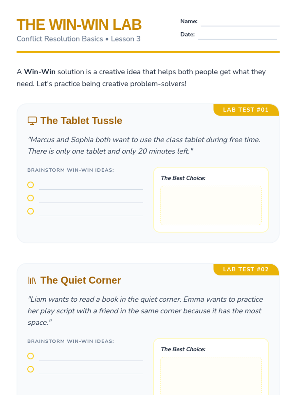 Students move from reactive emotional responses to proactive negotiation. They learn de-escalation, empathy through perspective-taking, and a structured 4-step 'Peace Path' to resolve playground and classroom conflicts independently.
