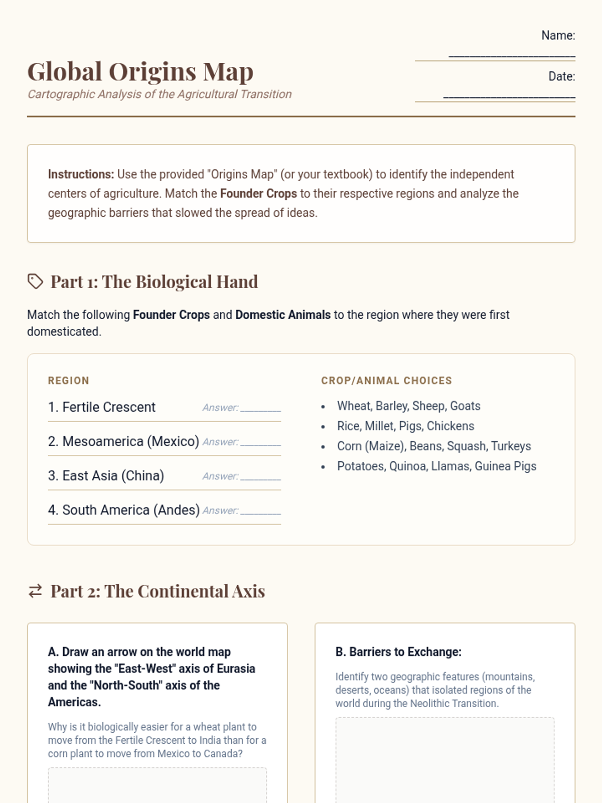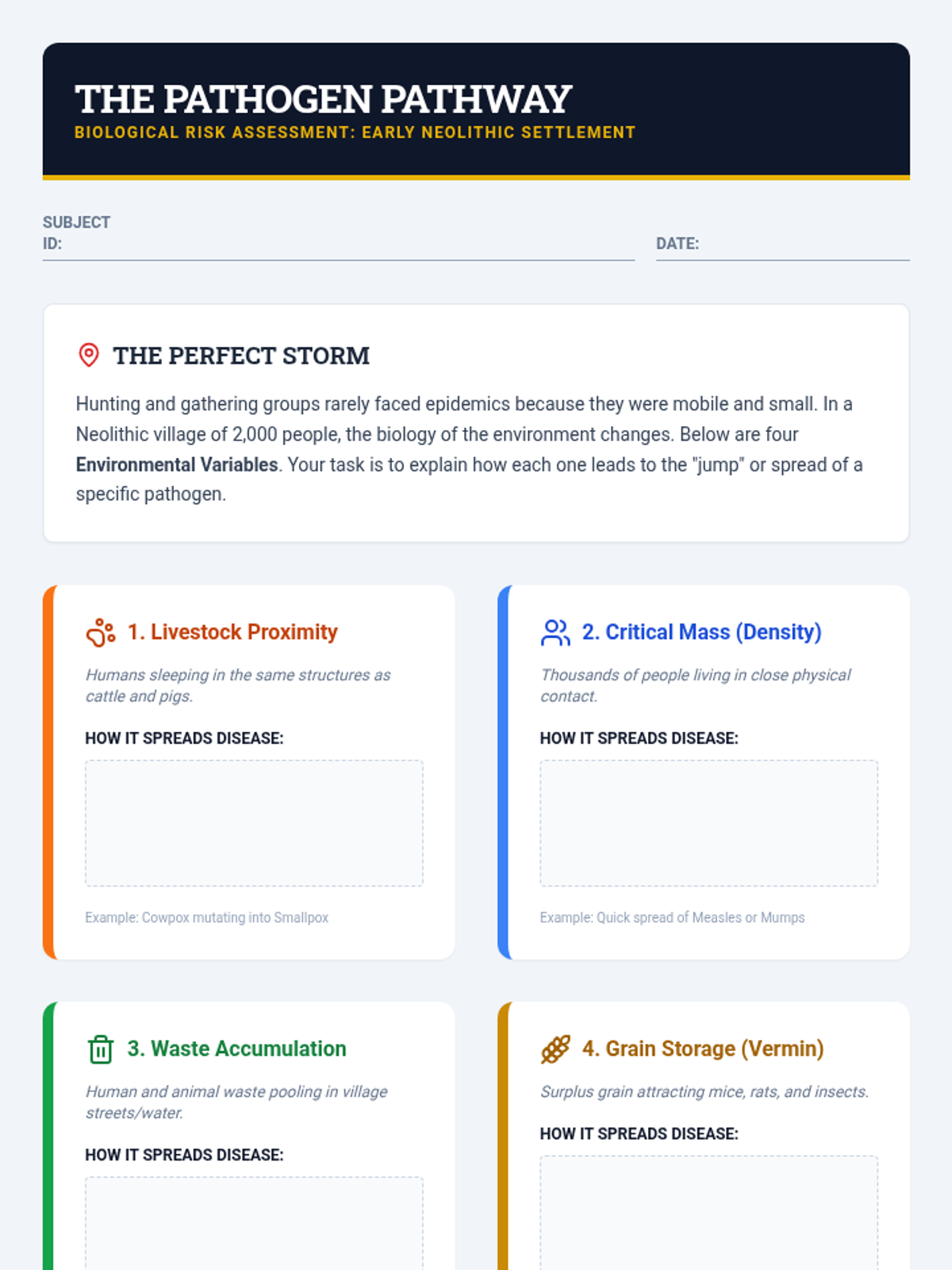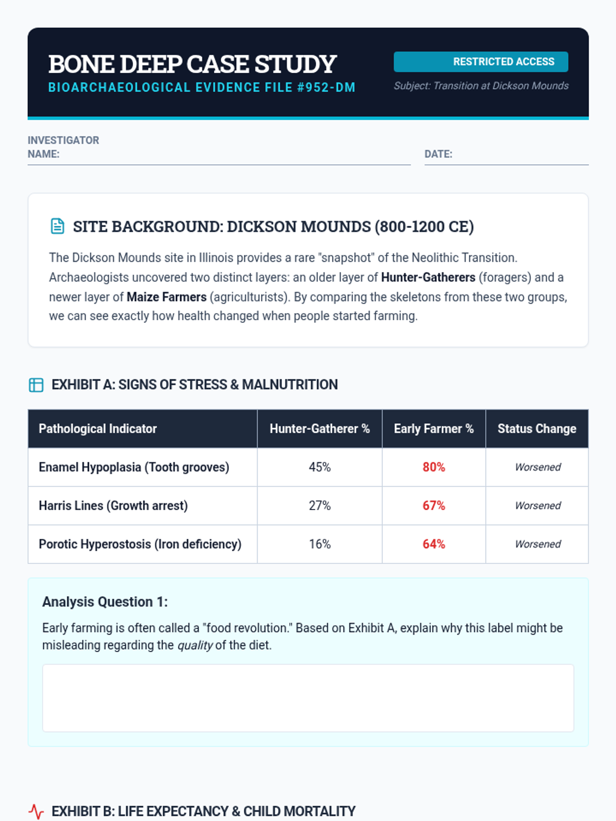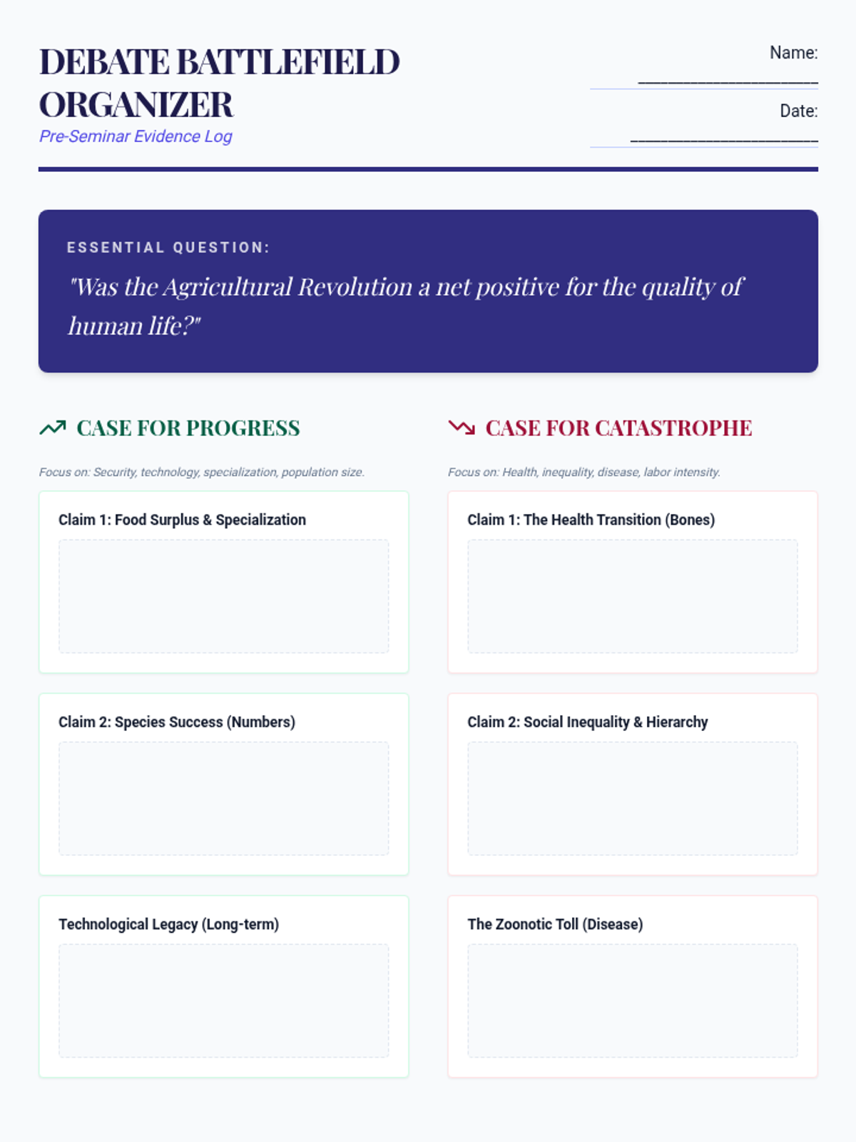 Students critically analyze the monumental shift from foraging to farming, examining the trade-offs: the rise of infectious disease, labor intensity, nutritional decline, and social inequality. Through comparative studies of early agricultural sites and hunter-gatherer health, students engage in high-level debates about the costs and benefits of civilization.