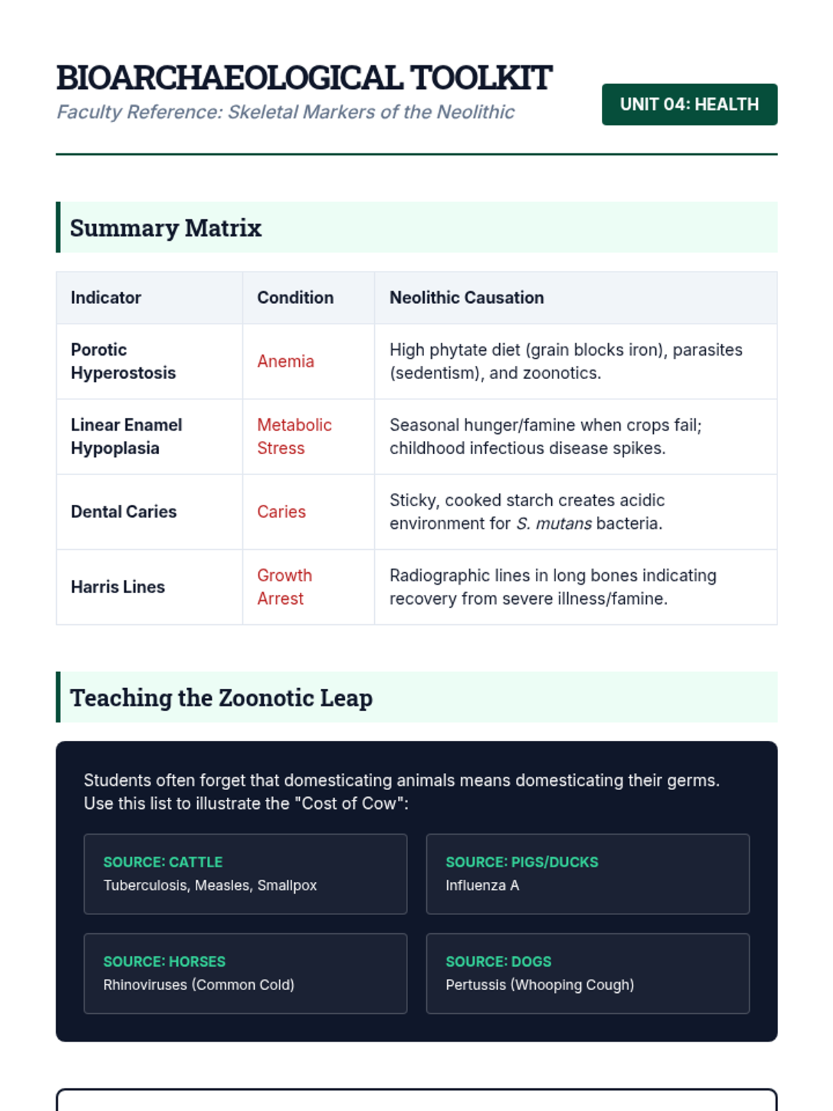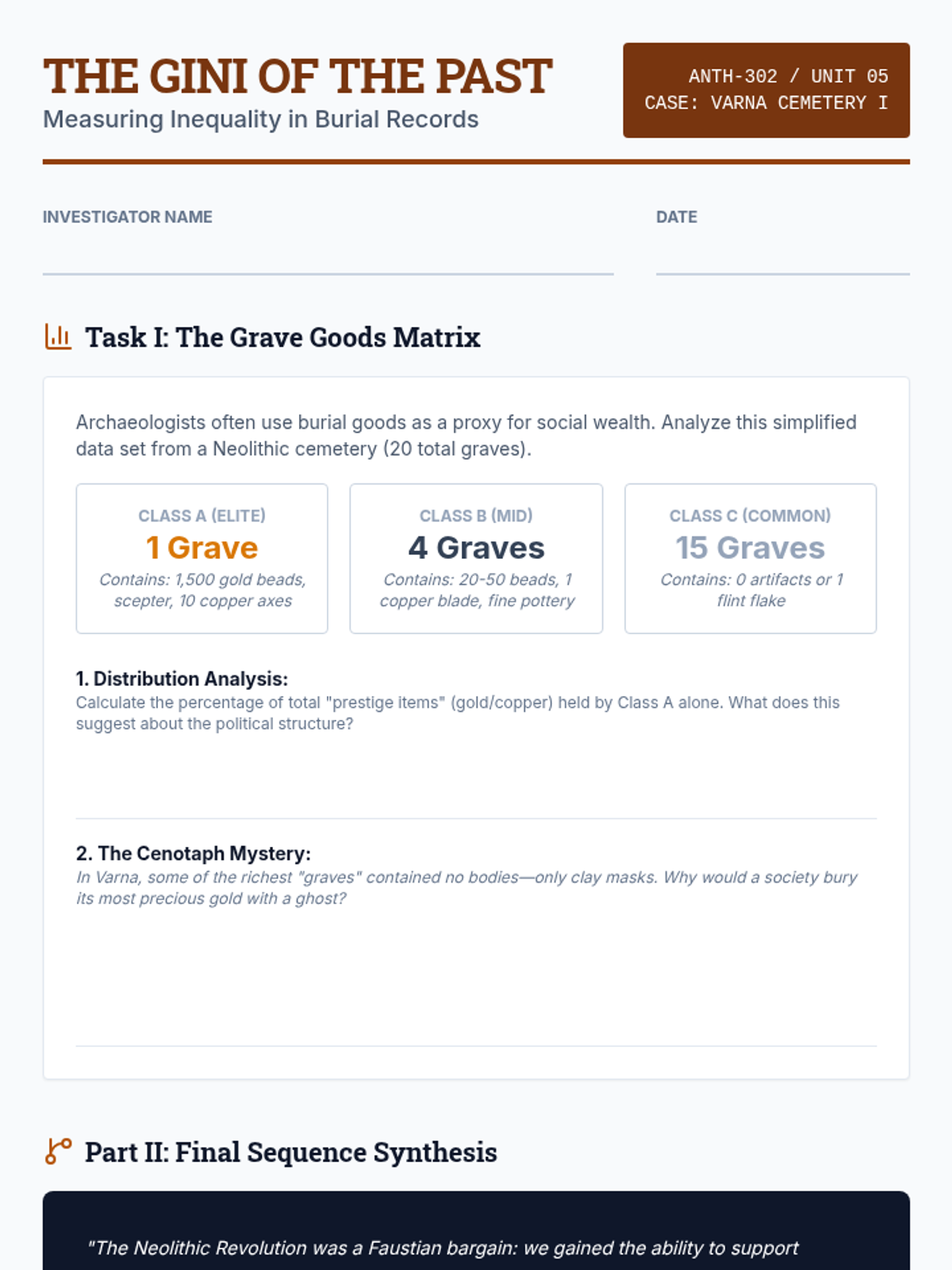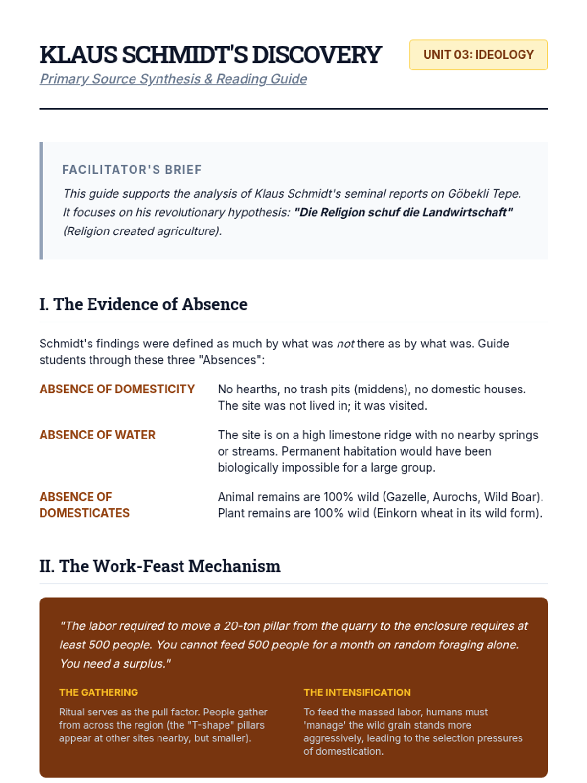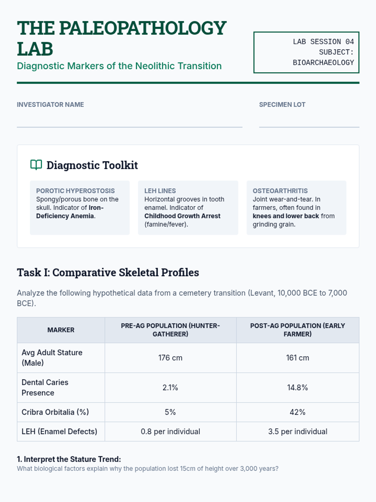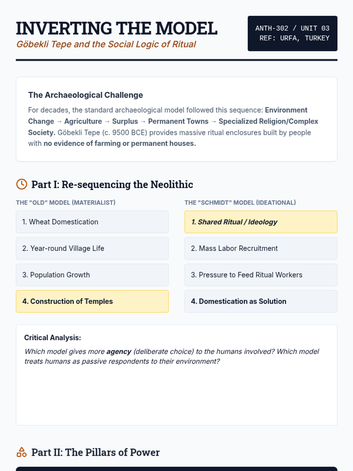 This sequence explores the transition from foraging to farming, analyzing domestication theories, early sedentary cultures like the Natufians, the ideological impact of Gobekli Tepe, and the bioarchaeological evidence of agricultural costs, culminating in the rise of social stratification.