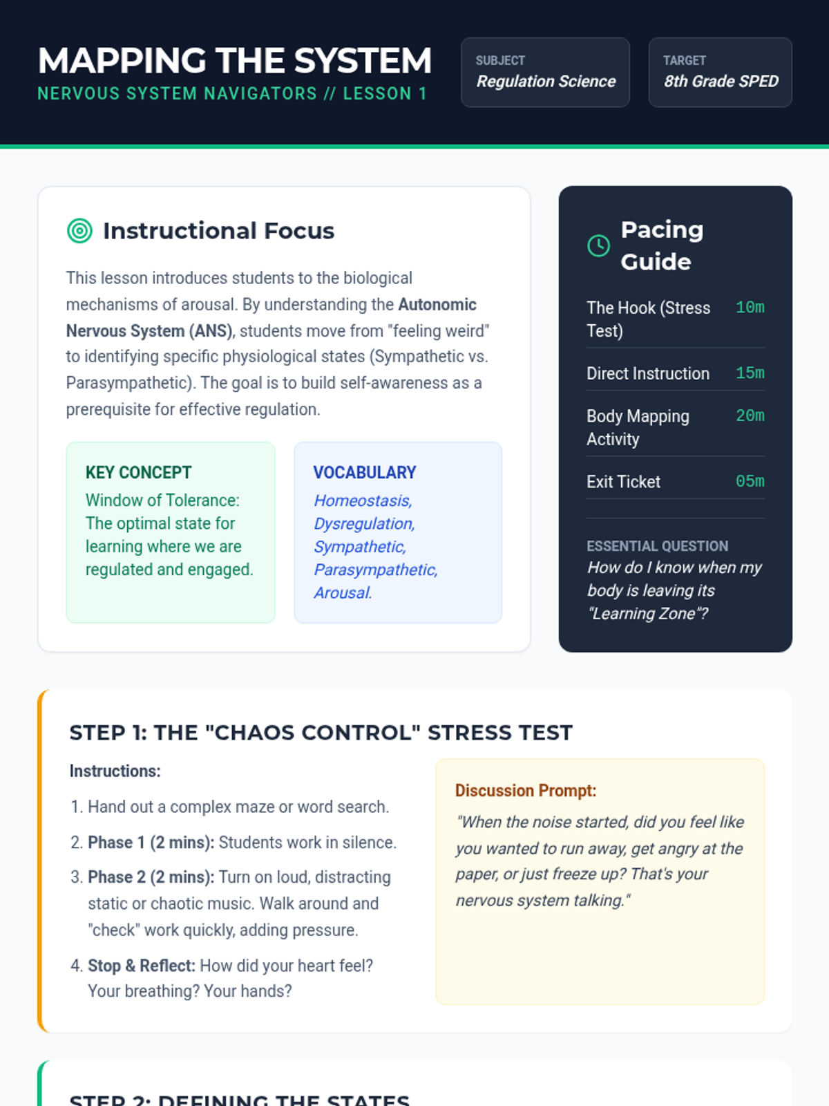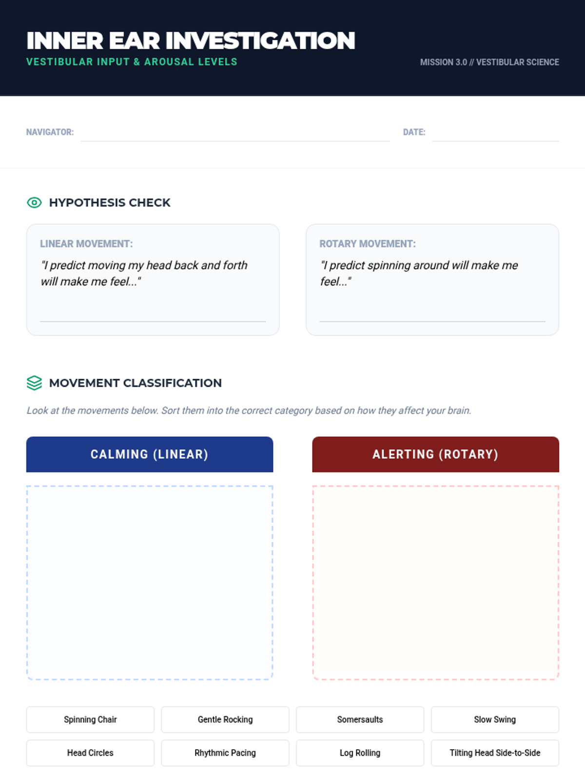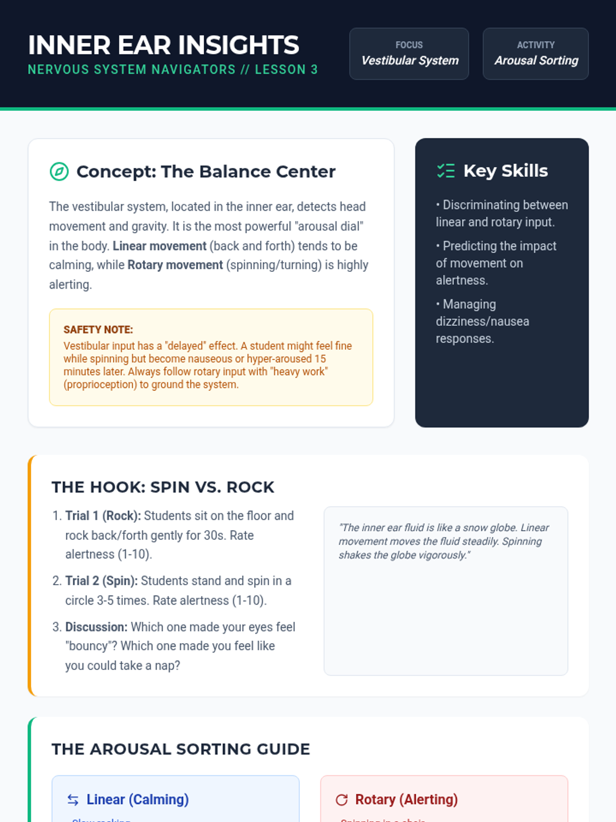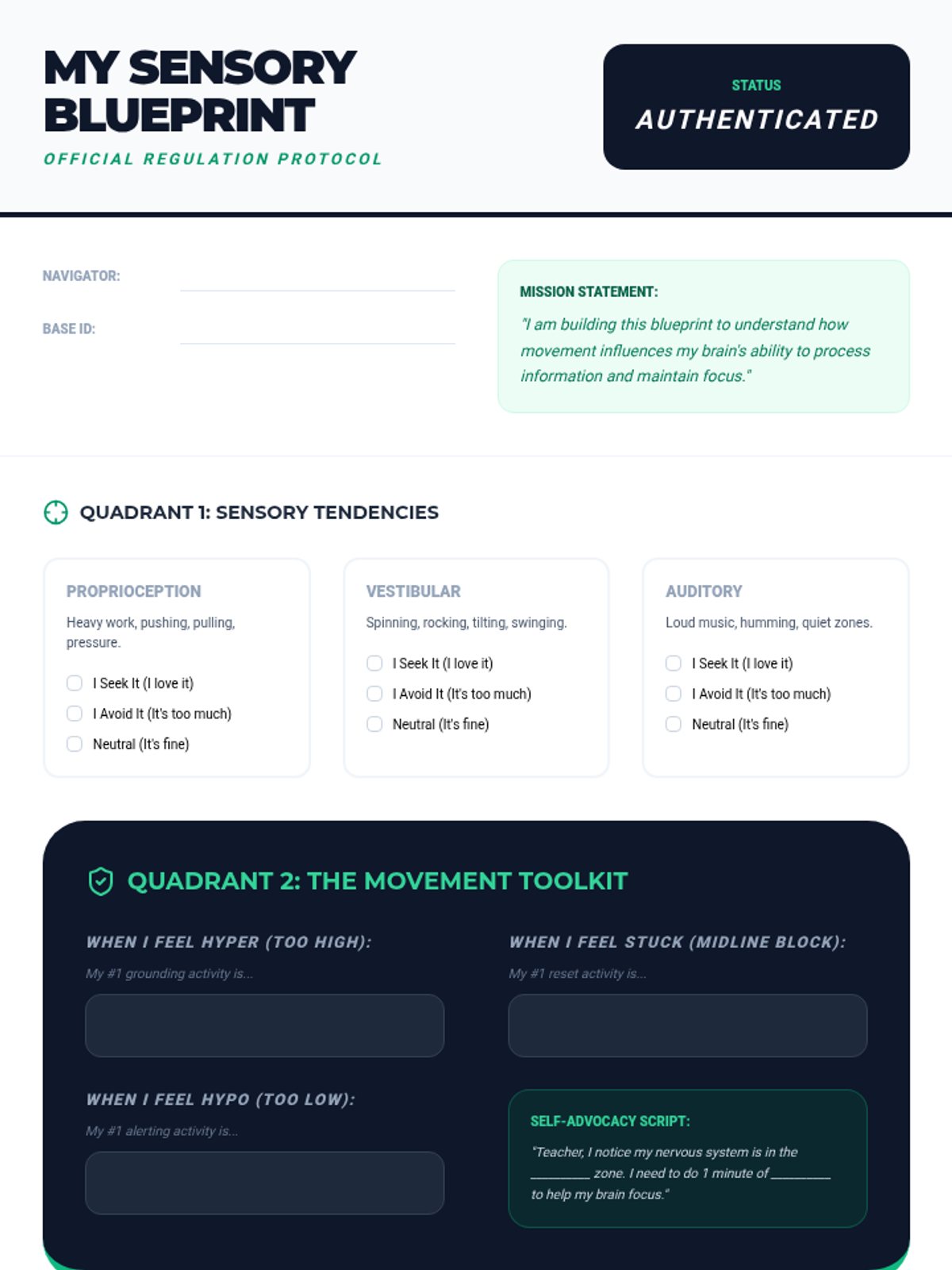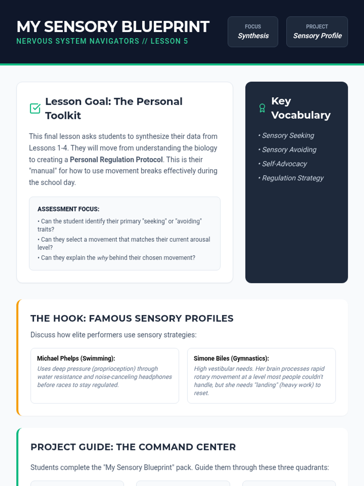 A comprehensive exploration of the physiological mechanics of sensory processing and self-regulation. Students learn to identify their arousal levels, understand the biological impact of movement, and create personalized strategies for maintaining focus through proprioceptive and vestibular input.