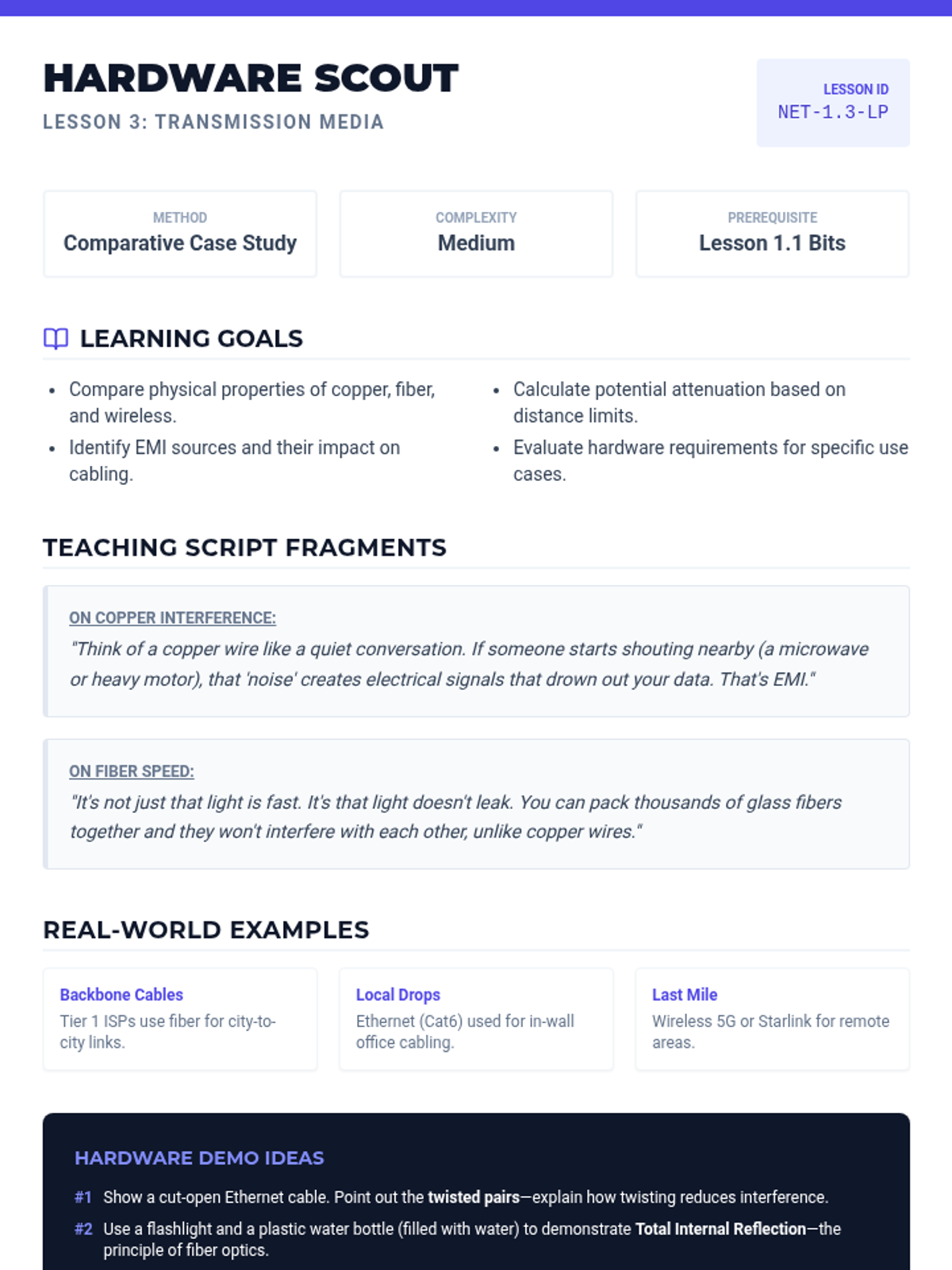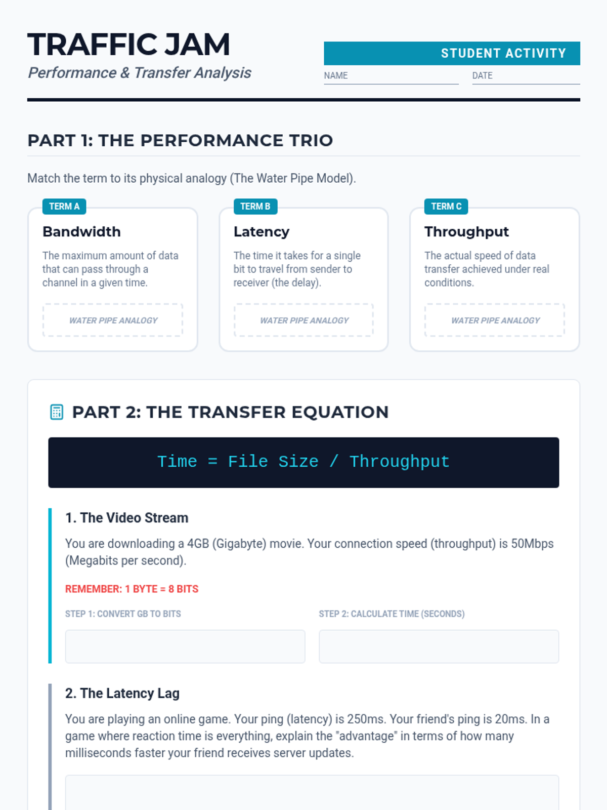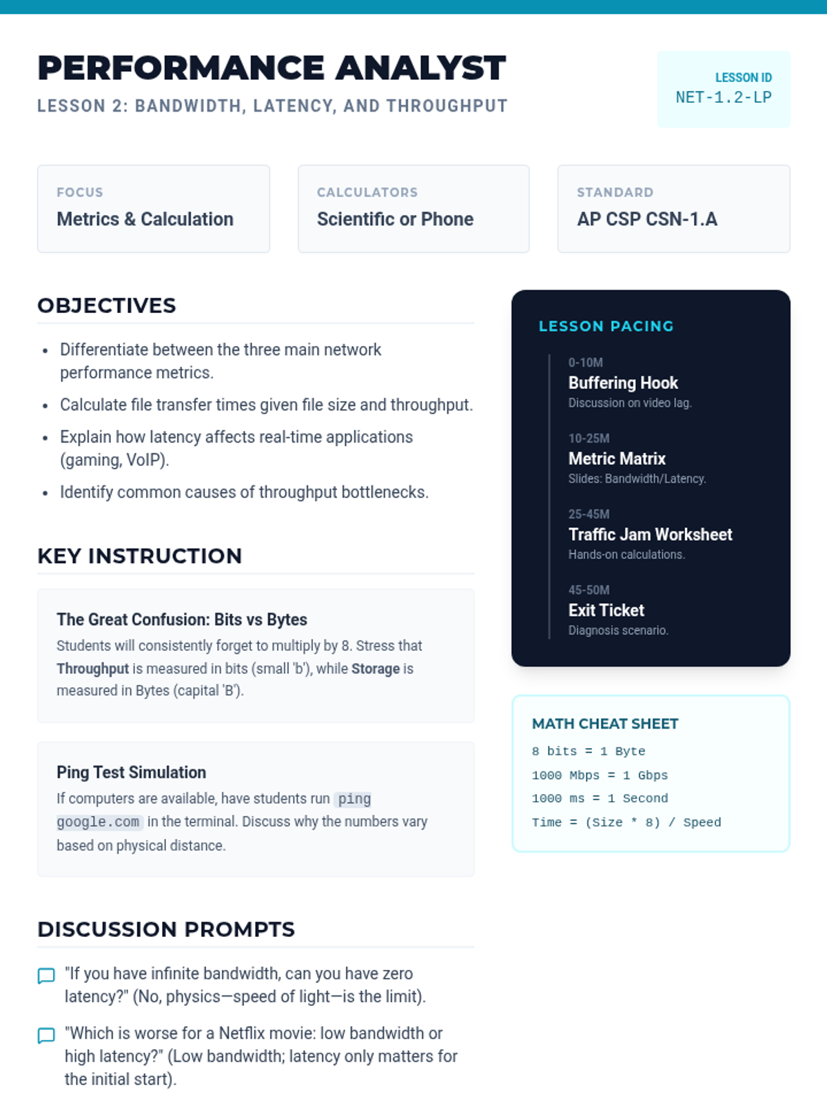 This sequence introduces 11th-grade students to the physical and logical foundations of computer networks. Students explore bit transmission, analyze performance metrics like bandwidth and latency, compare physical media, and design local network topologies.