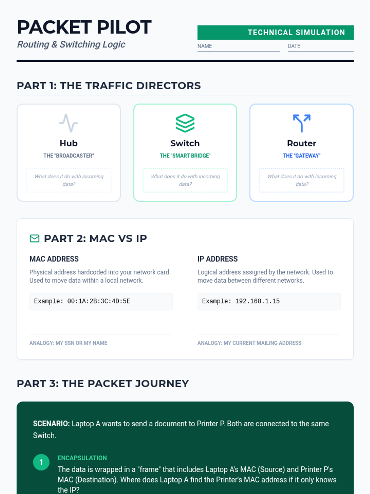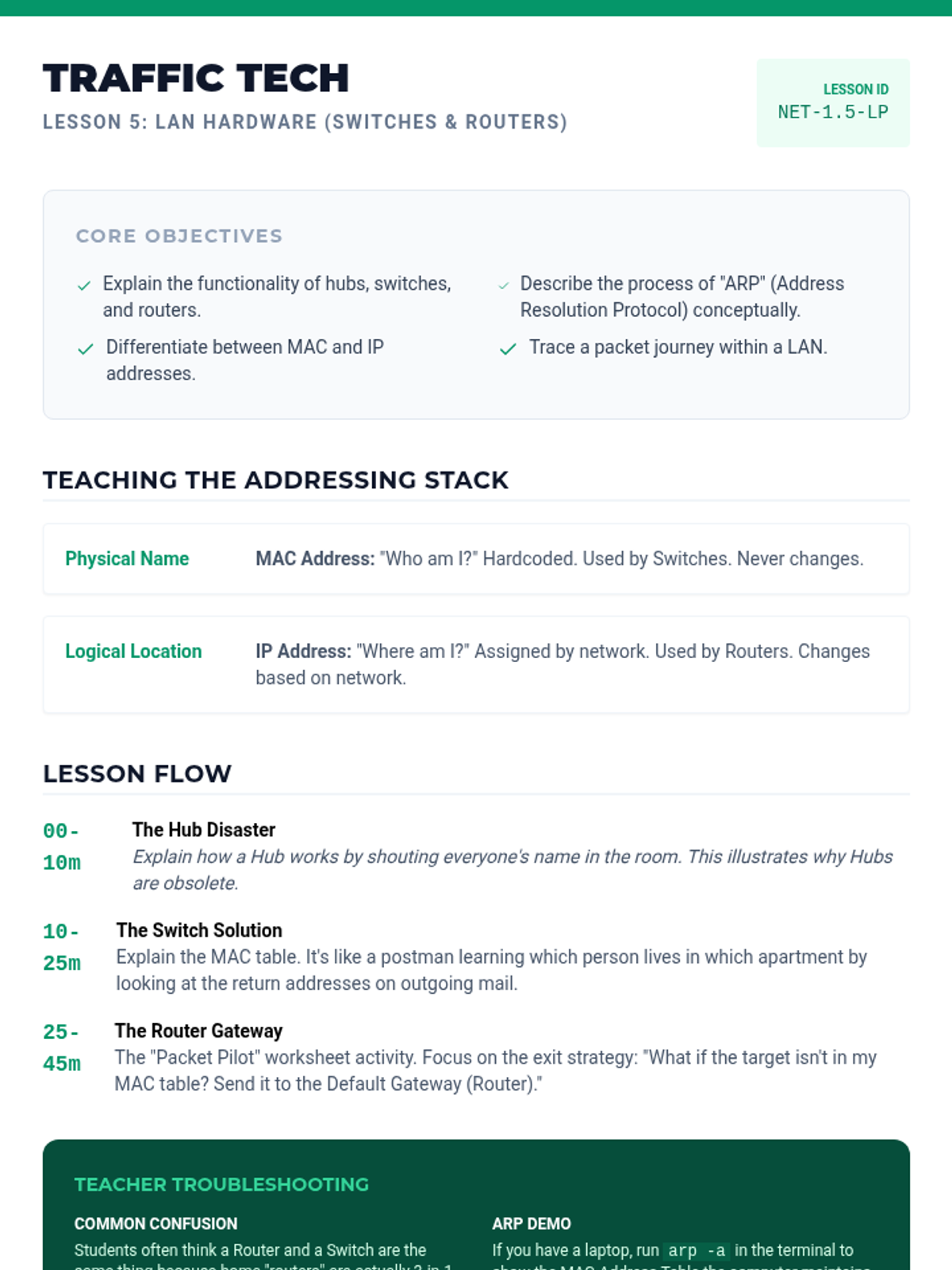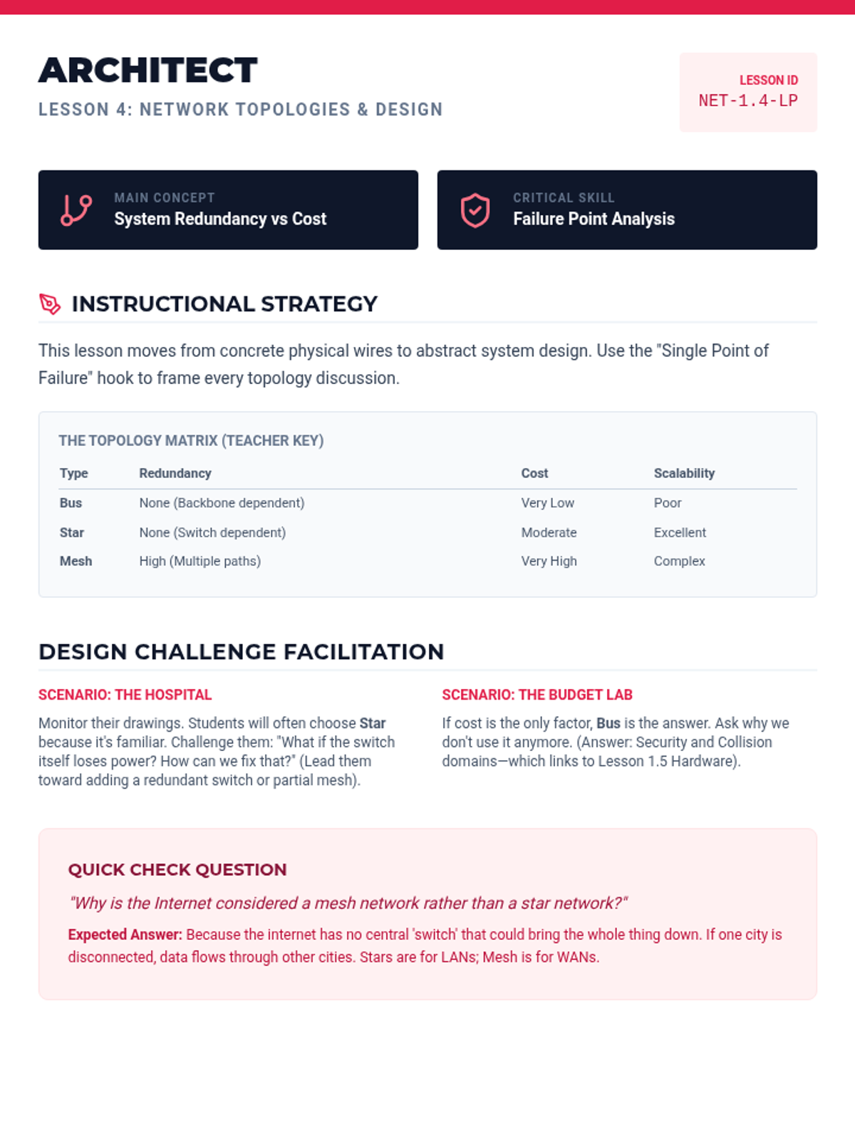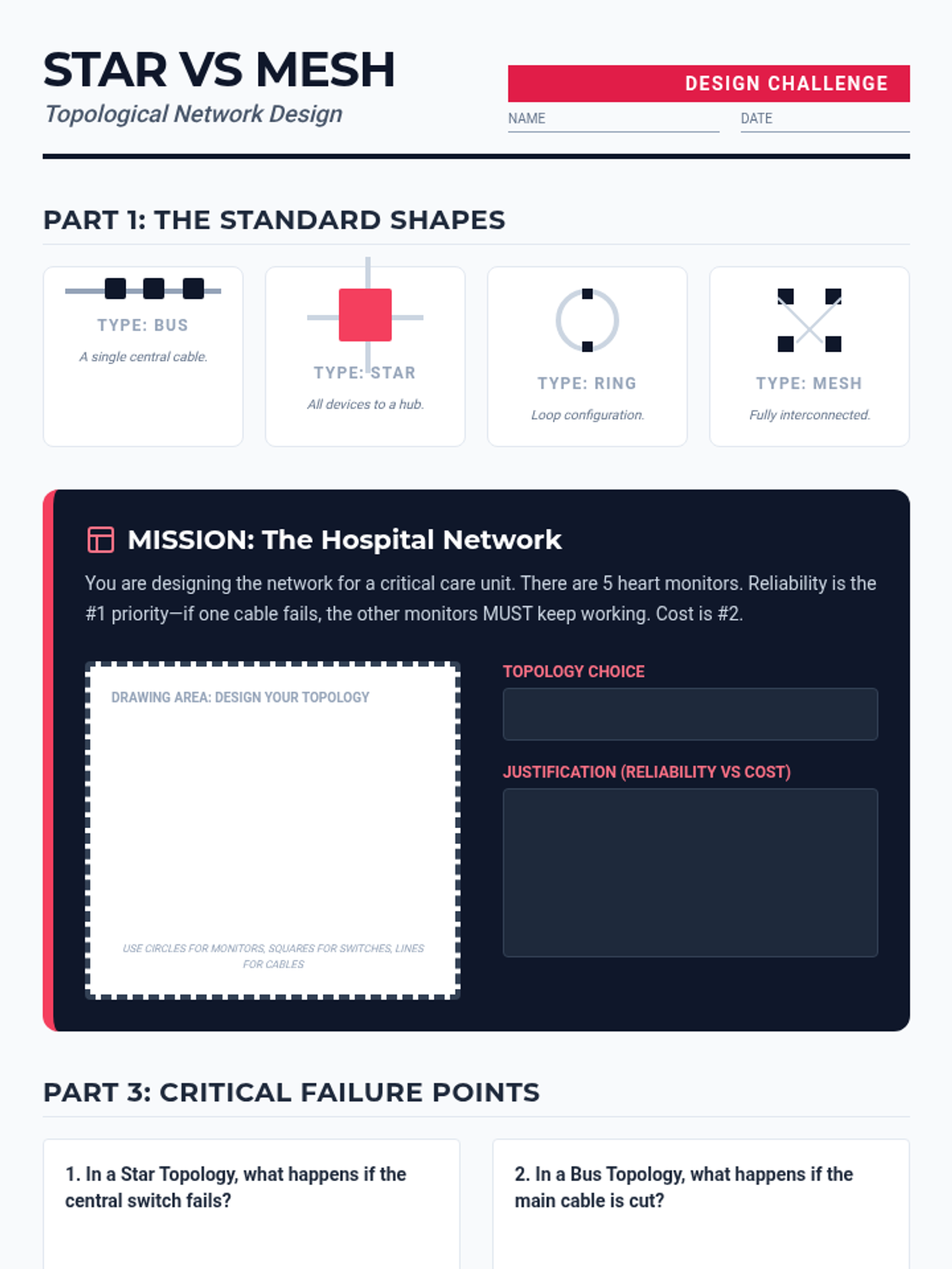 This sequence introduces 11th-grade students to the physical and logical foundations of computer networks. Students explore bit transmission, analyze performance metrics like bandwidth and latency, compare physical media, and design local network topologies.