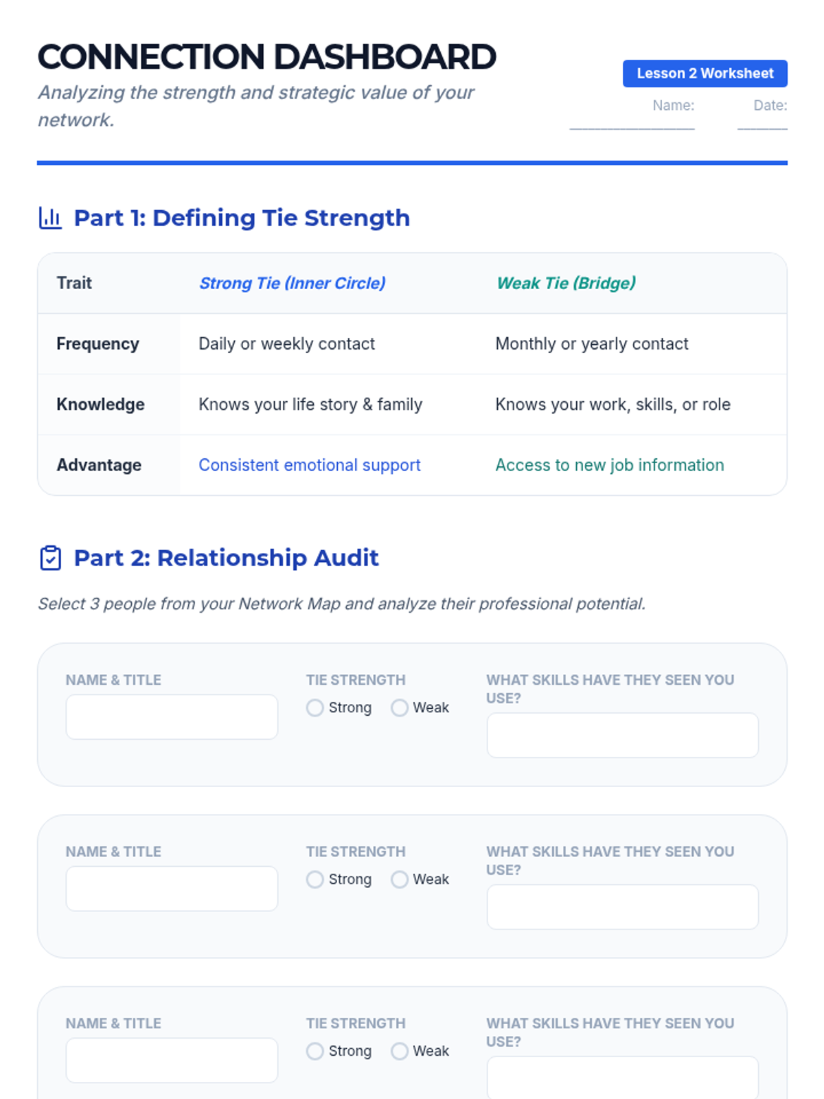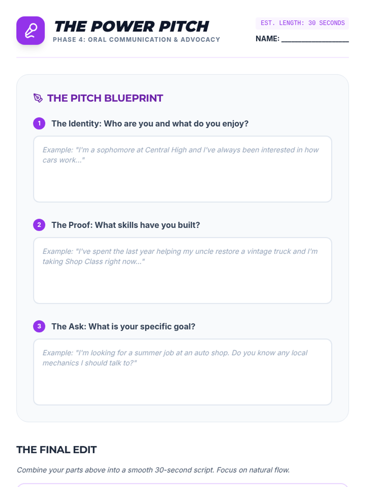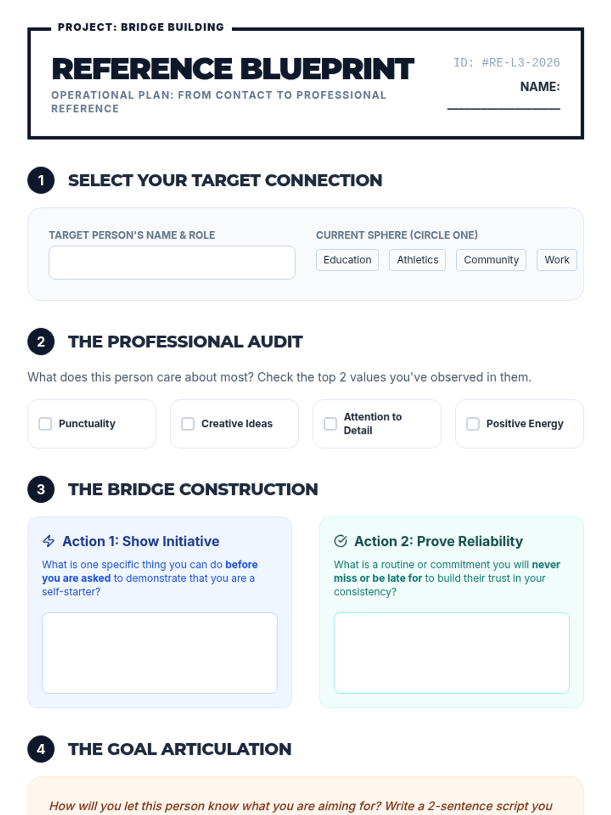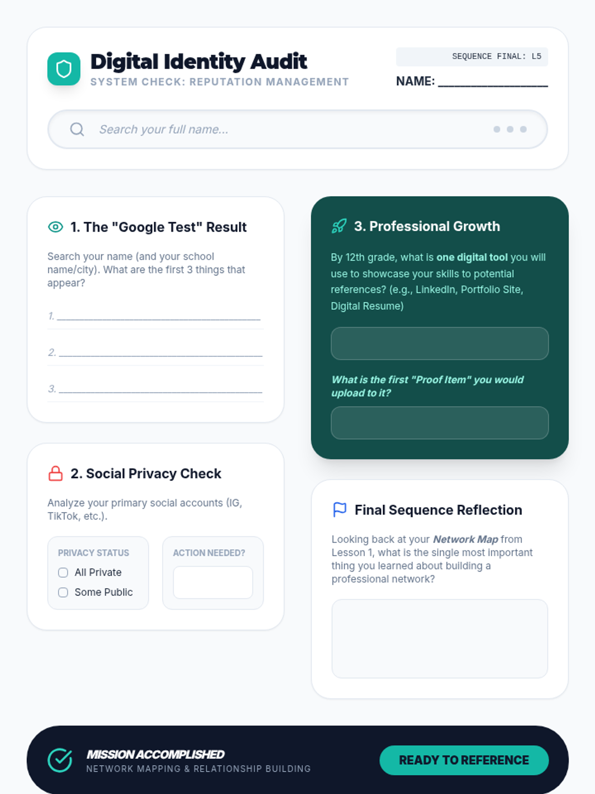 A project-based sequence for 10th graders focused on visualizing and building social capital. Students move from identifying potential references to actively cultivating professional relationships through network mapping, relationship assessment, and communication skills.