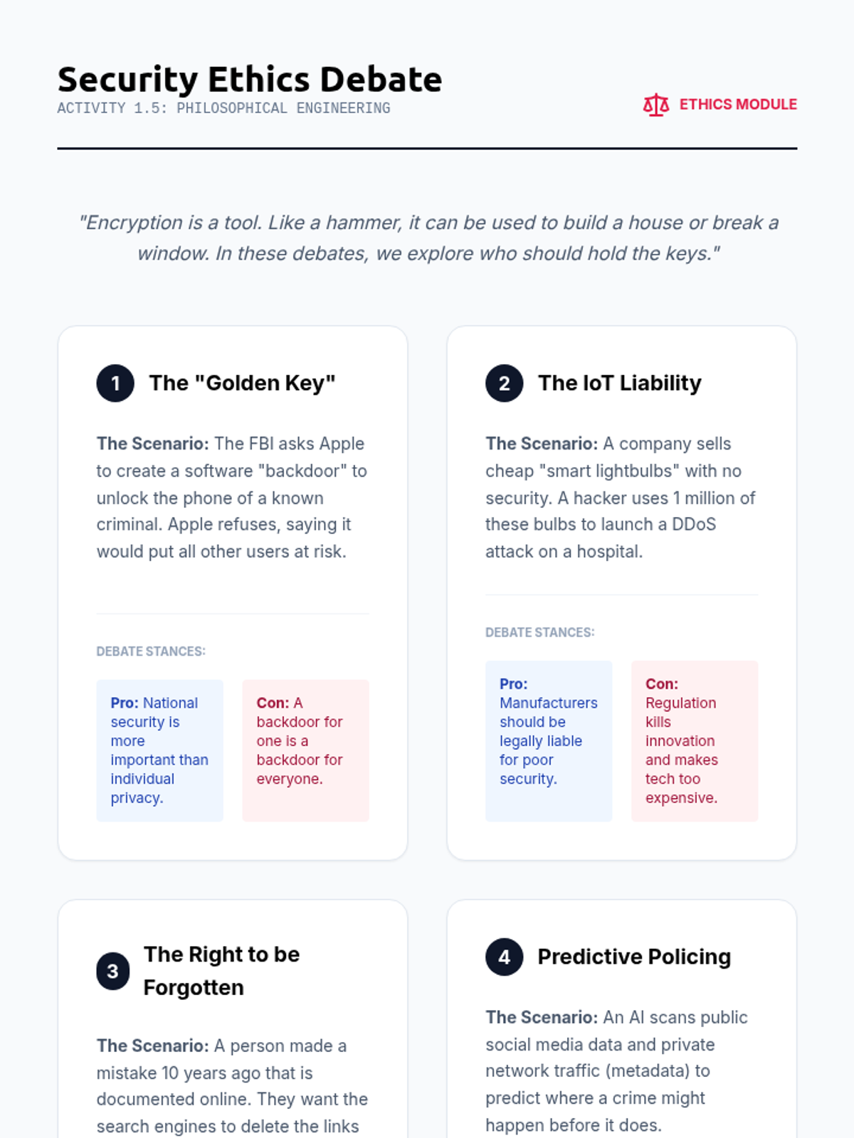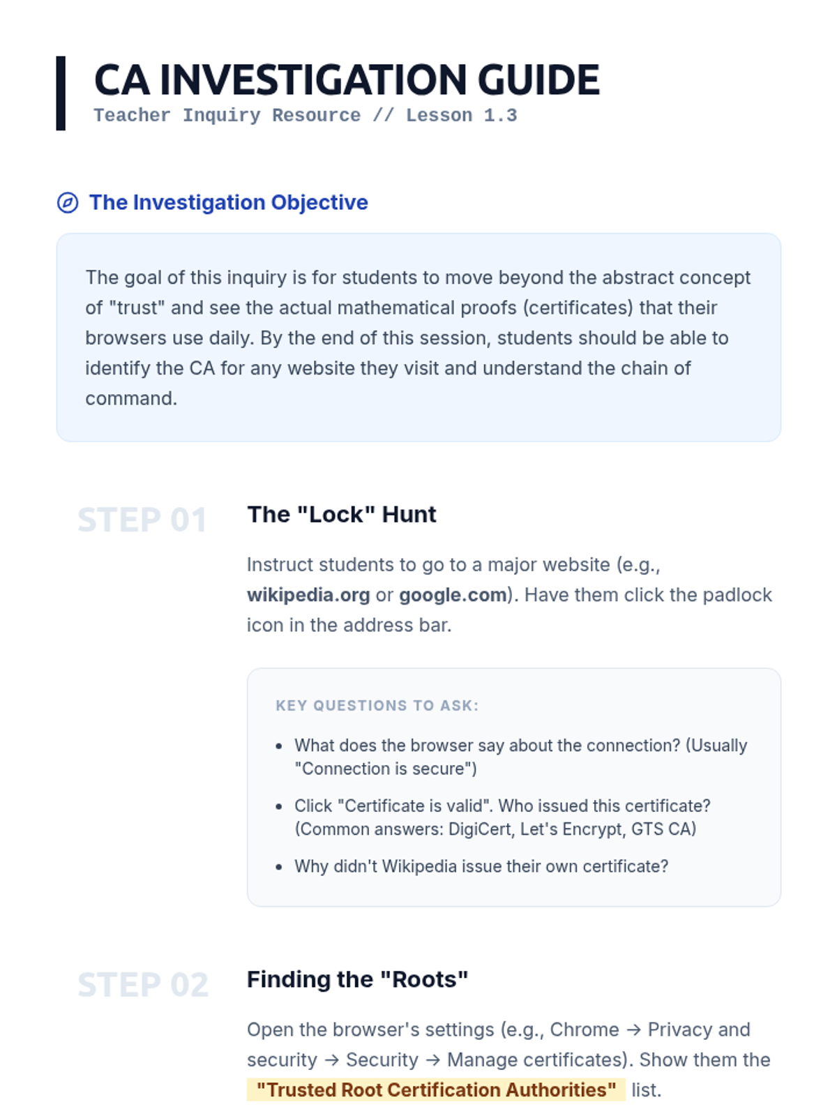 A comprehensive sequence for 12th-grade students exploring network security, cryptography, and the protocols that secure the modern internet. Students progress from foundational security principles to the technical details of public key infrastructure and the HTTPS handshake.