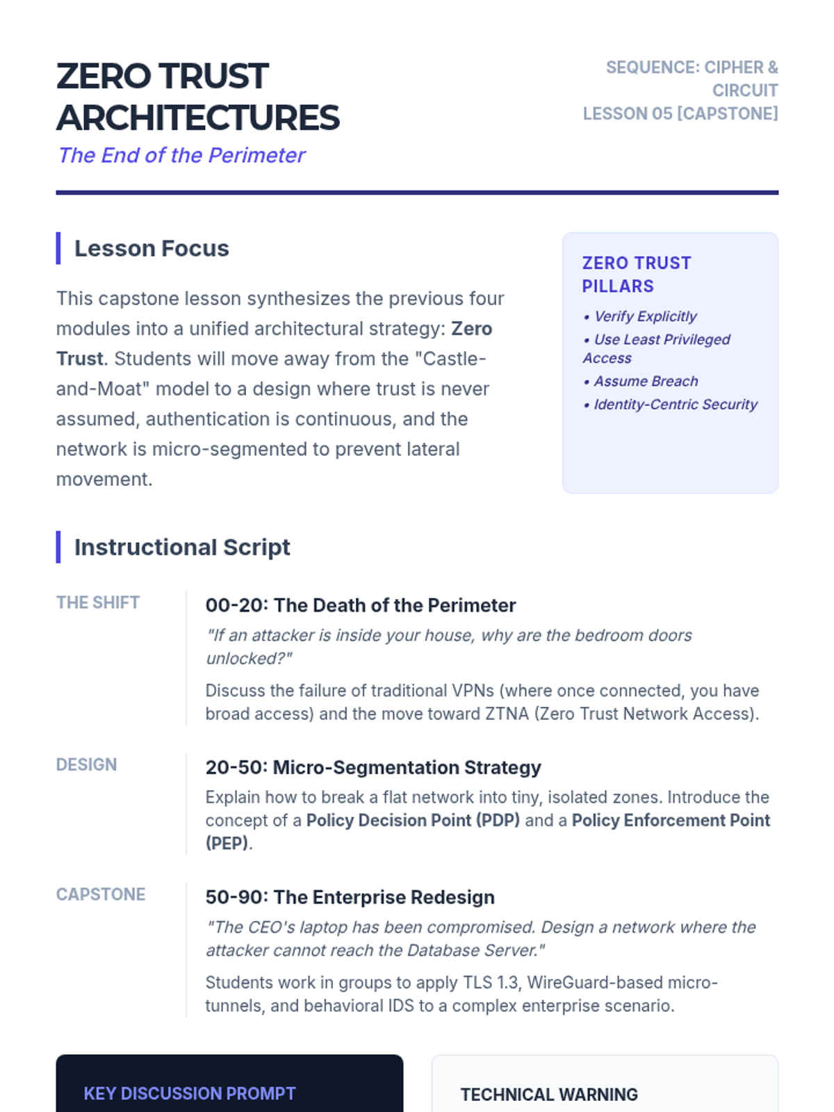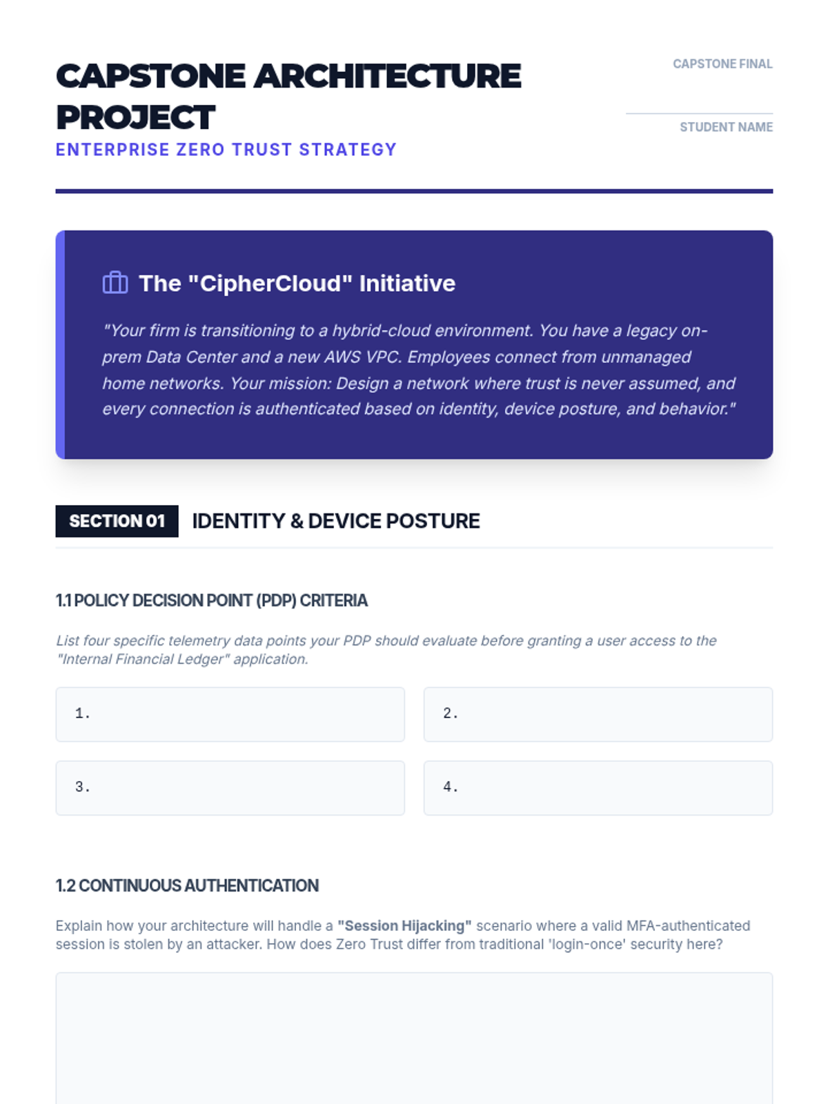 This graduate-level sequence explores the engineering of secure networks, focusing on cryptographic protocols, TLS 1.3, VPN architectures, intrusion detection, and the transition to Zero Trust models. Students will analyze and design resilient network infrastructures capable of protecting sensitive data across untrusted environments.