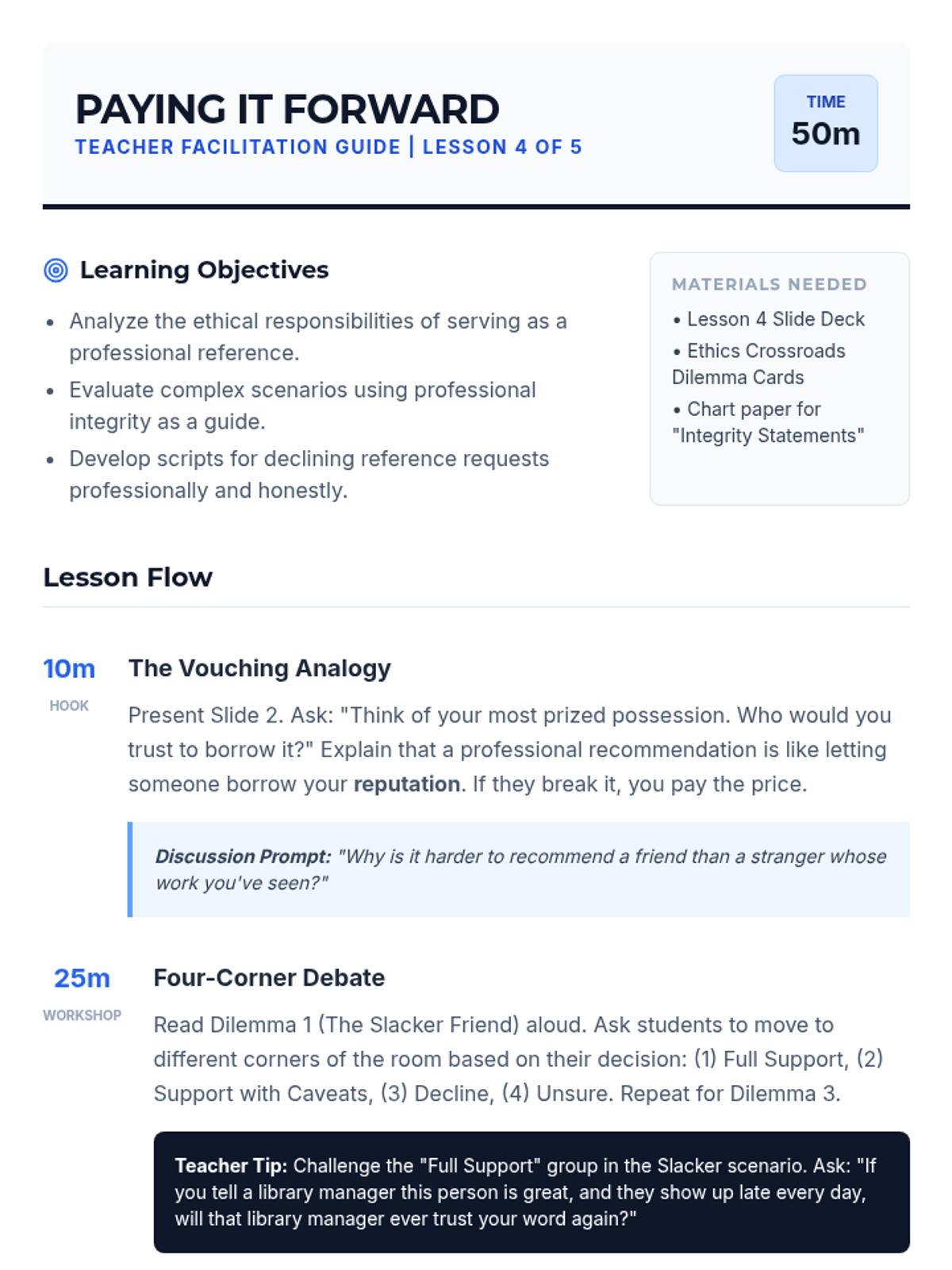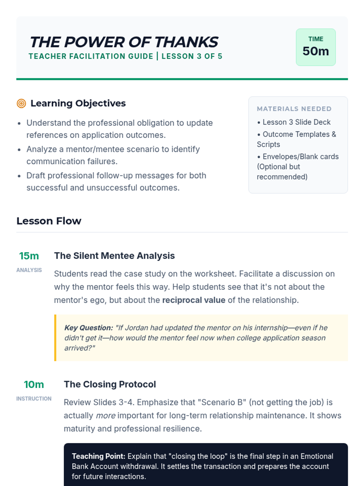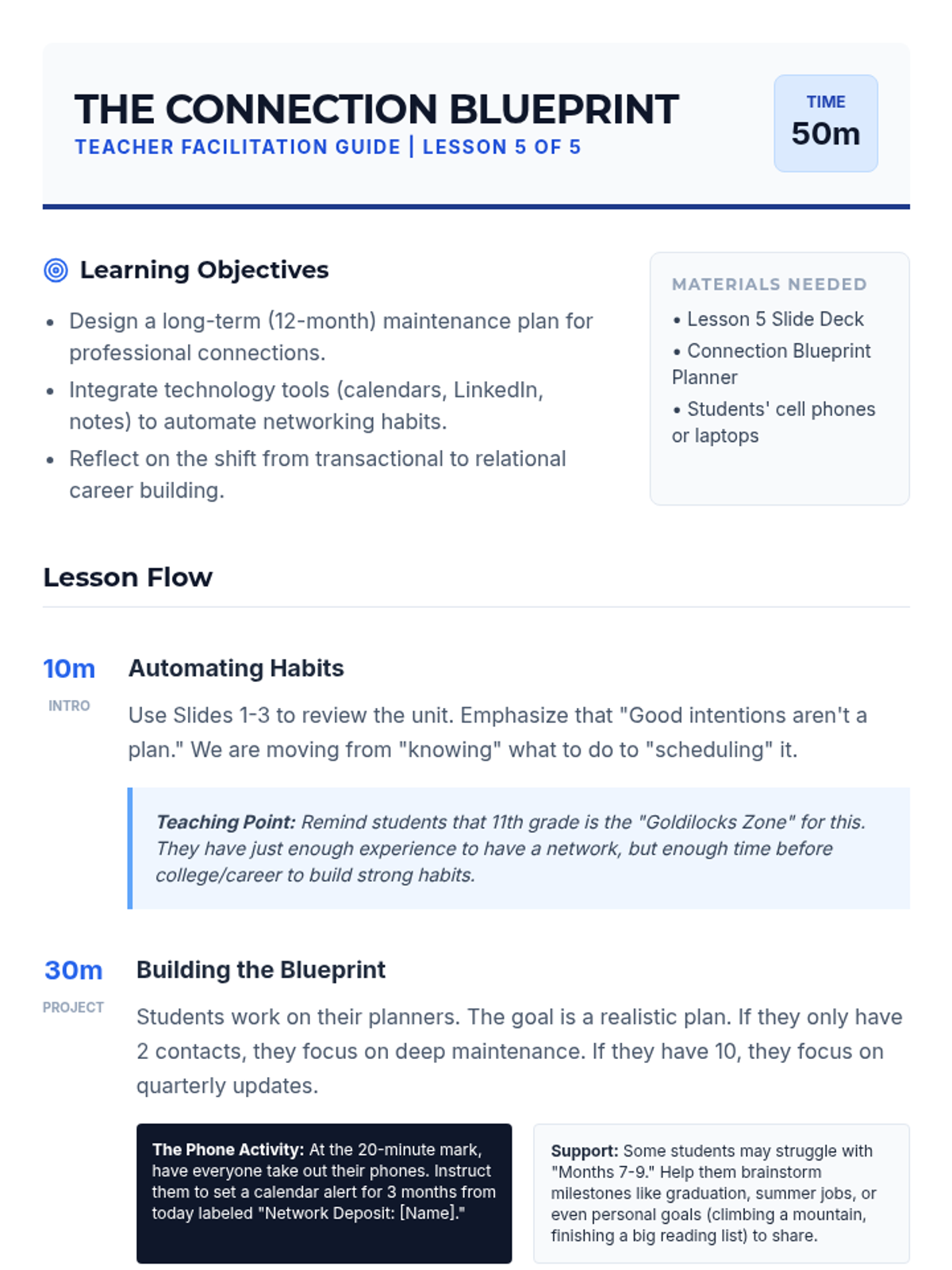 A comprehensive 5-lesson unit for 11th-grade students on the art of cultivating and maintaining professional references as long-term relationships rather than one-off transactions. Students explore networking ethics, communication strategies, and the reciprocal nature of professional mentorship.