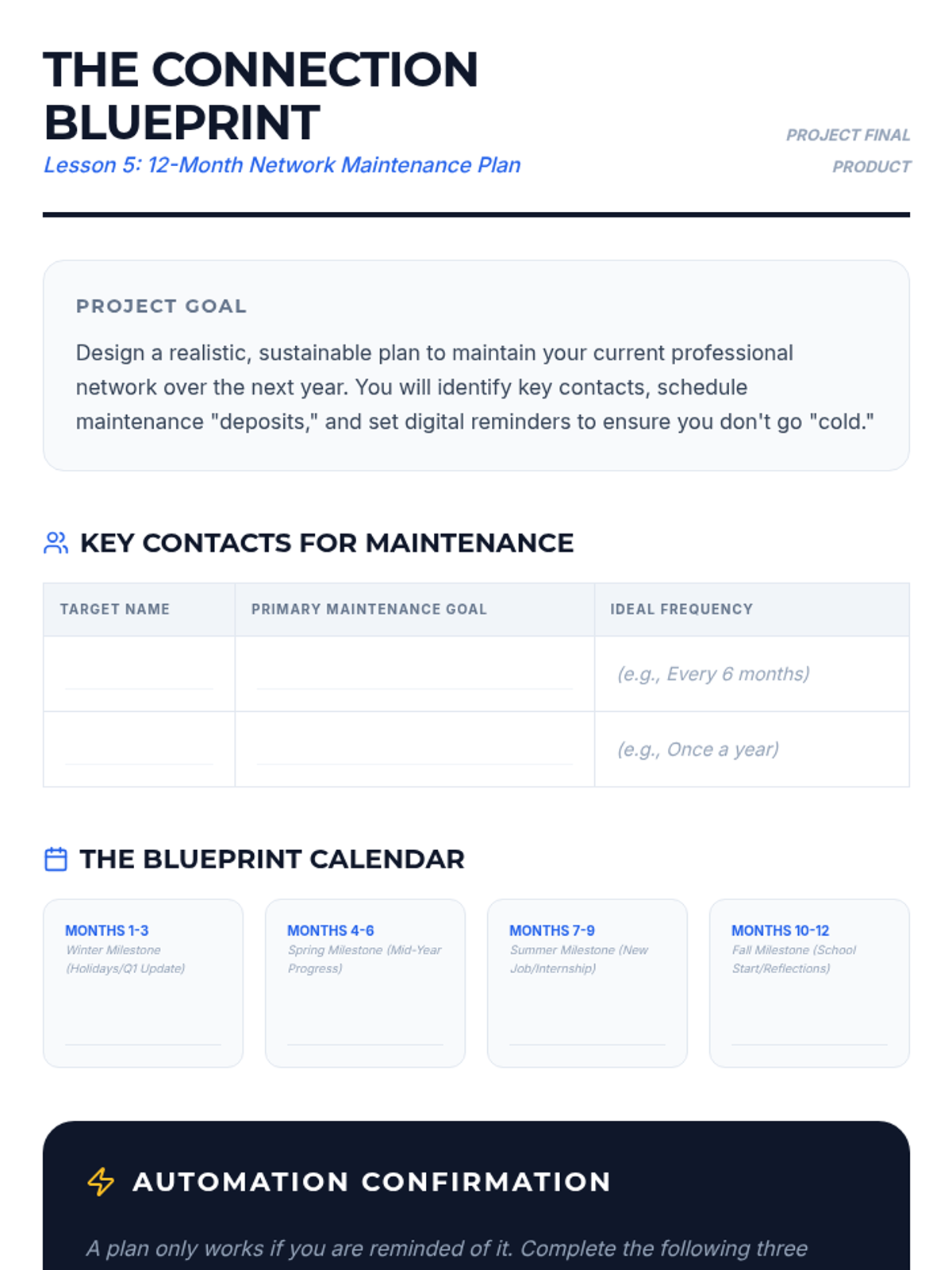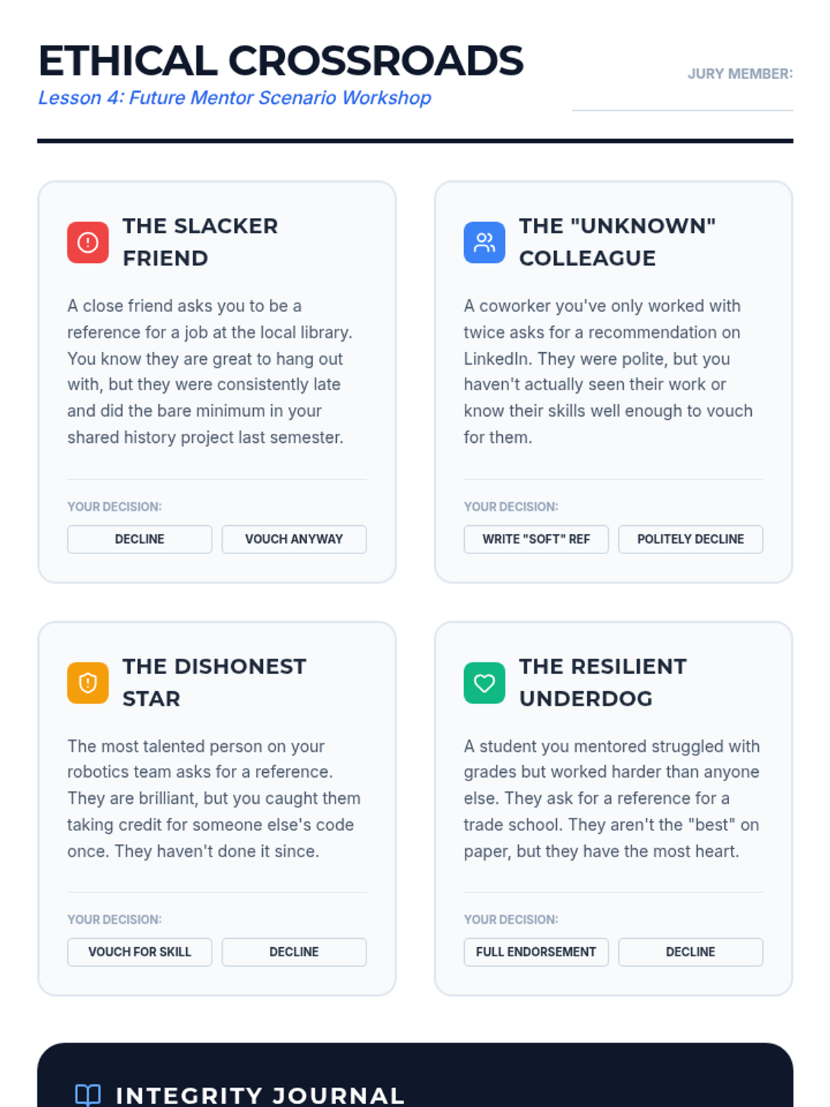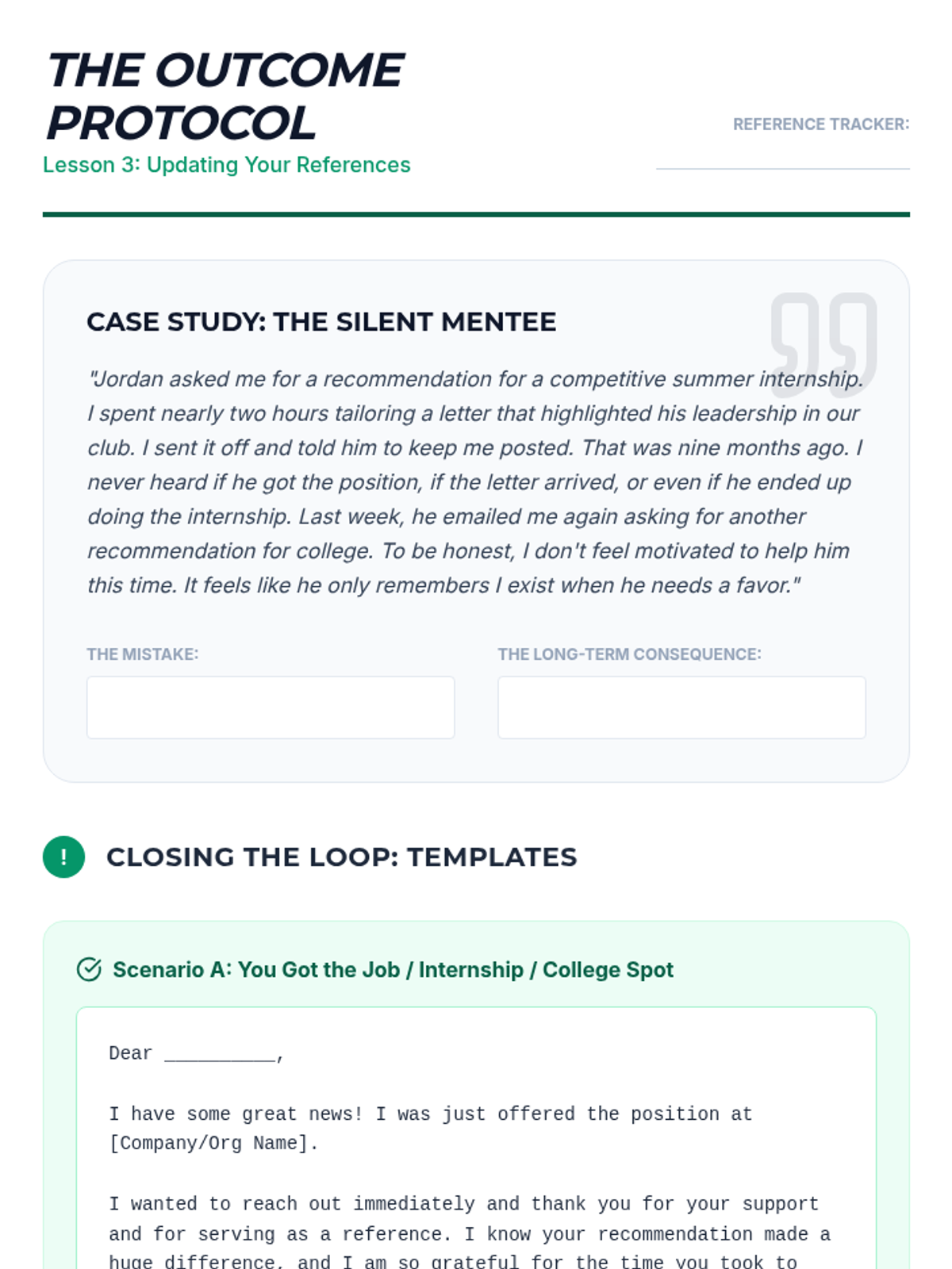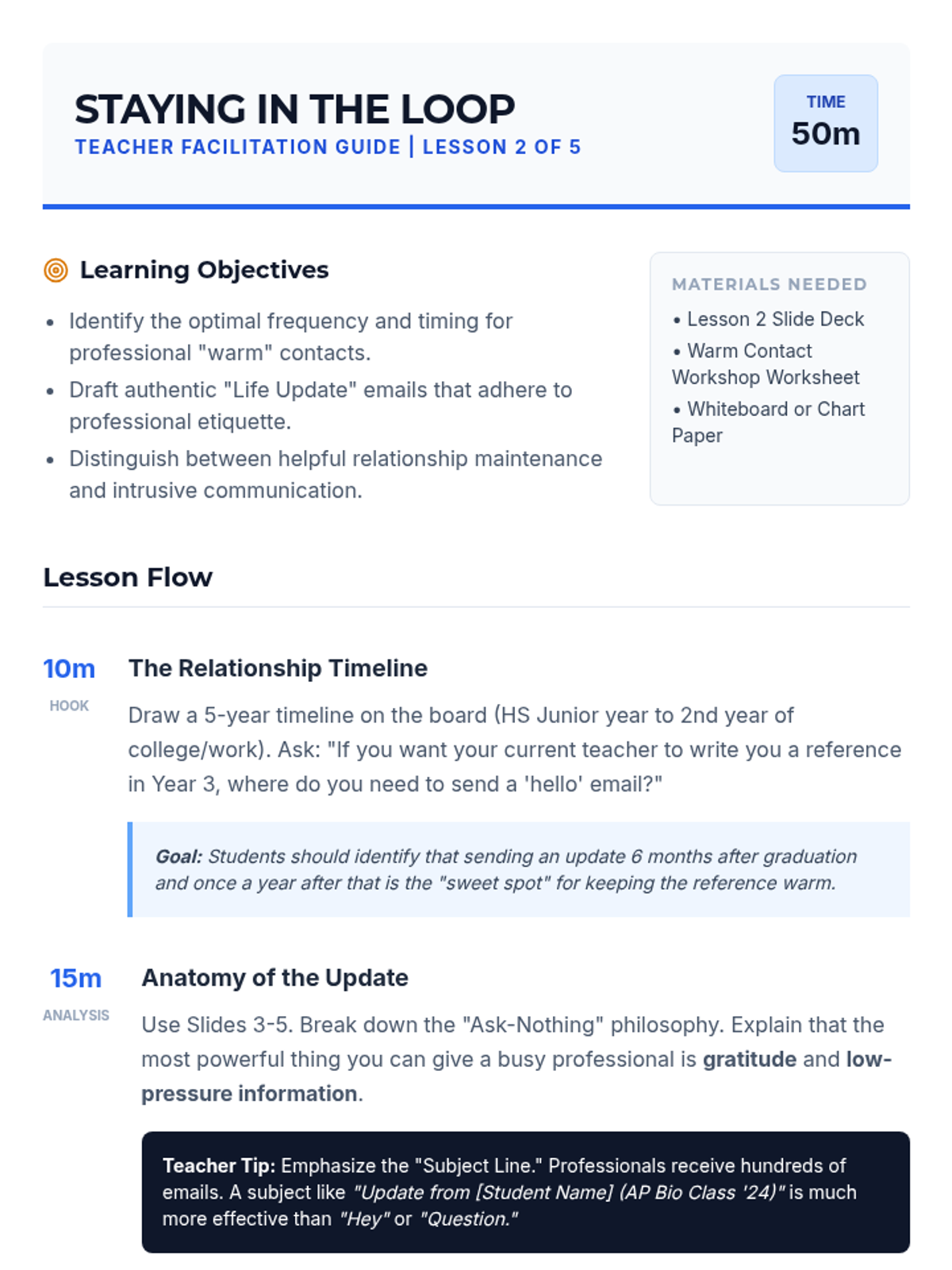 A comprehensive 5-lesson unit for 11th-grade students on the art of cultivating and maintaining professional references as long-term relationships rather than one-off transactions. Students explore networking ethics, communication strategies, and the reciprocal nature of professional mentorship.
