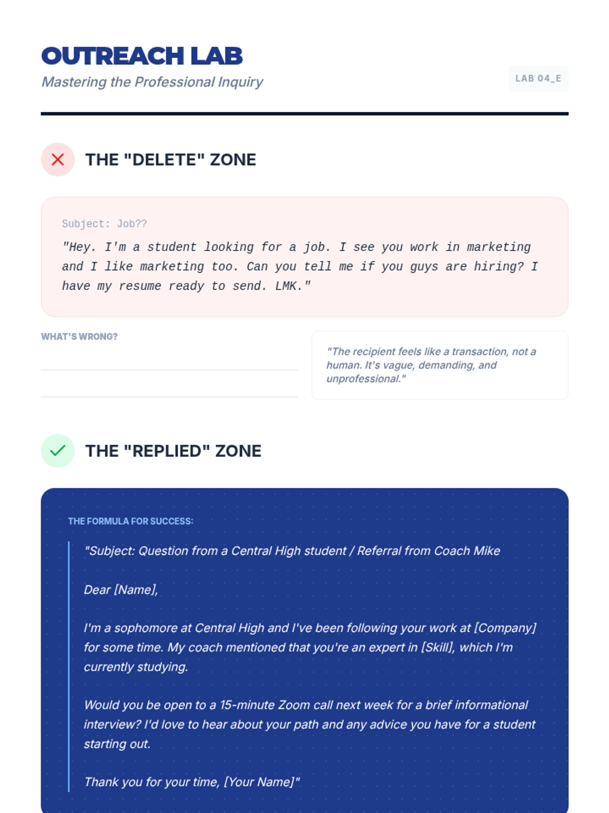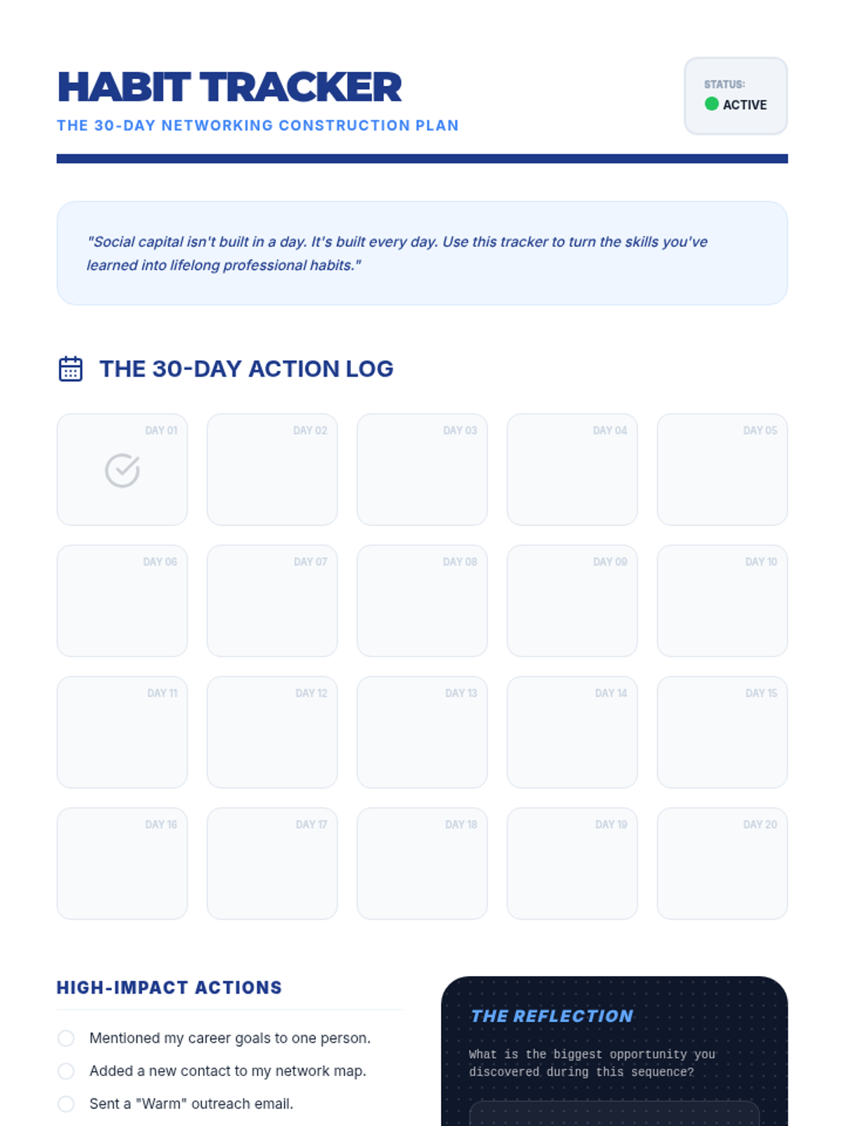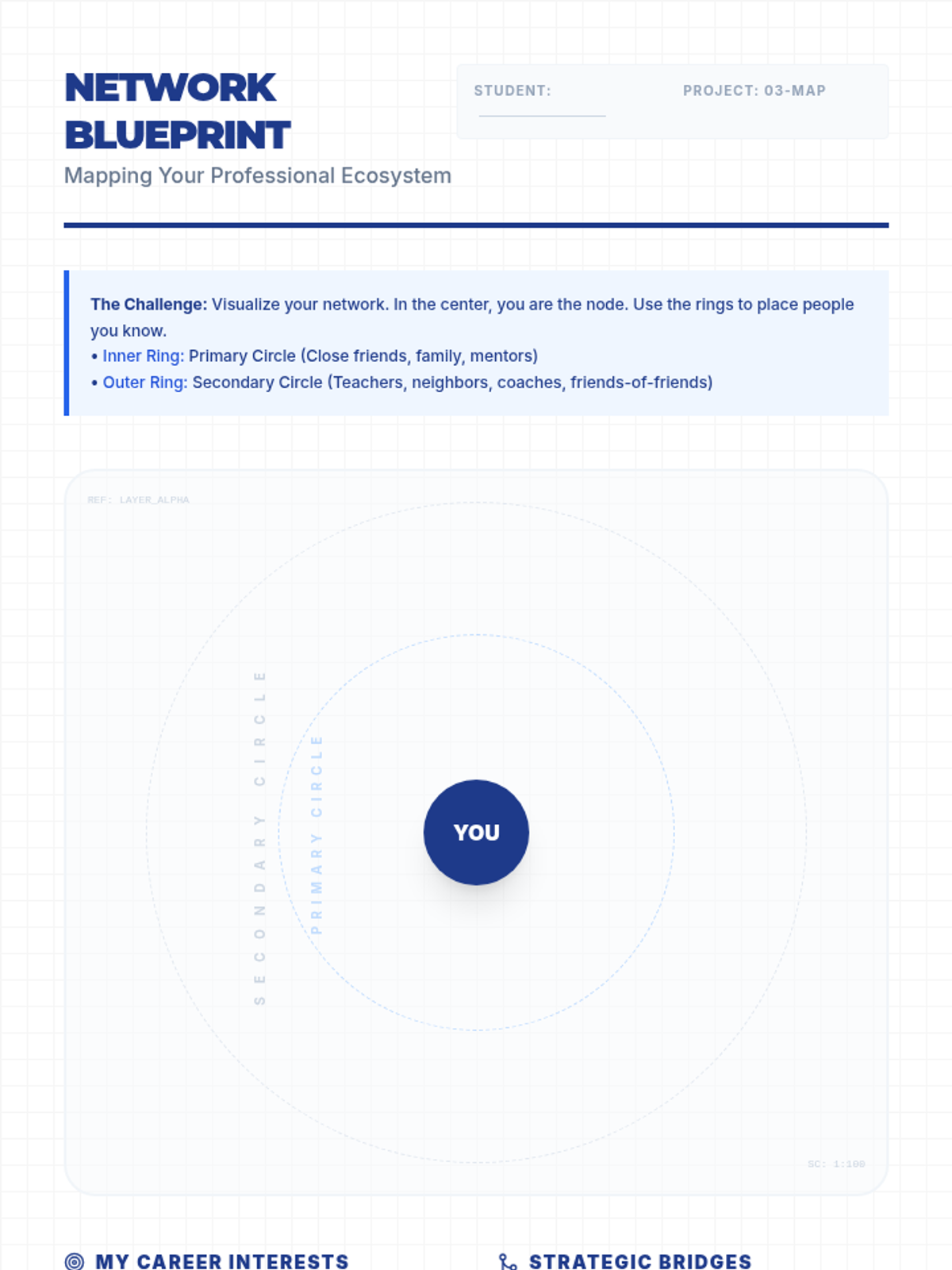 This sequence explores the 'hidden job market' where up to 80% of roles are filled through networking. Students will develop social capital, craft elevator pitches, map their personal connections, and learn the etiquette of informational interviews and professional follow-up.