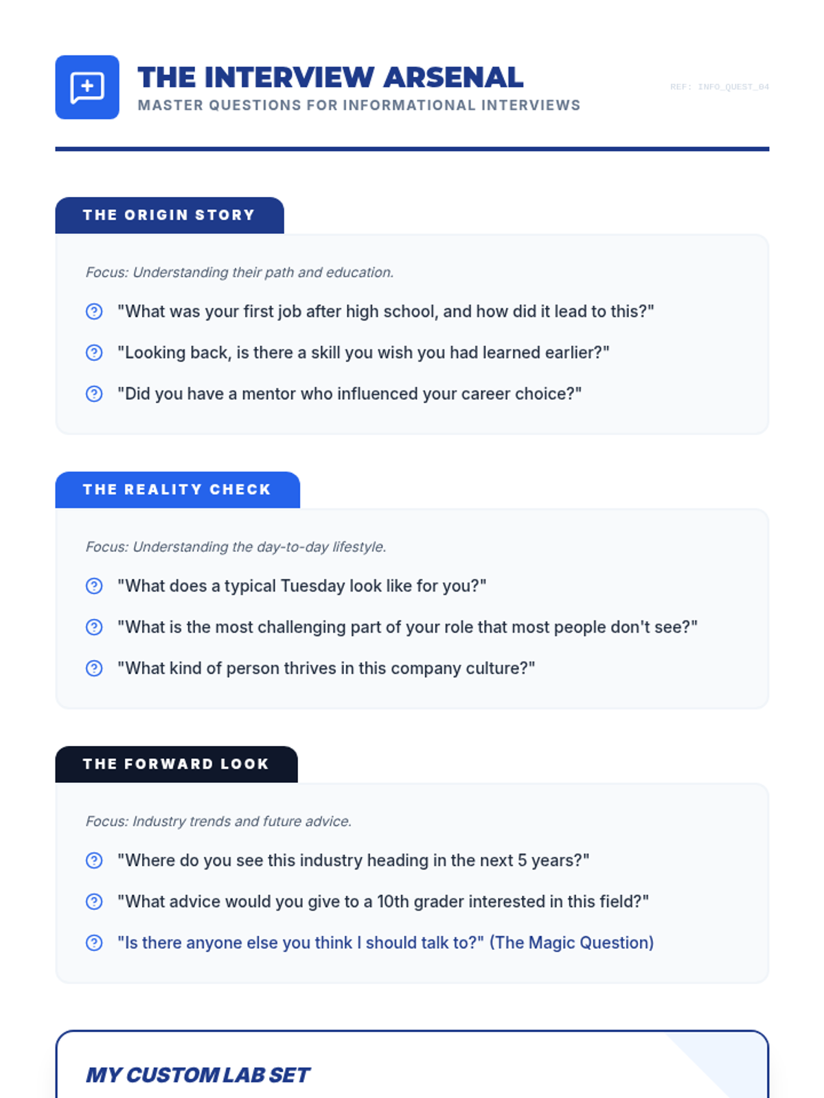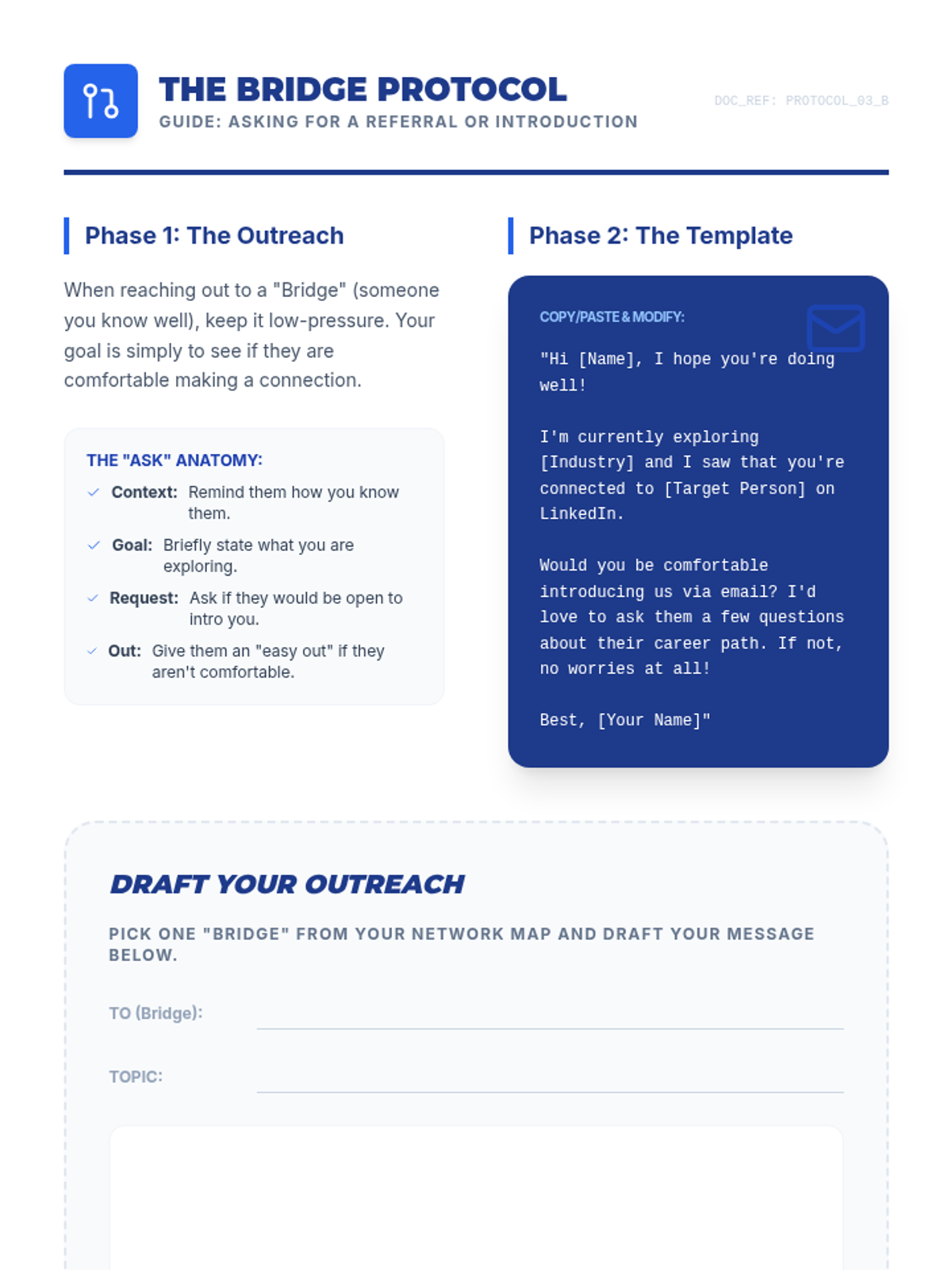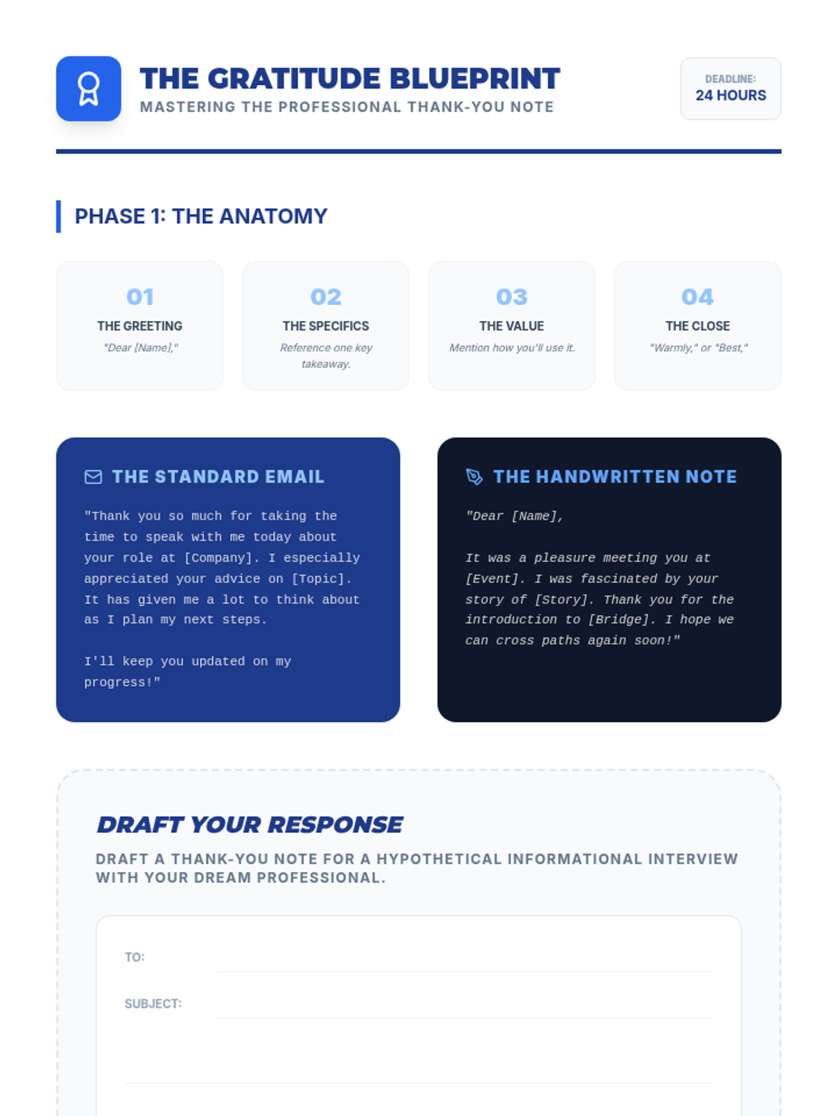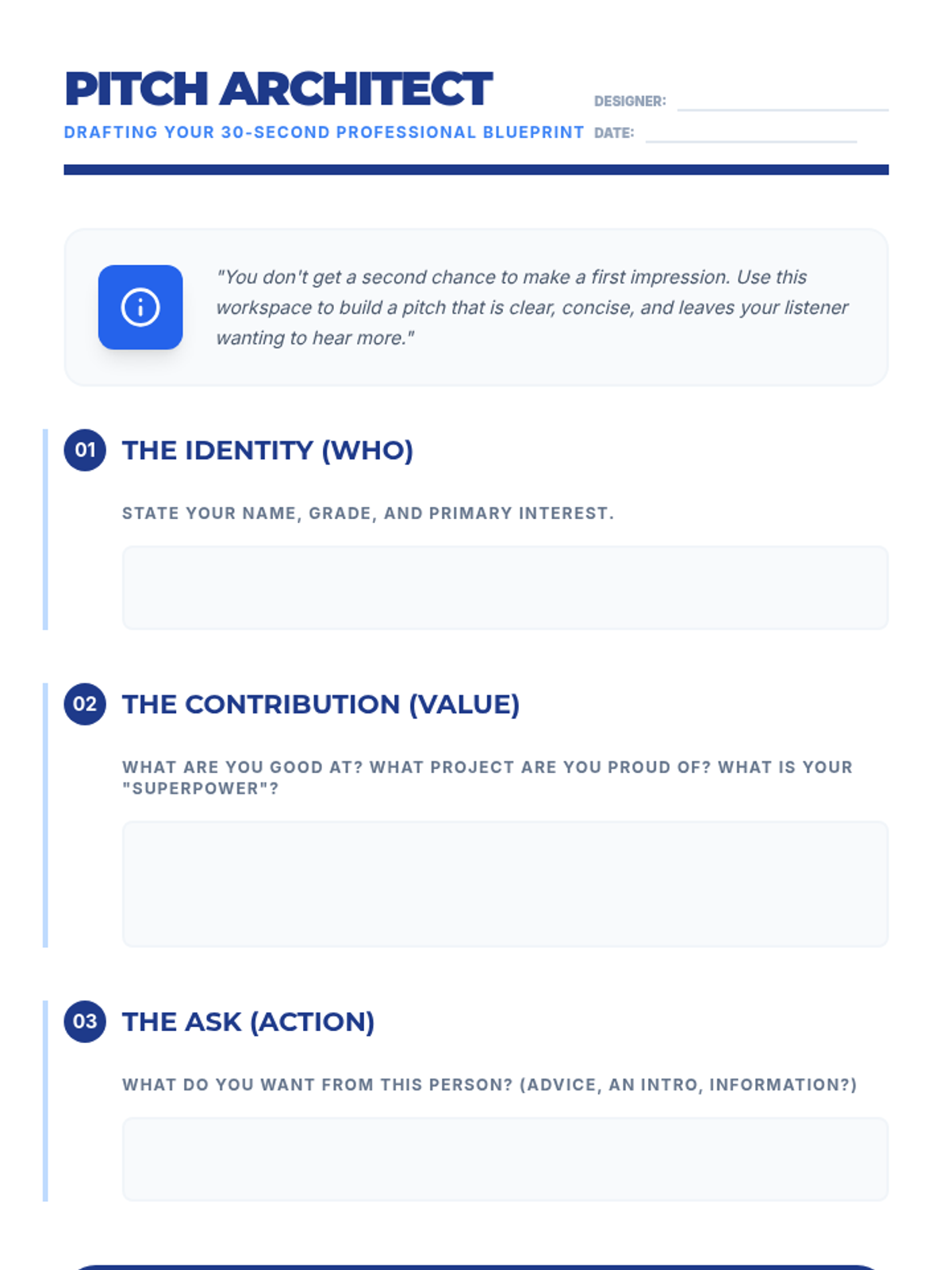 This sequence explores the 'hidden job market' where up to 80% of roles are filled through networking. Students will develop social capital, craft elevator pitches, map their personal connections, and learn the etiquette of informational interviews and professional follow-up.