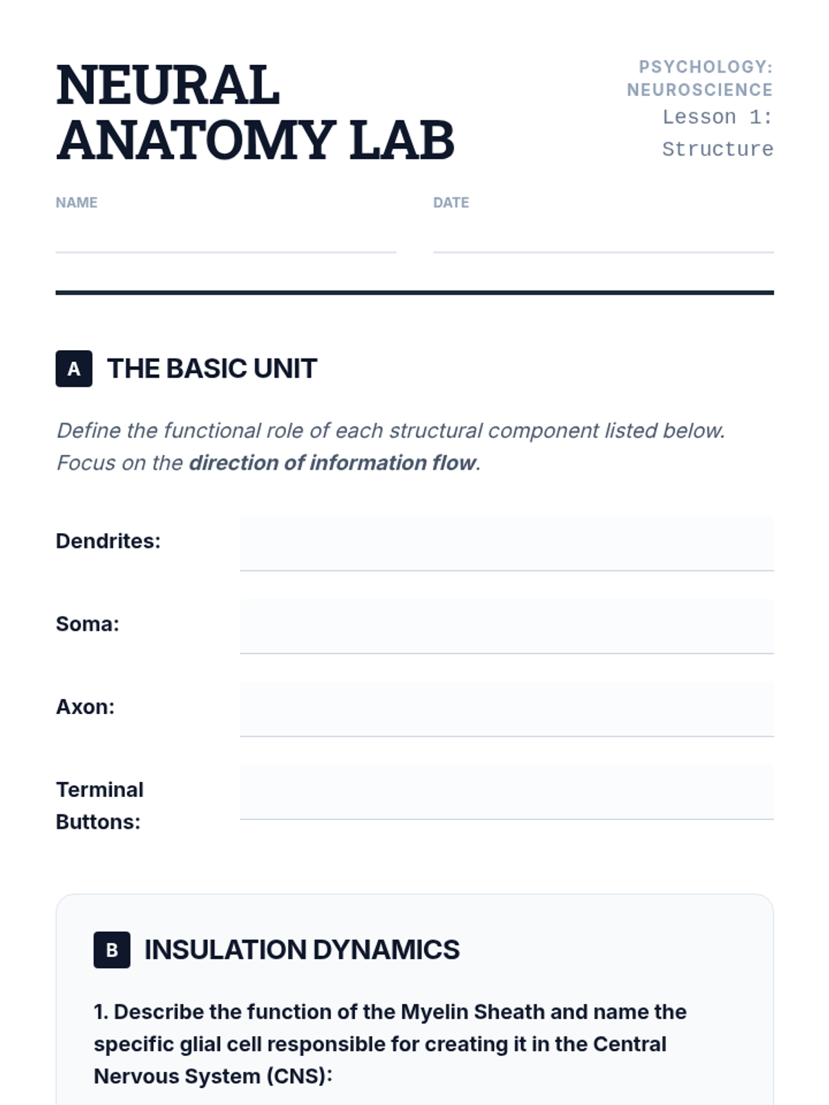 An undergraduate-level exploration of the cellular foundations of behavior, covering neuron anatomy, the mechanics of action potentials, synaptic transmission, and the neurochemical basis of psychopharmacology.