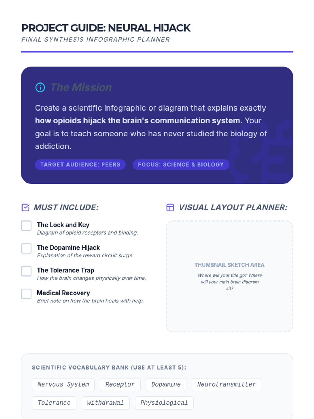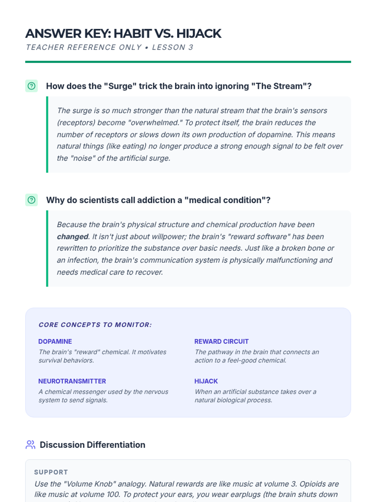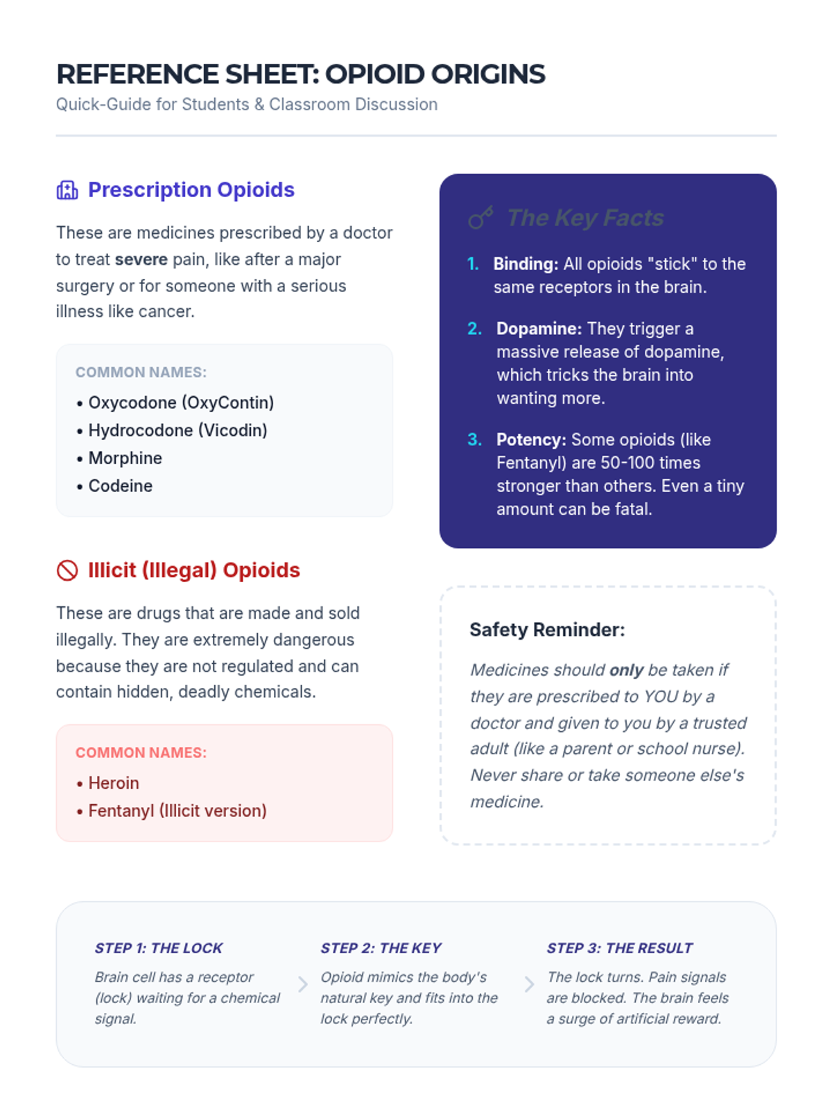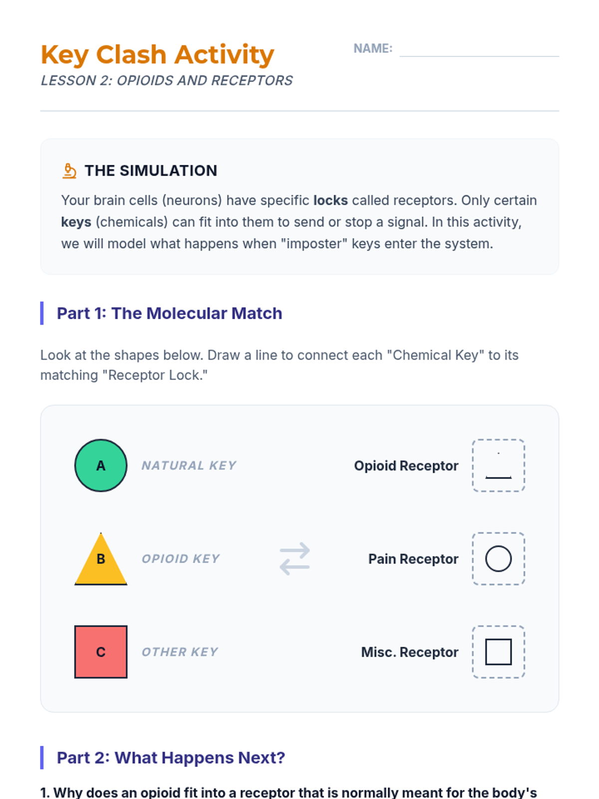 This inquiry-based sequence explores the biological impact of opioids on the nervous system for 6th-grade students. It covers the science of pain signaling, the chemical 'lock and key' mechanism of receptors, the dopamine reward system, and the physiological cycle of tolerance and addiction.