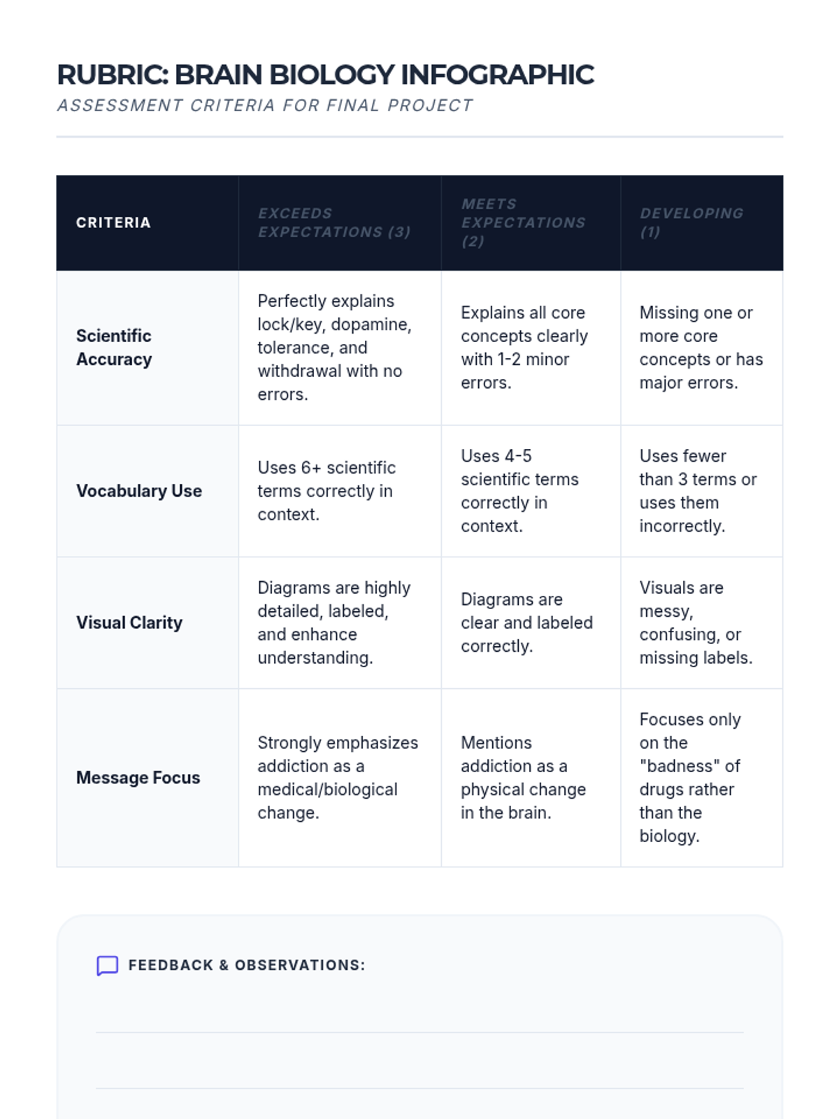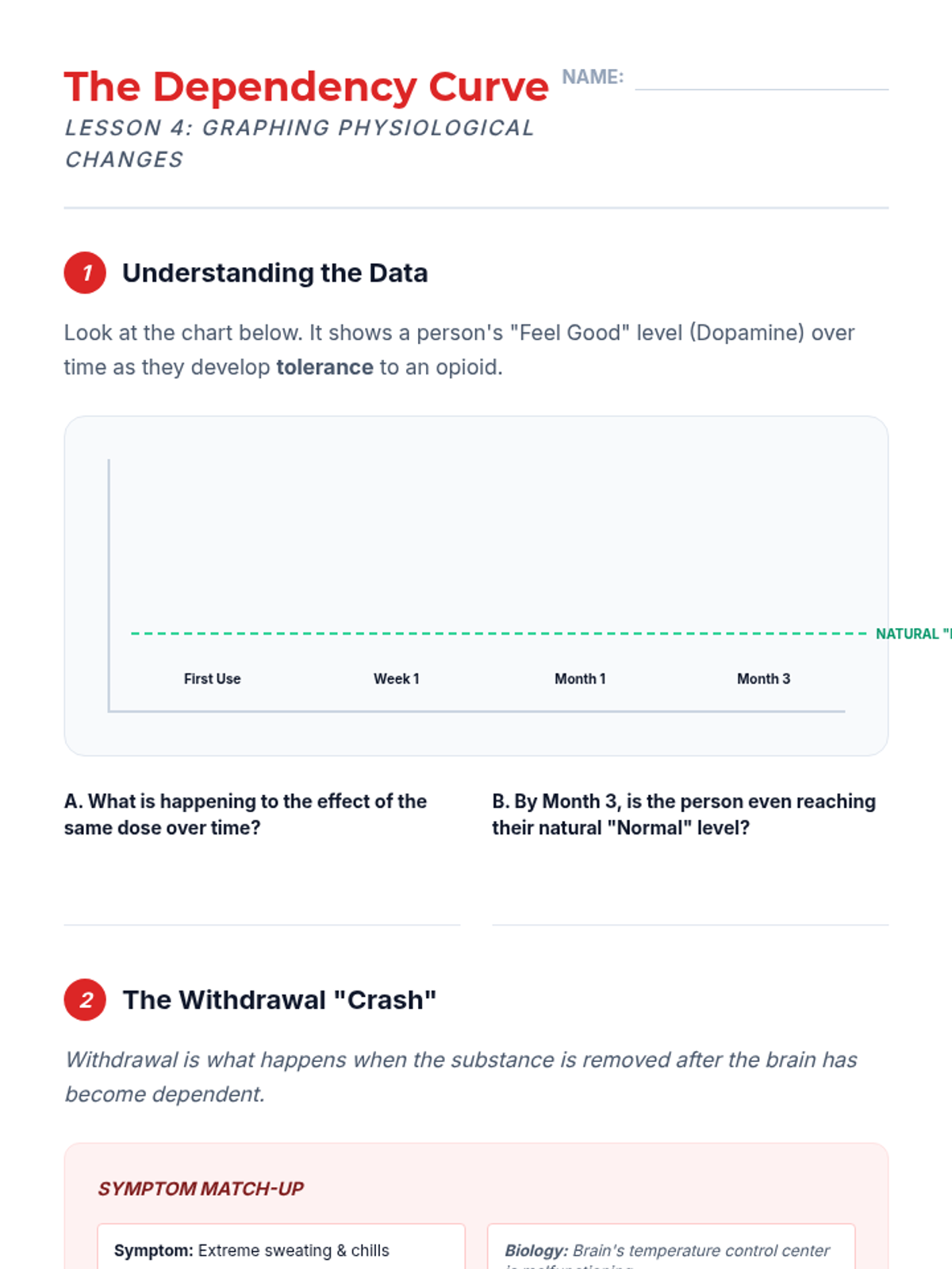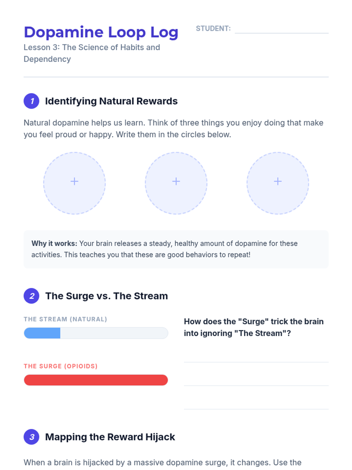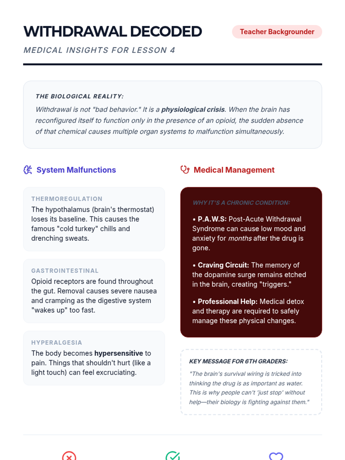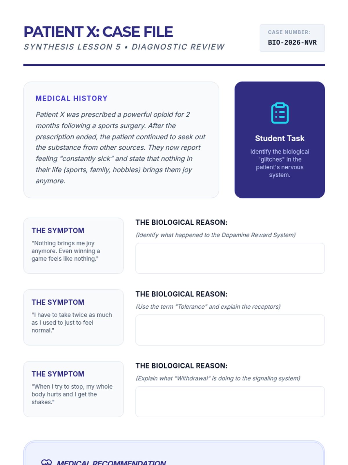 This inquiry-based sequence explores the biological impact of opioids on the nervous system for 6th-grade students. It covers the science of pain signaling, the chemical 'lock and key' mechanism of receptors, the dopamine reward system, and the physiological cycle of tolerance and addiction.