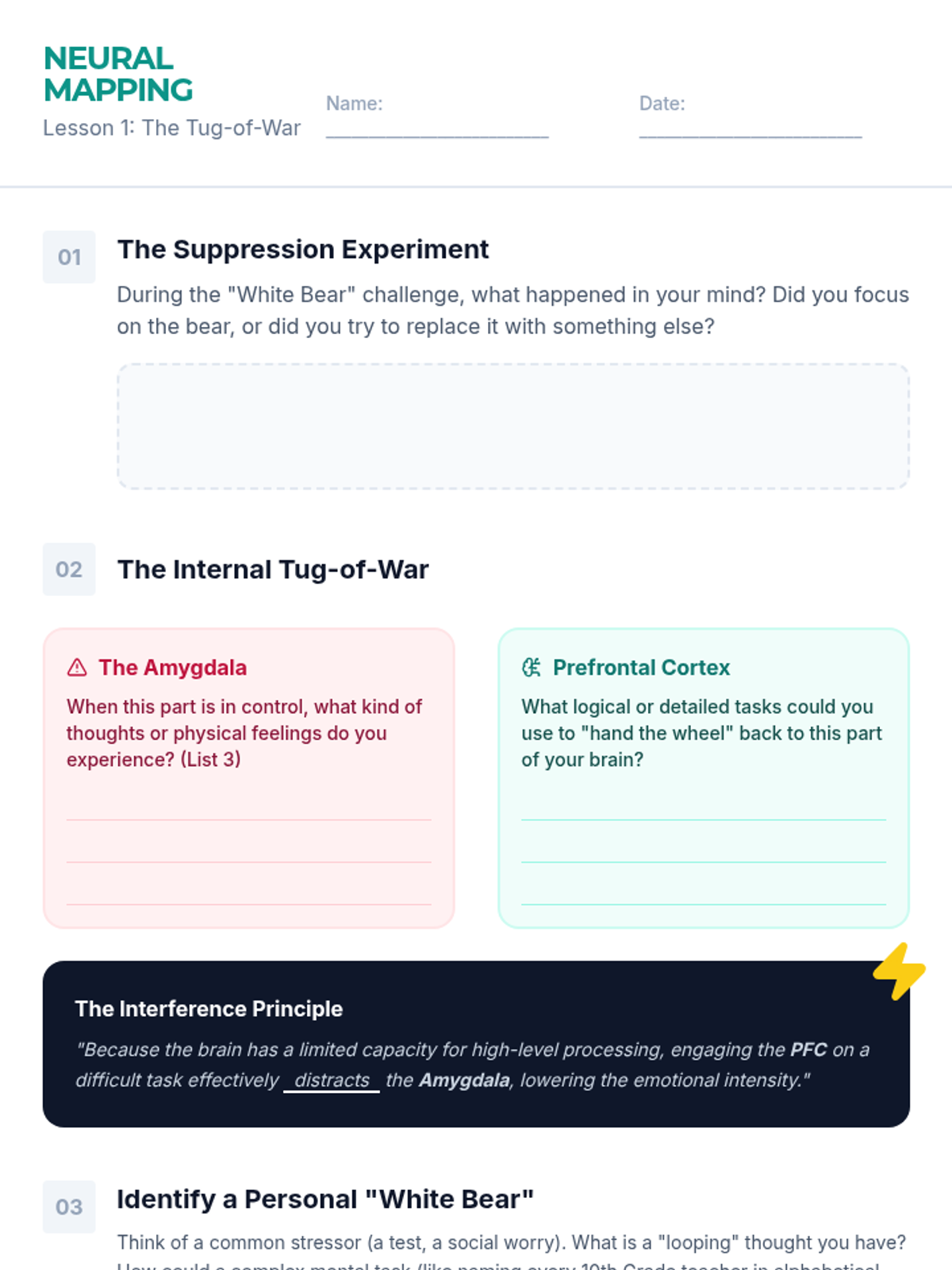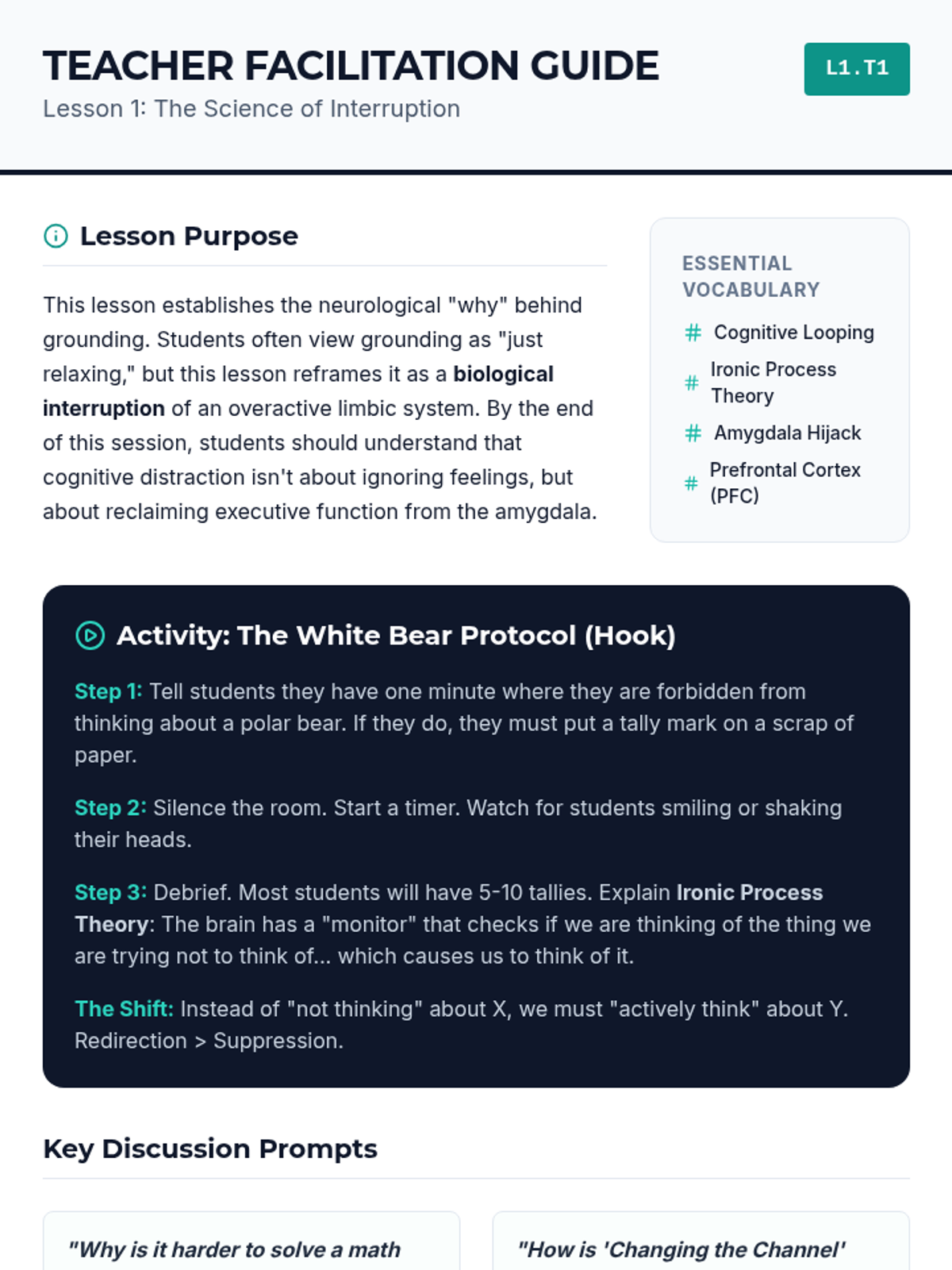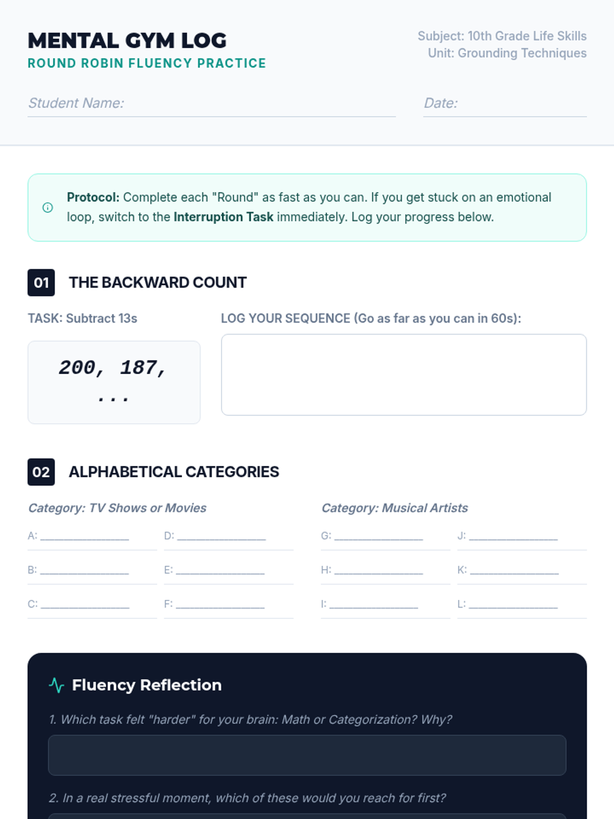 This 5-lesson sequence for 10th-grade students explores cognitive distraction and mental reframing as grounding techniques. Students learn the science behind 'cognitive looping,' practice mental games and math to re-engage the prefrontal cortex, construct factual anchoring statements, and apply these skills in simulated stressors and case studies to regain emotional control.