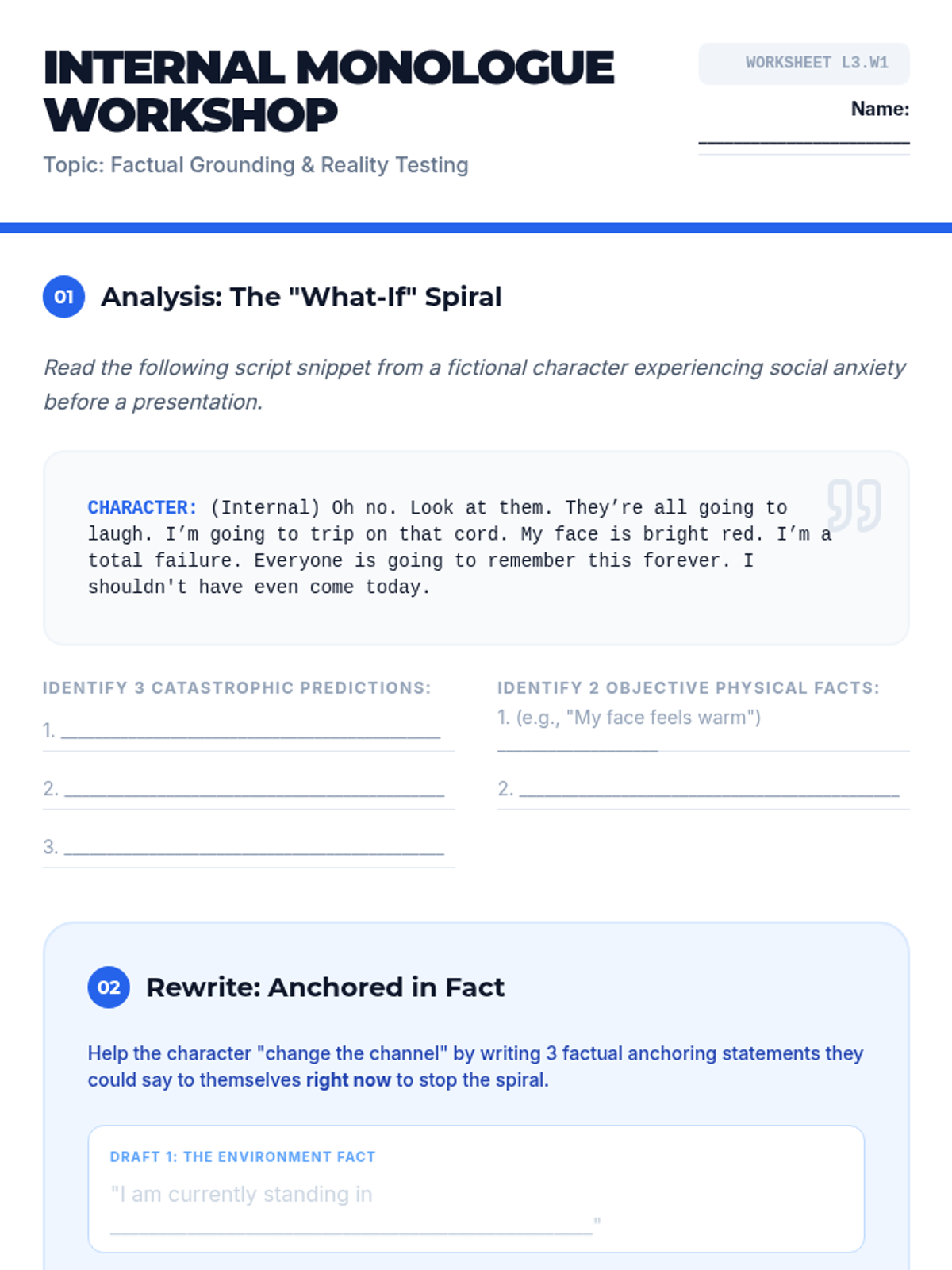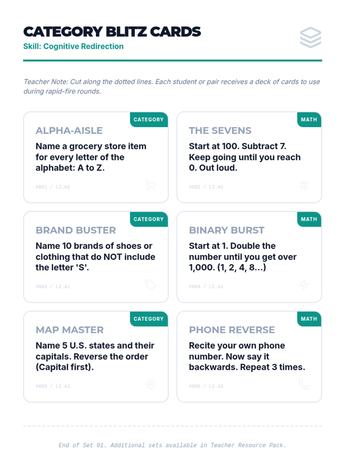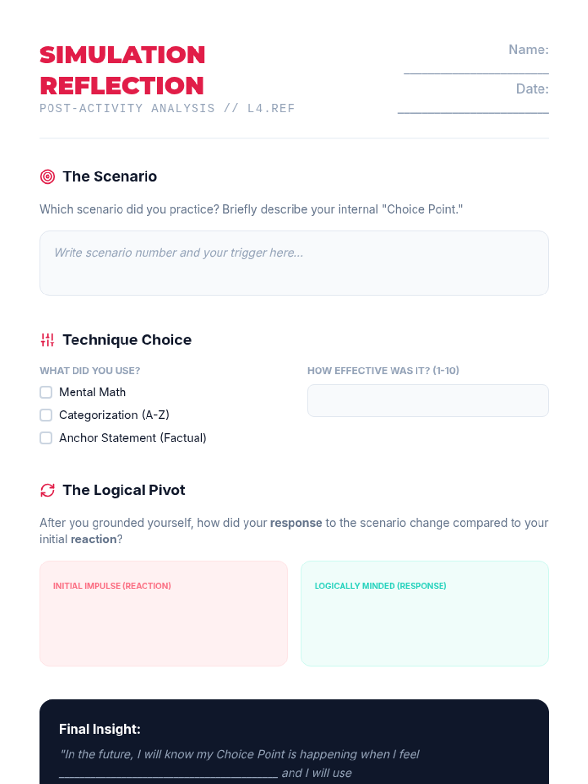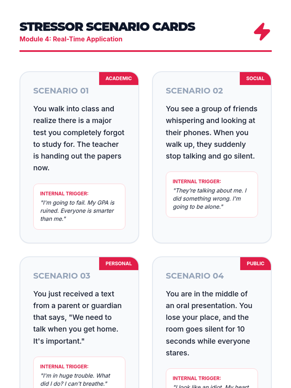 This 5-lesson sequence for 10th-grade students explores cognitive distraction and mental reframing as grounding techniques. Students learn the science behind 'cognitive looping,' practice mental games and math to re-engage the prefrontal cortex, construct factual anchoring statements, and apply these skills in simulated stressors and case studies to regain emotional control.