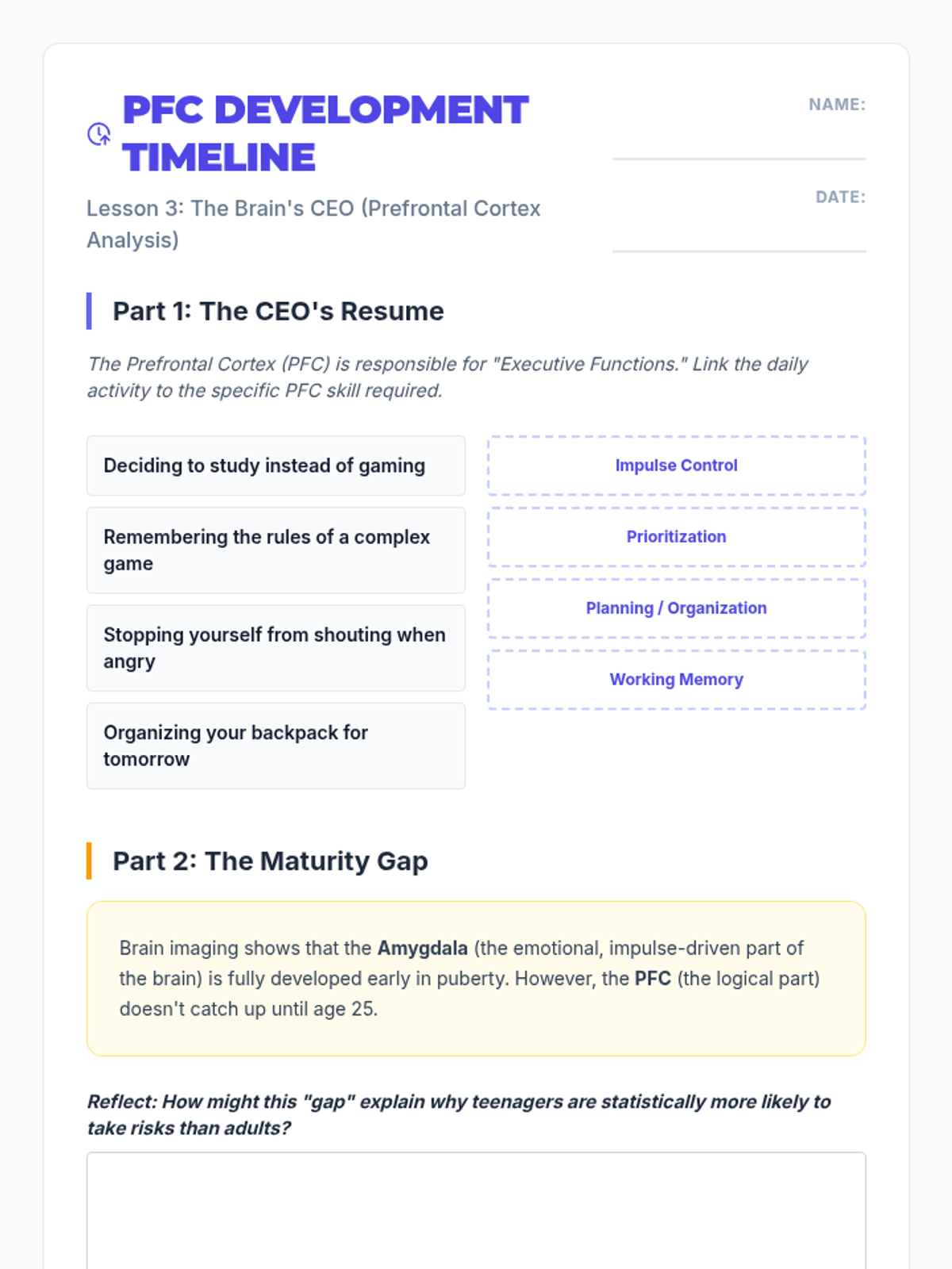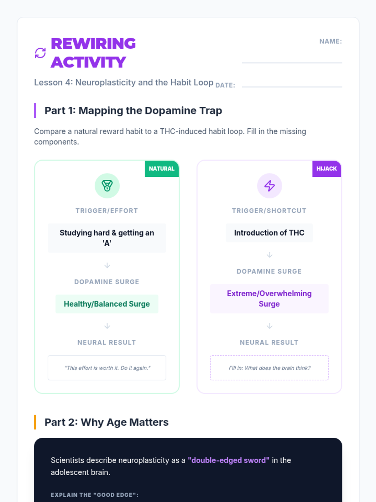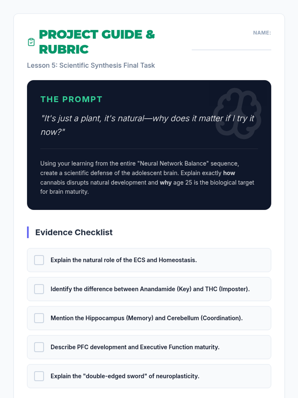 This sequence explores the biological interaction between cannabis and the adolescent brain, focusing on the endocannabinoid system, the prefrontal cortex, and neuroplasticity. Students move from understanding natural homeostasis to analyzing the scientific risks of substance use during critical developmental windows.