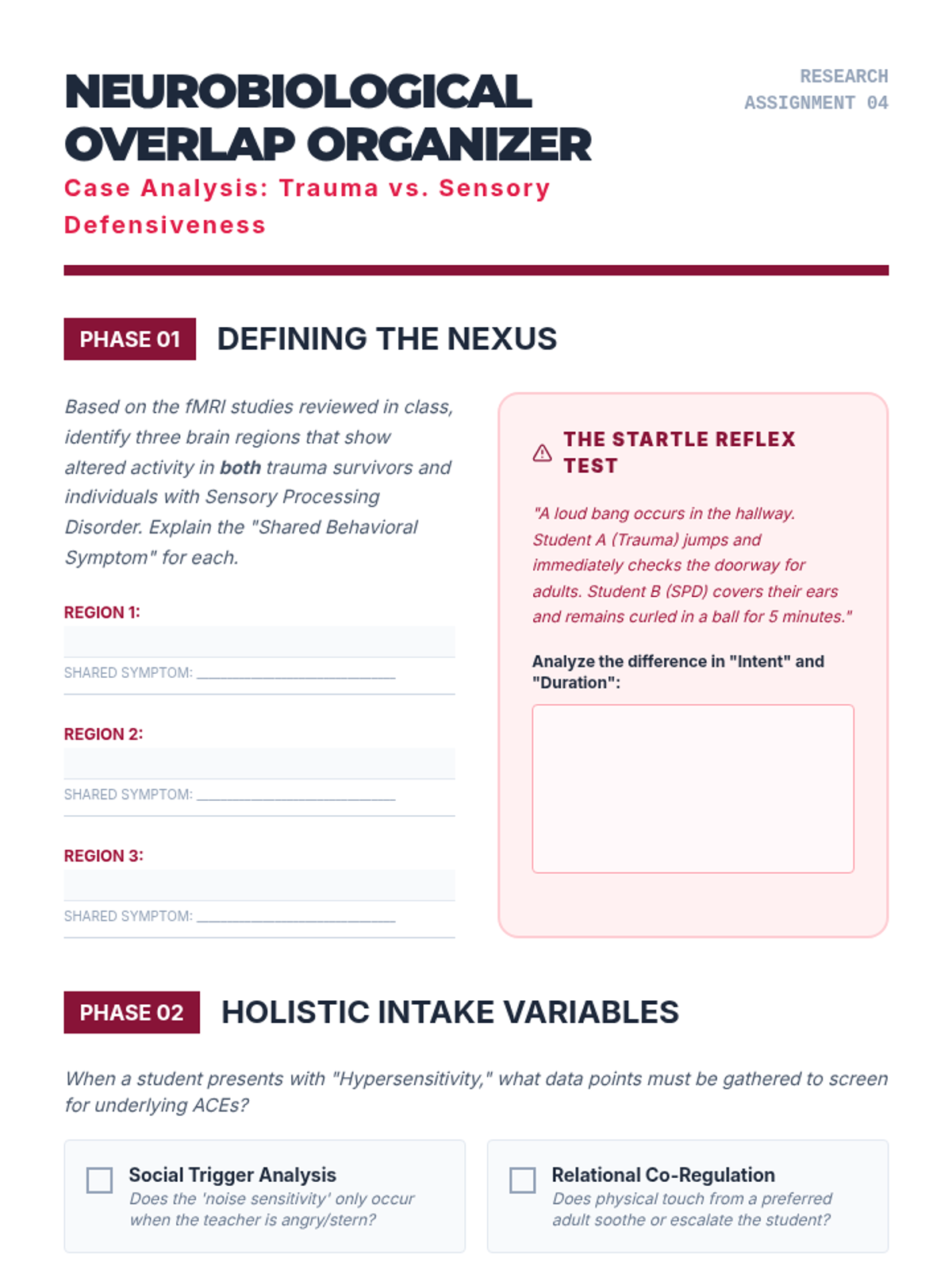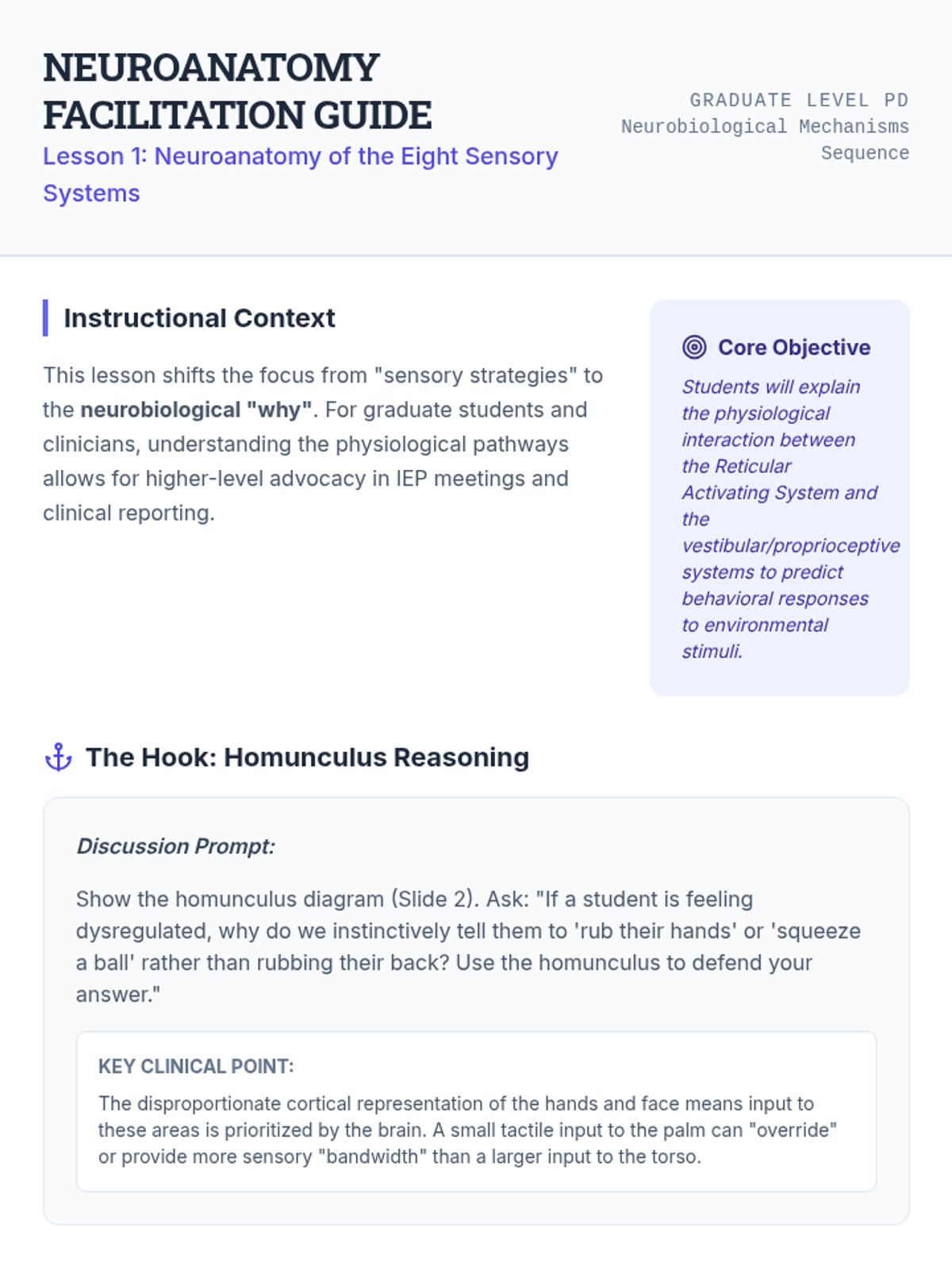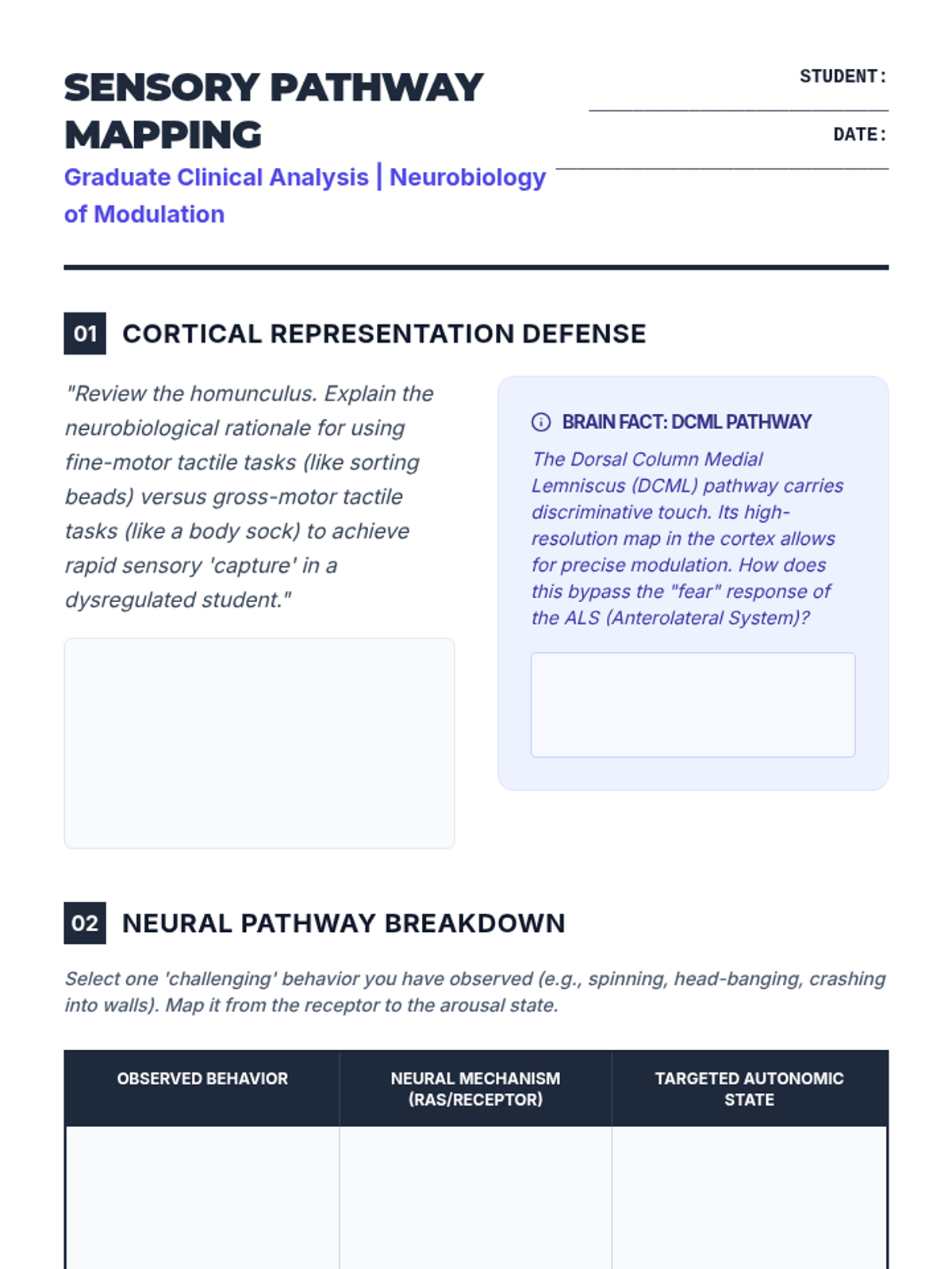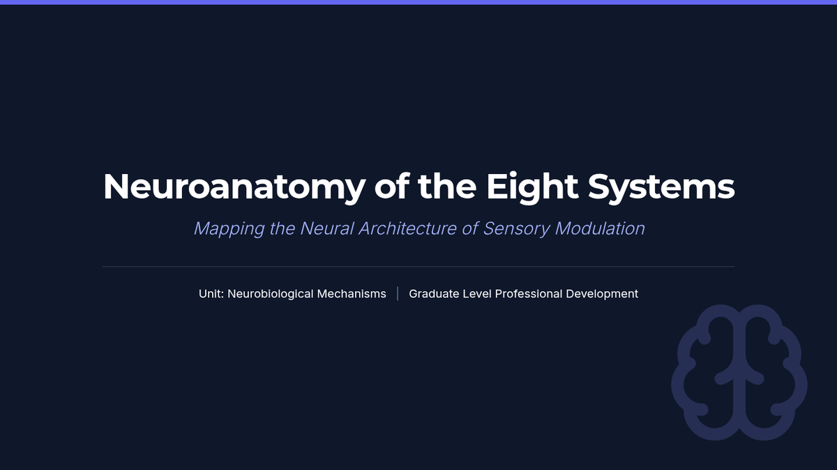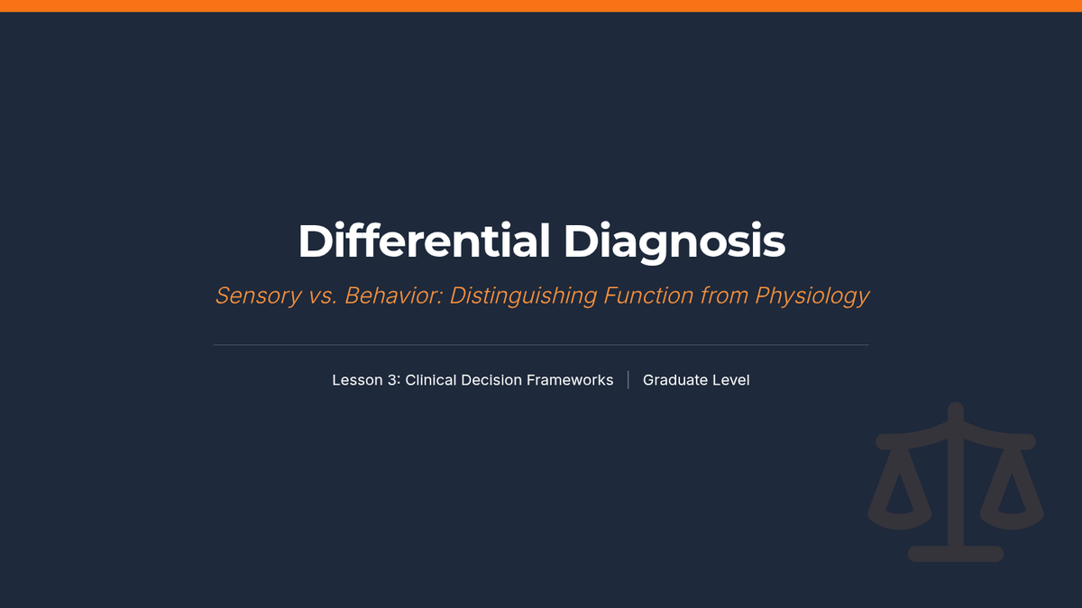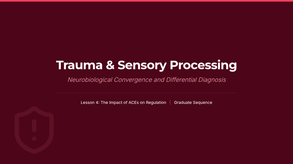 This graduate-level sequence explores the neurobiological foundations of sensory processing, distinguishing between sensory modulation challenges, trauma responses, and learned behaviors. Students analyze the eight sensory systems, specifically interoception, to develop clinical reasoning skills for differential diagnosis and educational advocacy.