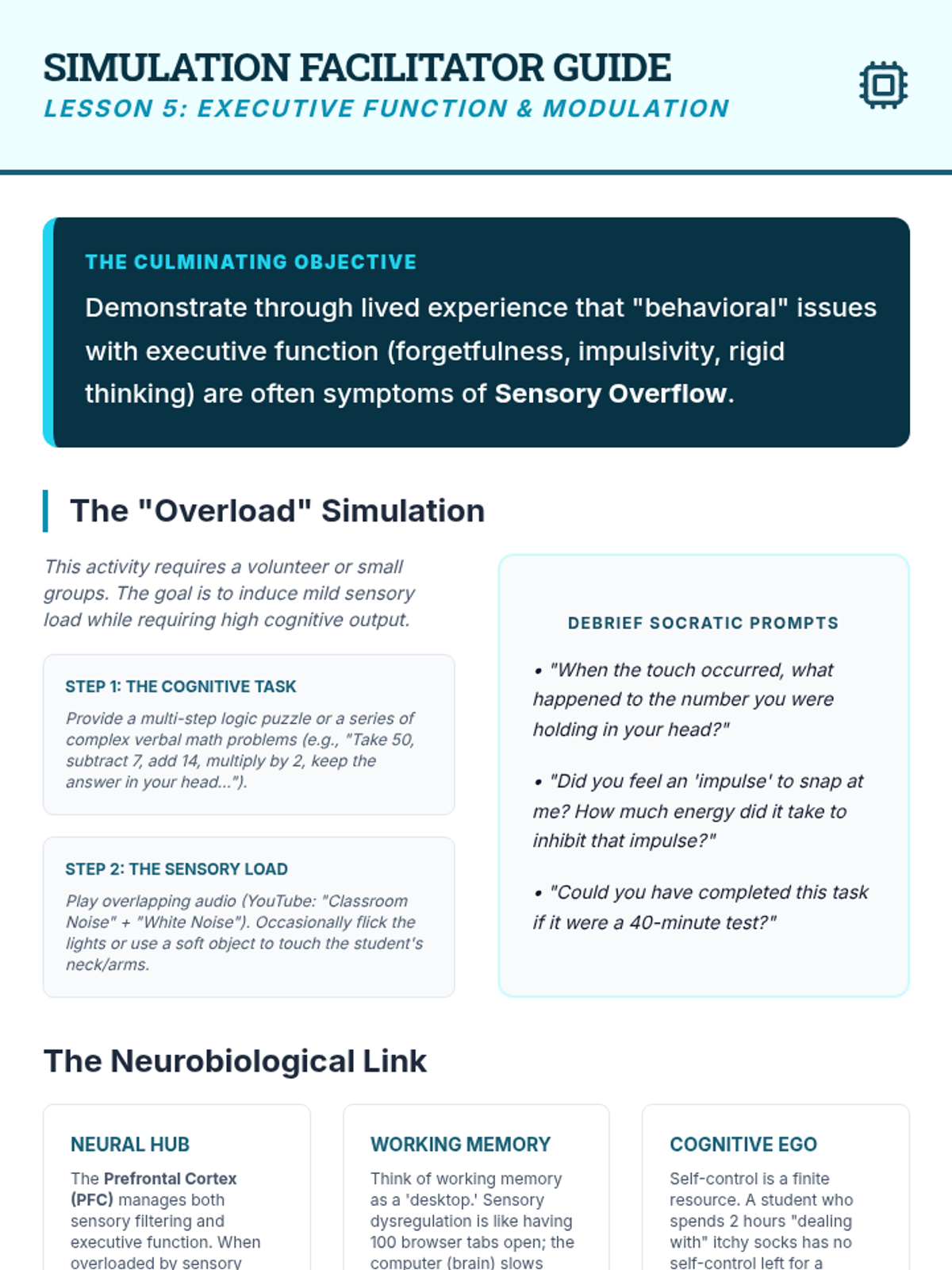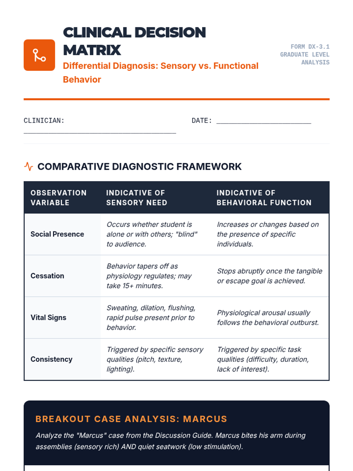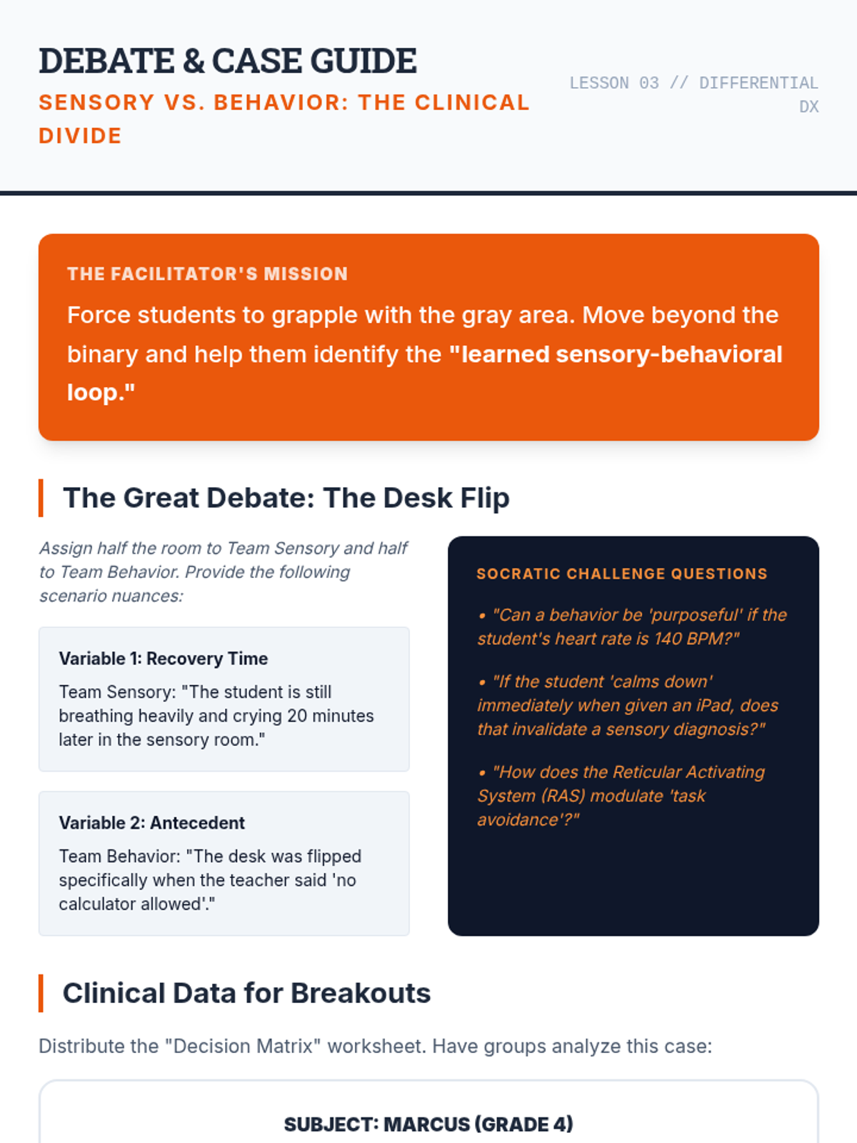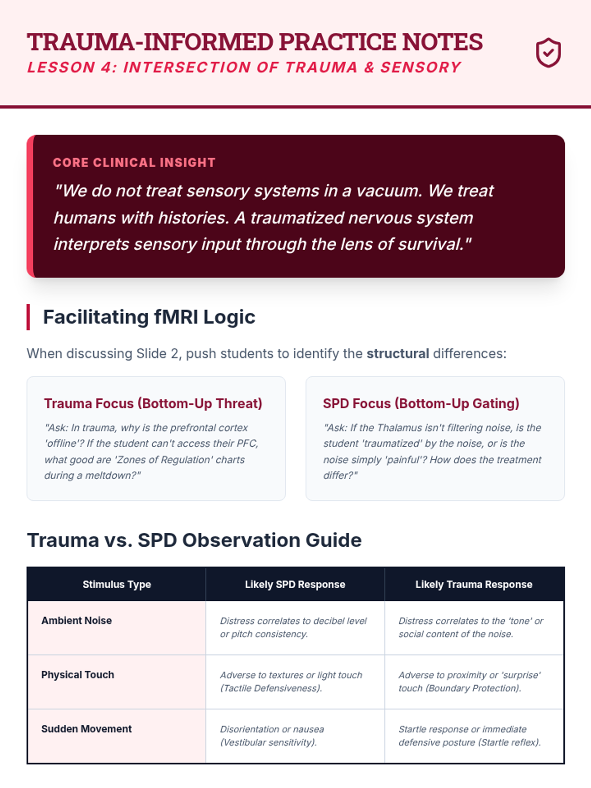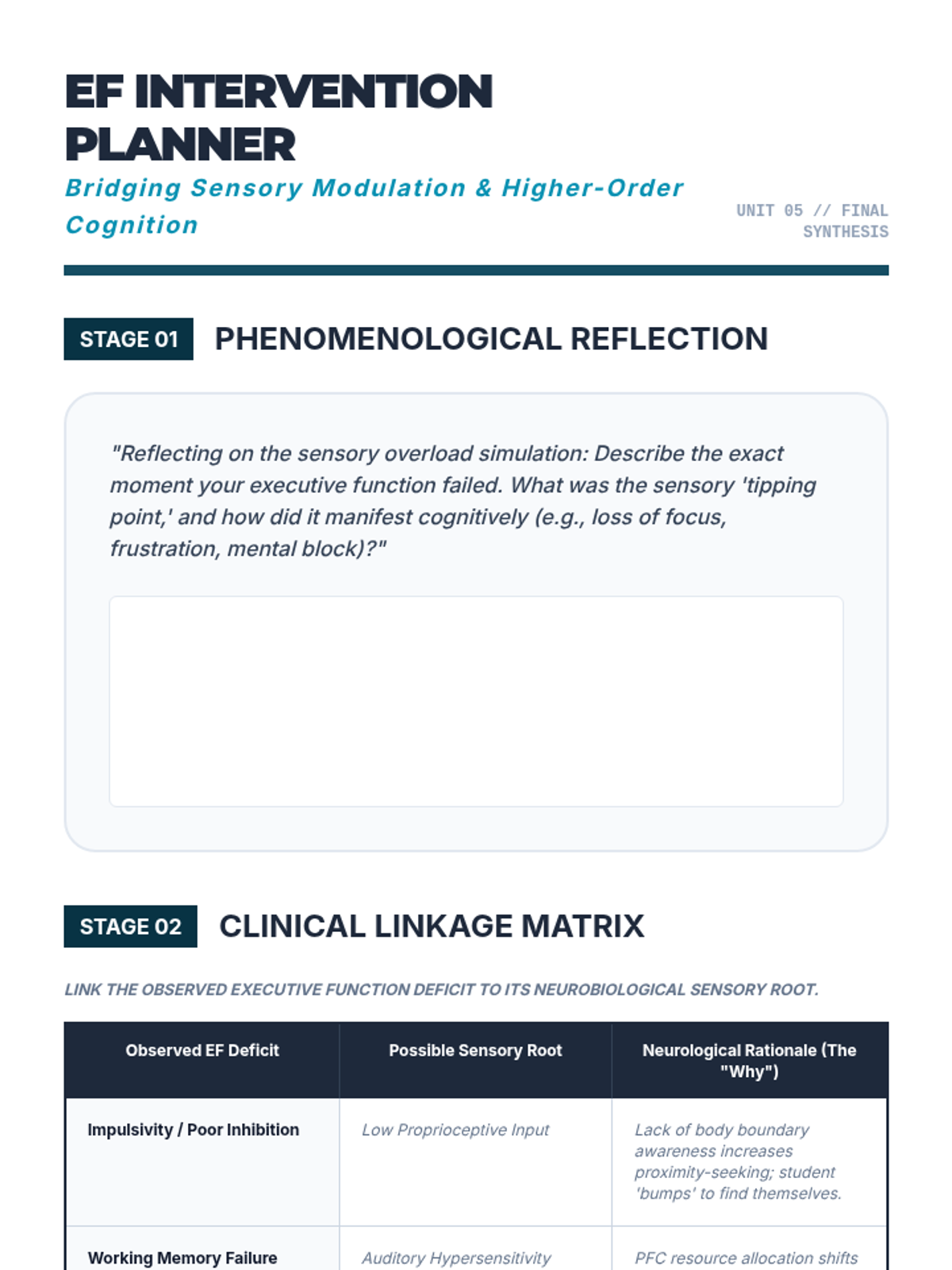 This graduate-level sequence explores the neurobiological foundations of sensory processing, distinguishing between sensory modulation challenges, trauma responses, and learned behaviors. Students analyze the eight sensory systems, specifically interoception, to develop clinical reasoning skills for differential diagnosis and educational advocacy.