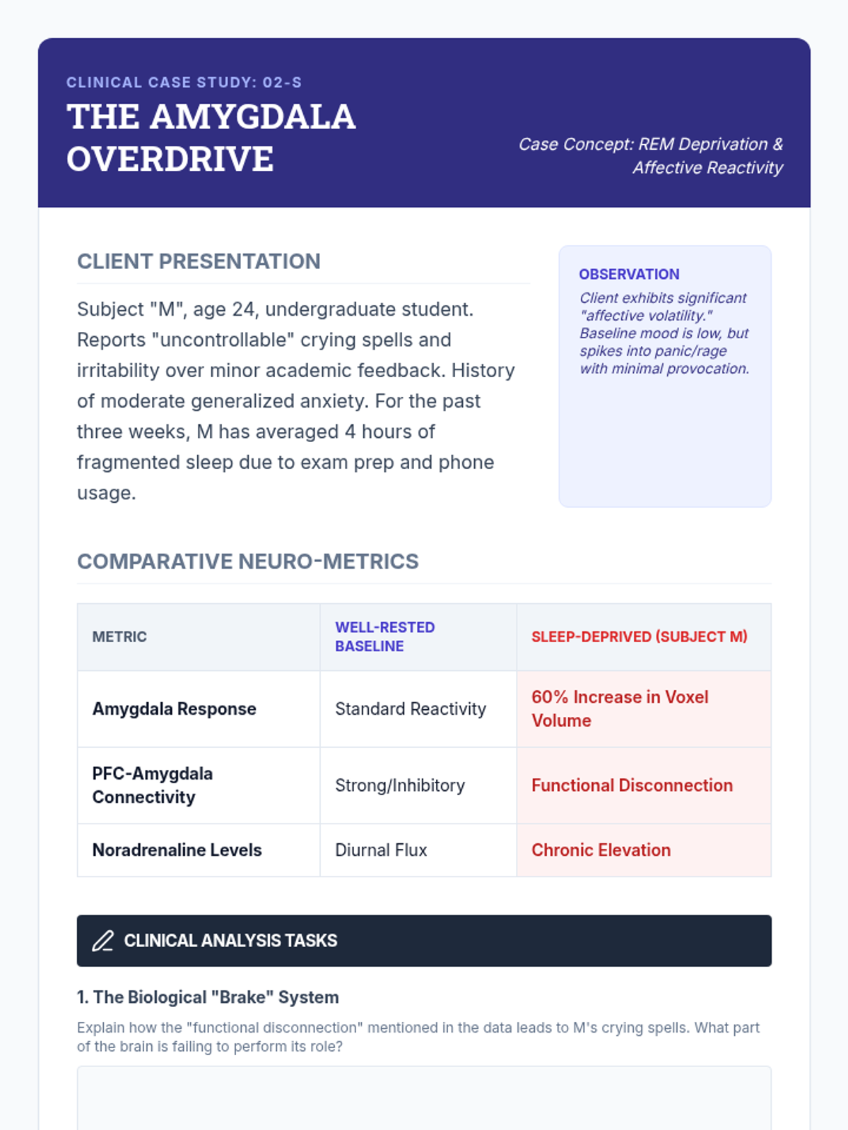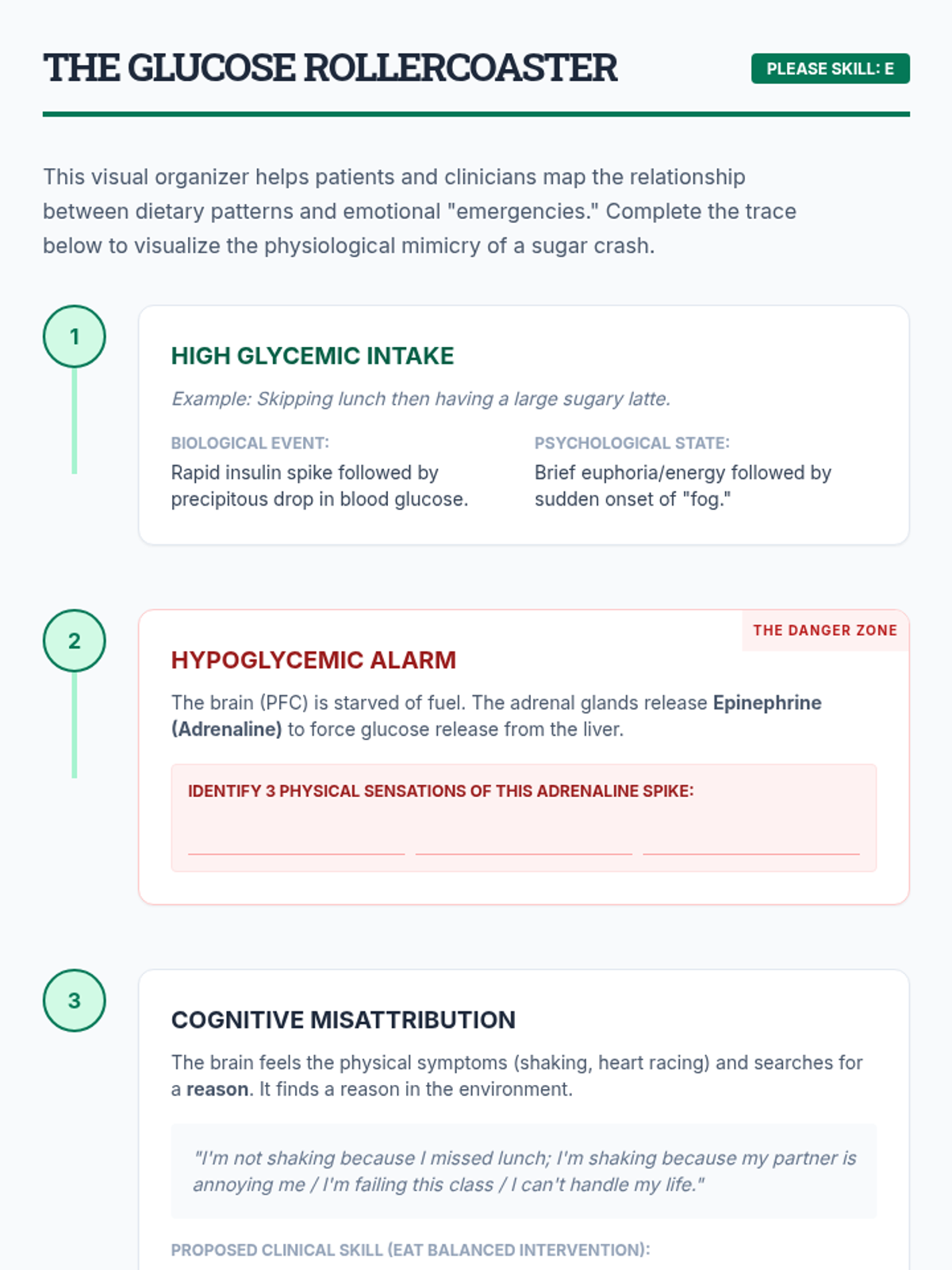 This sequence explores the physiological foundations of the DBT 'PLEASE' skills. Students investigate the neurobiological mechanisms through which physical health impacts emotional regulation, focusing on sleep, nutrition, and exercise.