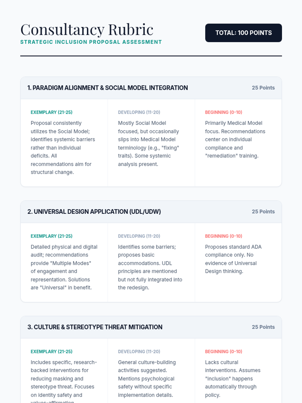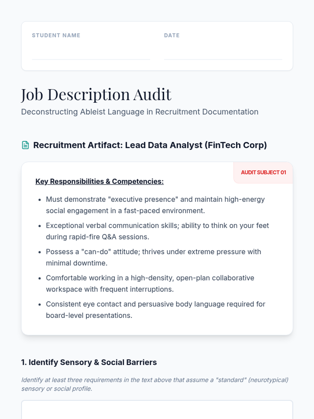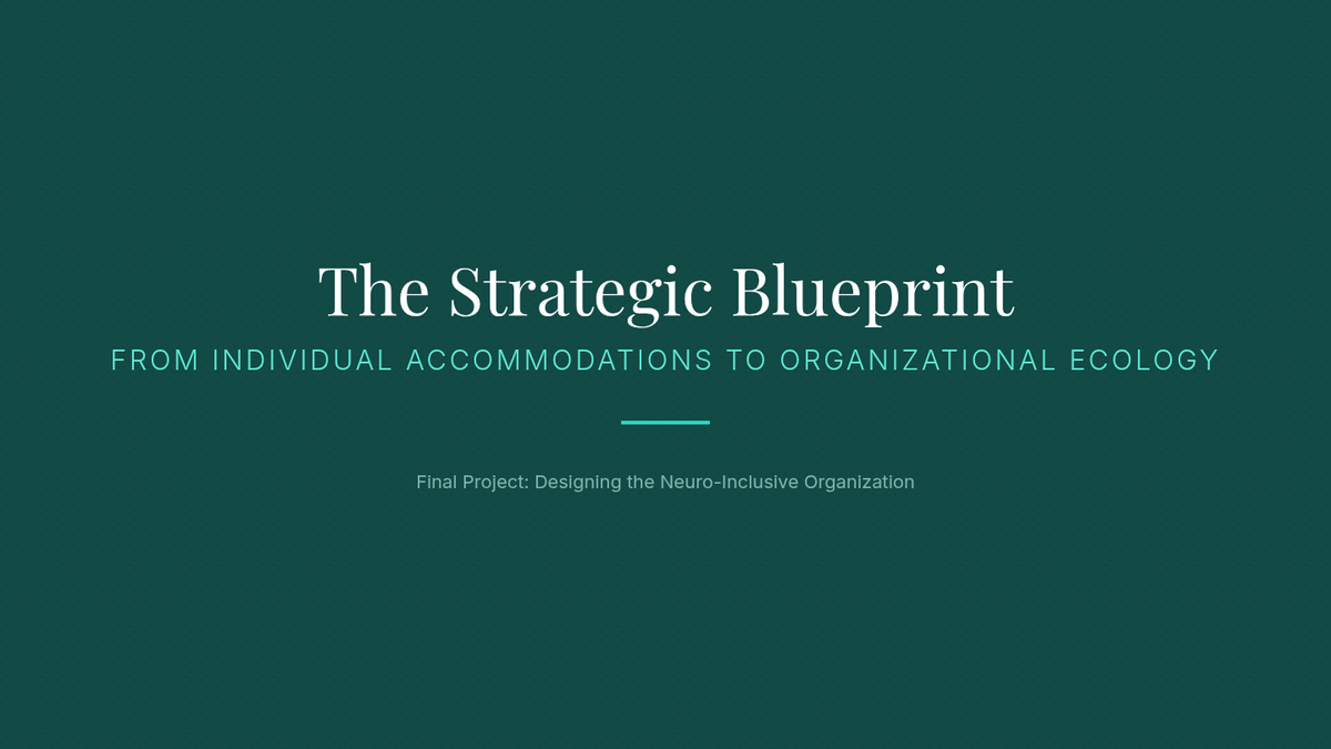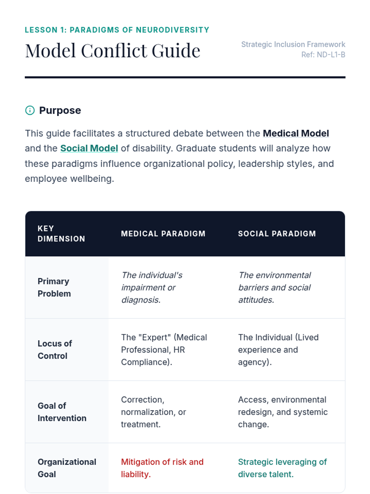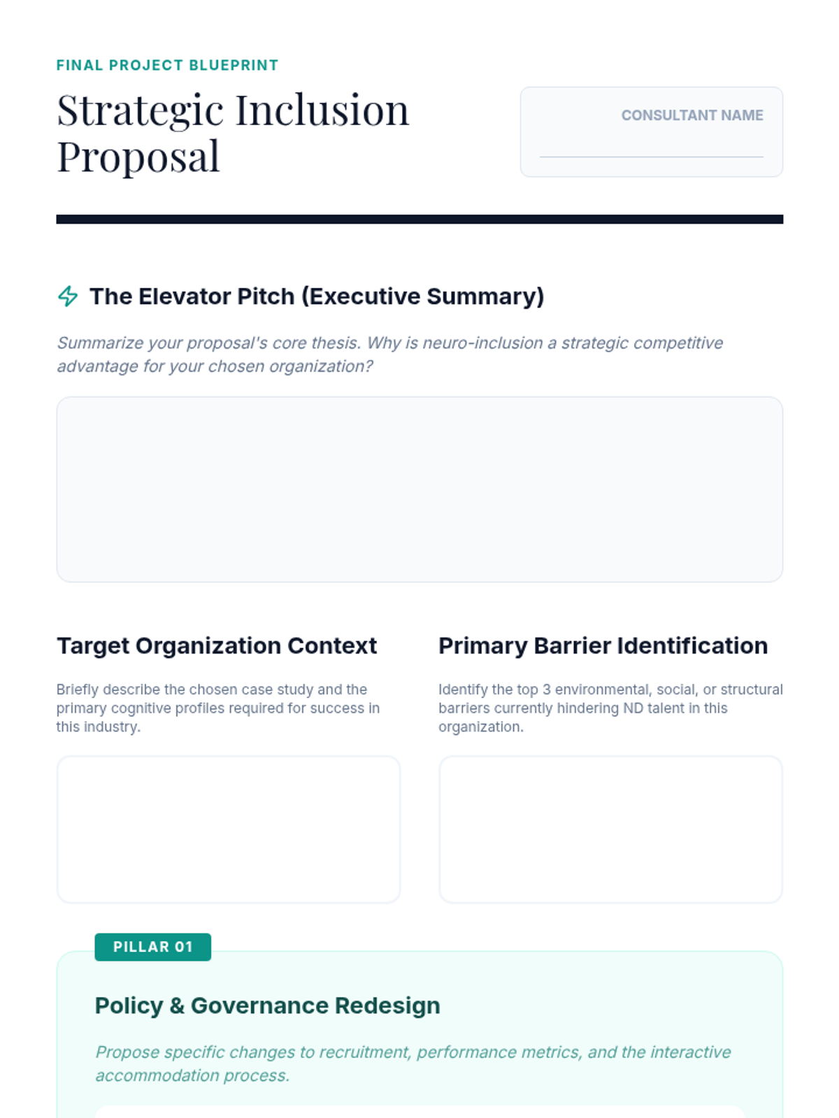 This graduate-level sequence prepares future organizational leaders to transition from medical-model compliance to a neurodiversity-paradigm approach. Students explore the socio-political models of disability, audit environments for sensory and social barriers, and design strategic inclusion proposals that leverage neurocognitive differences as a competitive advantage.