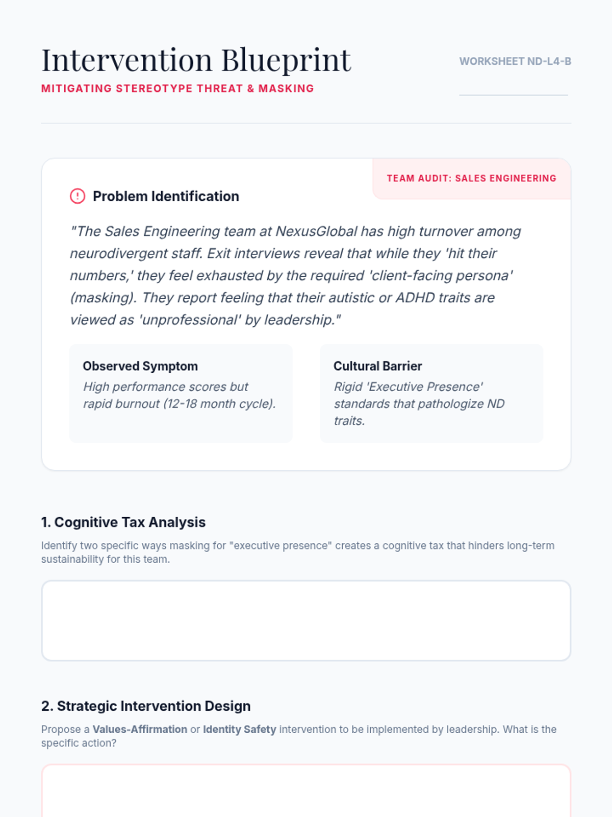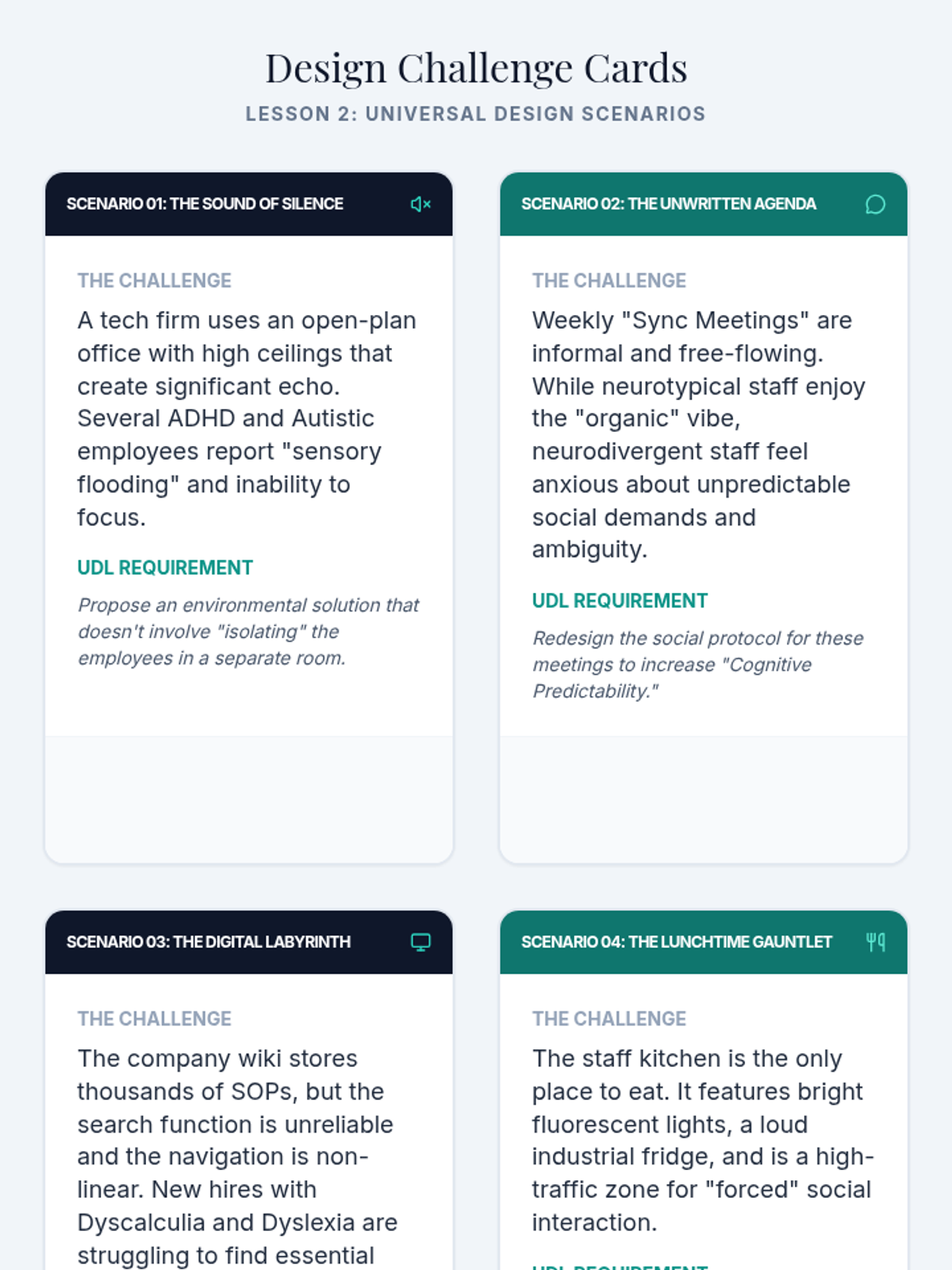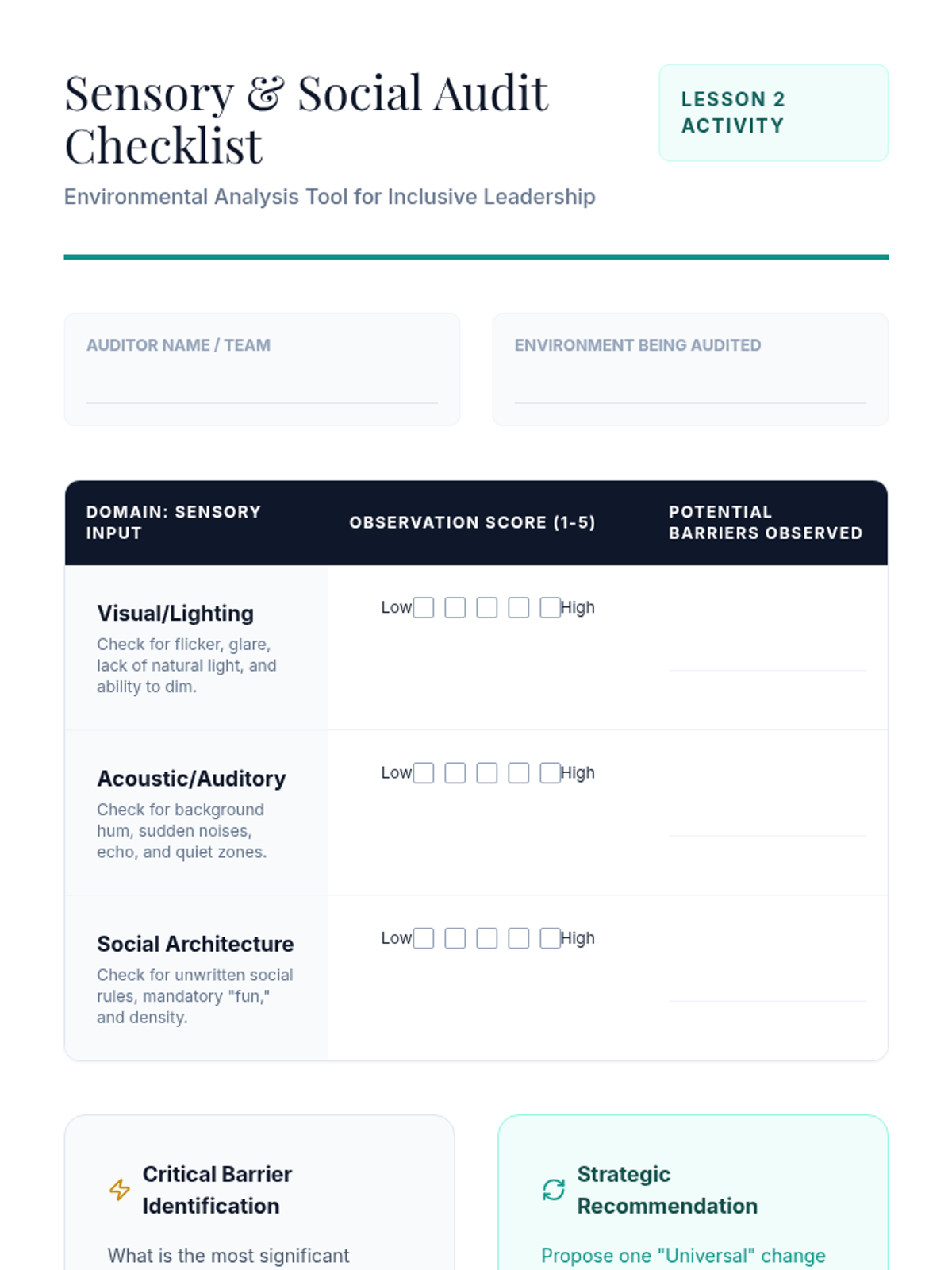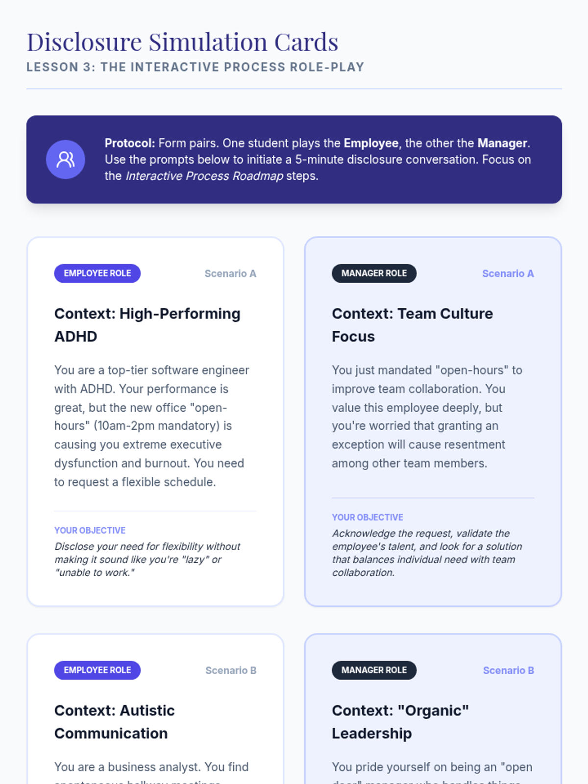 This graduate-level sequence prepares future organizational leaders to transition from medical-model compliance to a neurodiversity-paradigm approach. Students explore the socio-political models of disability, audit environments for sensory and social barriers, and design strategic inclusion proposals that leverage neurocognitive differences as a competitive advantage.