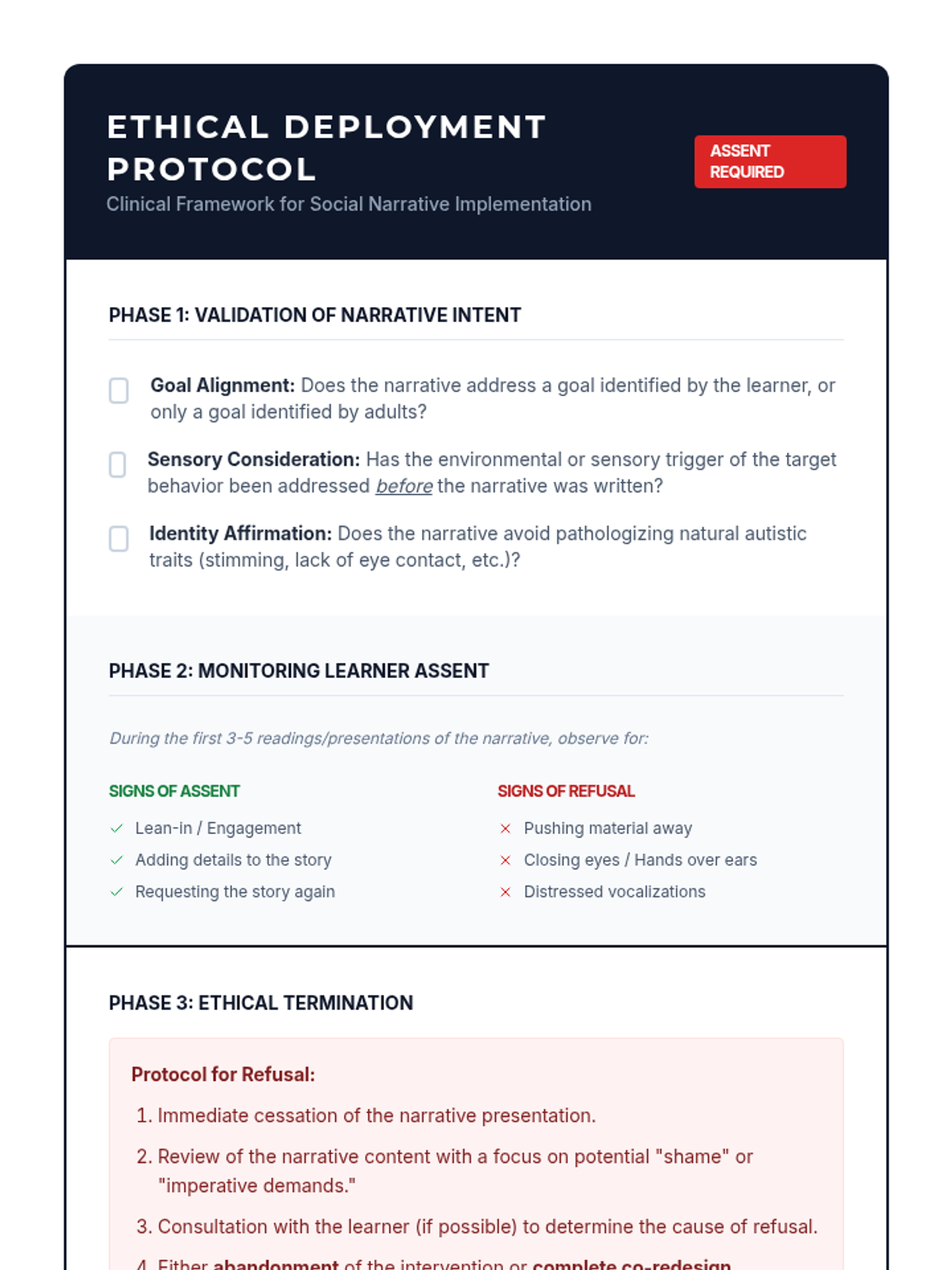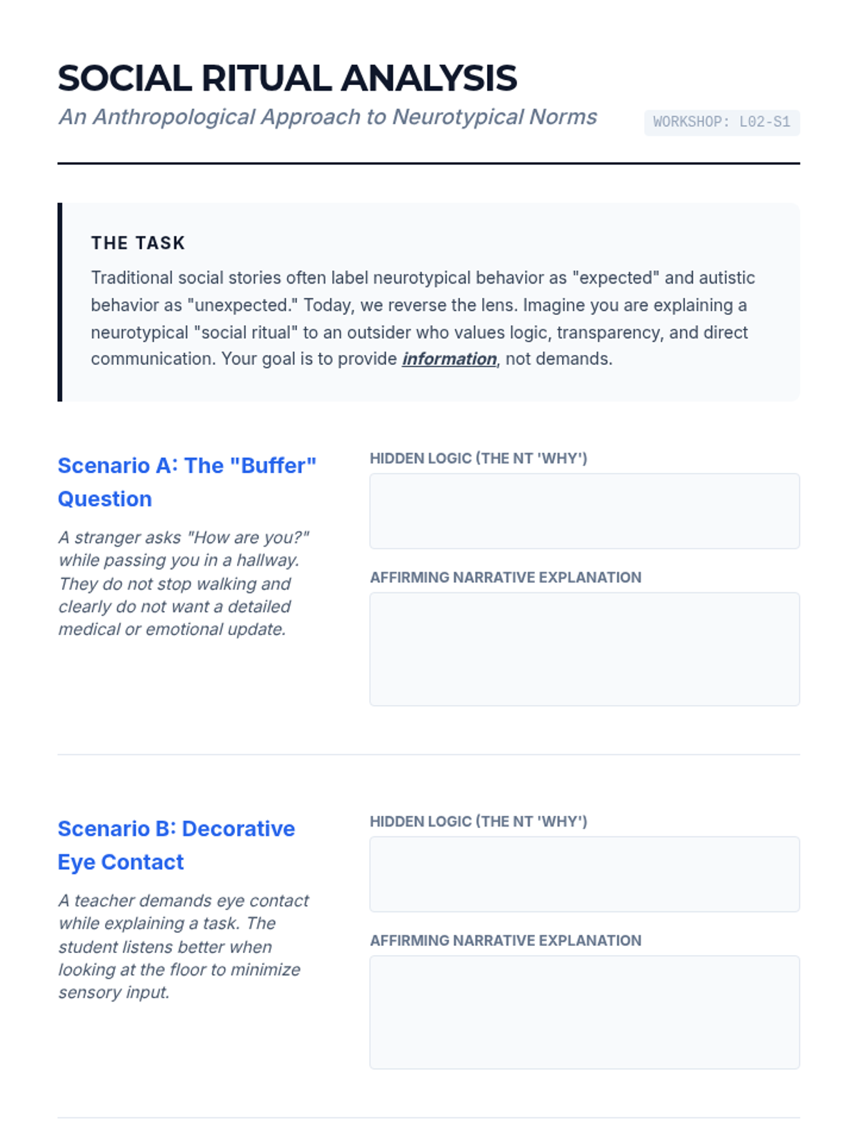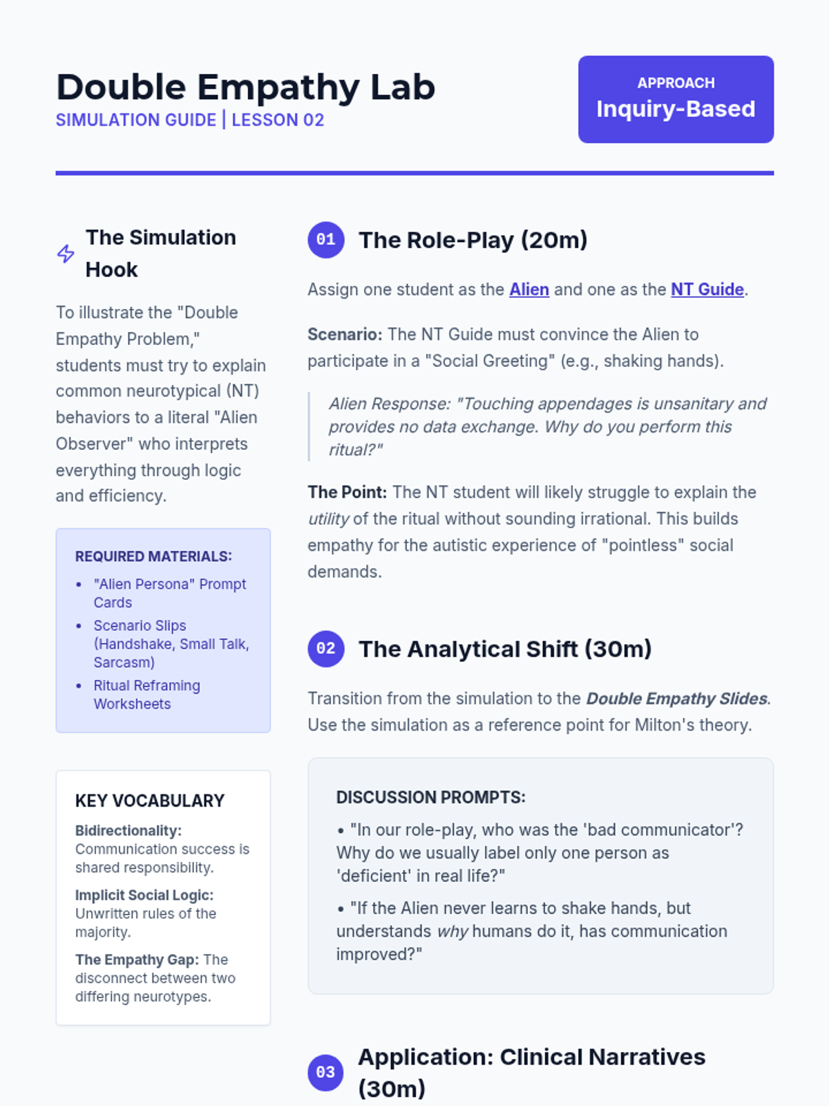 This graduate-level sequence critiques traditional Social Story interventions through the lens of the neurodiversity movement, focusing on ethical adaptation, declarative language, and the Double Empathy Problem. Students move from critical theory to clinical application, learning to co-create narratives that affirm autistic identity rather than enforcing compliance.